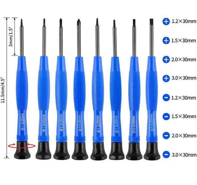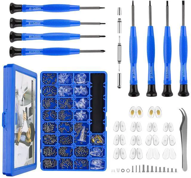 Our eye glass repairing kit includes 4pcs Phillips and 4pcs Flathead screwdriver, which are PH0000/1.2, PH000/1.5, PH00/2.0, PH0/3.0 Phillips screwdriver set and 1.2mm, 1.5mm, 2.0mm, 3.0mm Flathead screwdriver set.