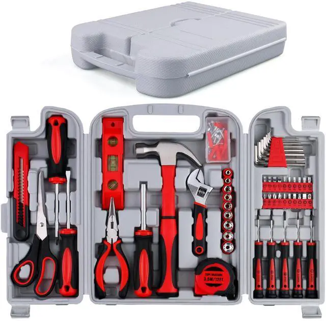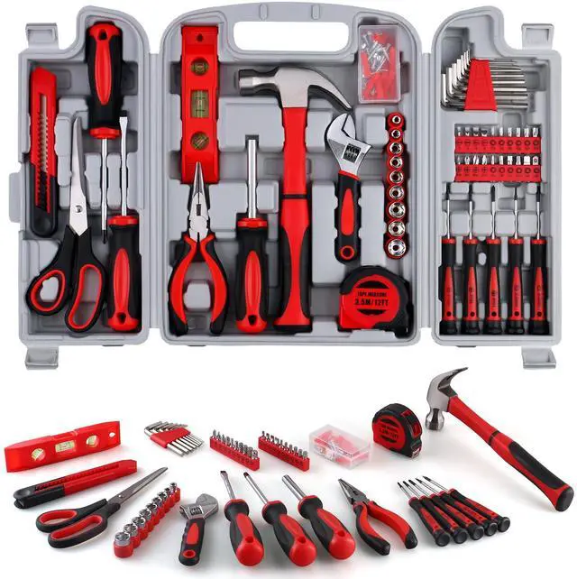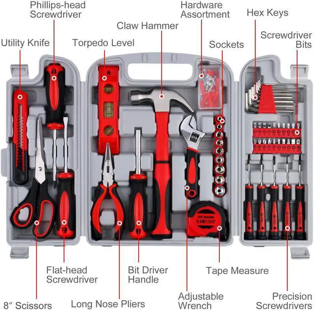 • Complete Tool Coverage - Include all the essential tools that you need for your home such as adjustable wrench, hammer, pliers, screwdrivers, precision drivers, bits, sockets, hex keys, tape measure, level, utility knife, scissors, and fasteners kit