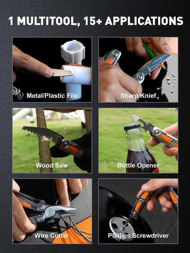• 14-in-1 All-in-One Design: This versatile, self-locking pliers combines 14 tools like flat-nose pliers, a serrated knife, wood saw, and screwdrivers. Your compact solution for DIY, camping, and daily tasks, it replaces a full toolbox