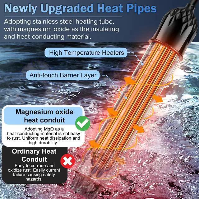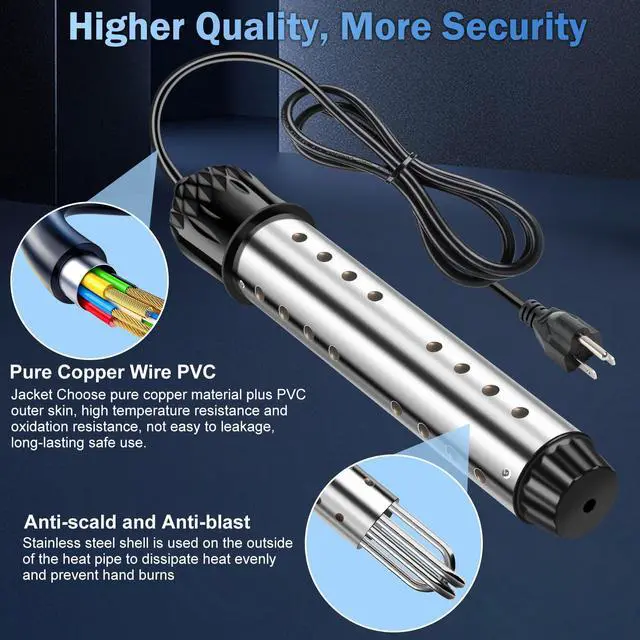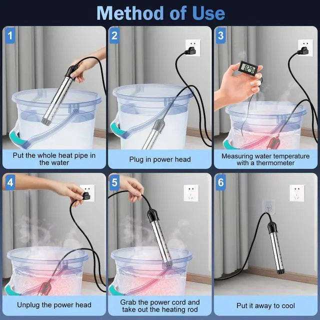 Never touch the water when the heater is working. Unplug it first, take it out, then you can touch the water. To check the water temperature during heating, use the included thermometer.