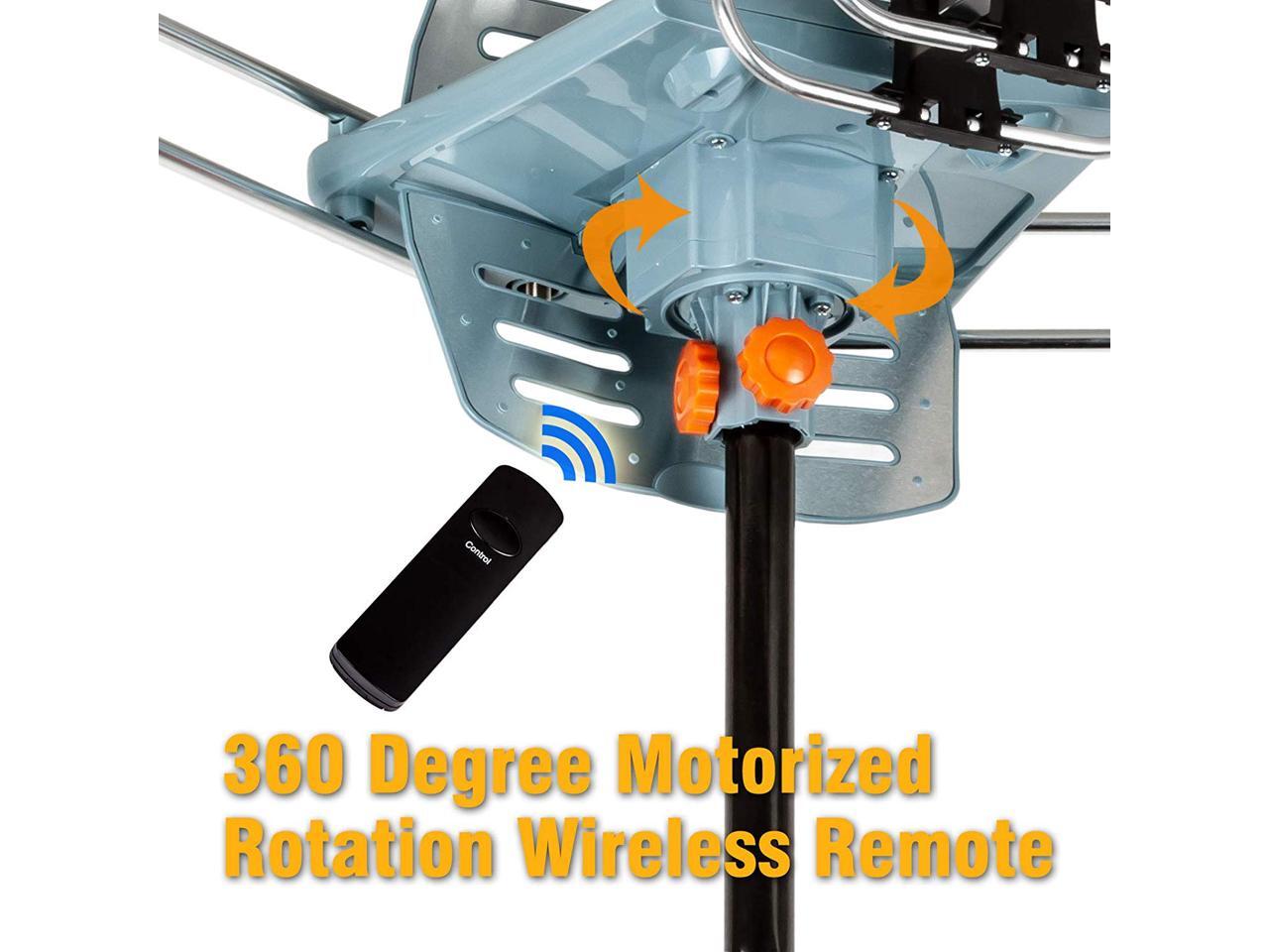 - [360-degree Rotation motor] Built-in Super High Gain and Low Noise Amplifier. LET filter helps remove the interference caused by 4G phone signal. Ensure noise-free digital TV reception. Remote control with the rotation button.