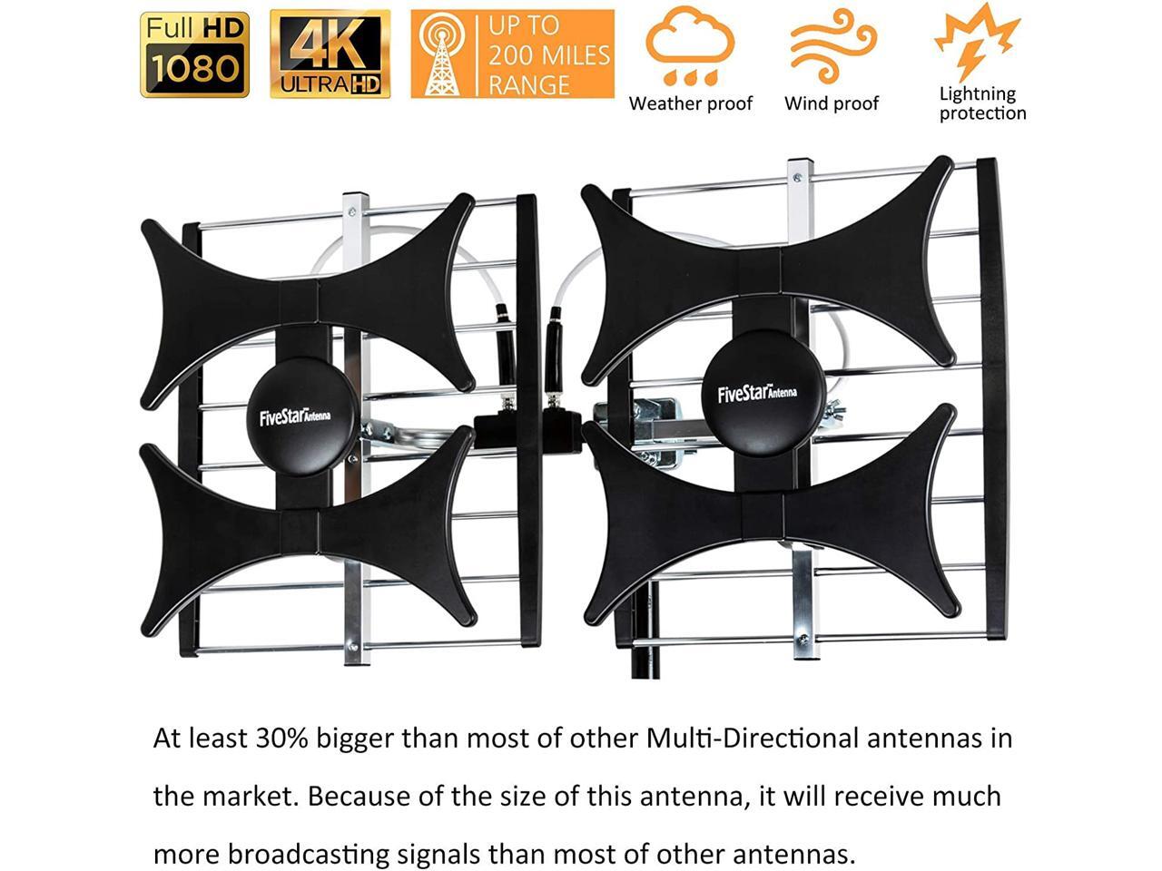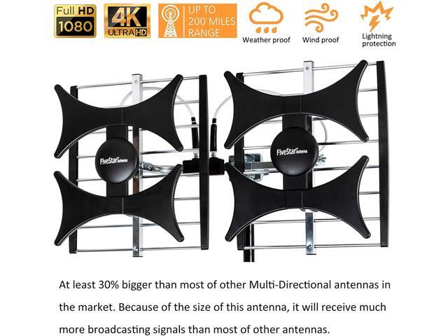 [Newest 2021] Five Star Multi-Directional 4V HDTV Antenna - up to 200 Mile Range for Smart TV, UHF/VHF, Indoor, Attic, Outdoor, 4K Ready 1080P FM Radio w/ 40ft RG6 coaxial Cable Mounting Pole (No Kit)