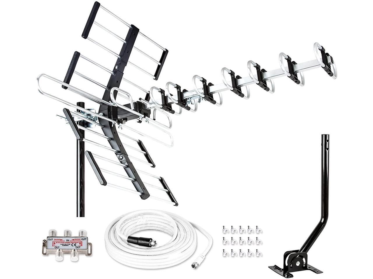 - [SAVE NOW AND ENJOY FREE CHANNELS] Package included: Antenna, Mounting bracket, J-pole, TV splitter along with simple to follow instructions on assembly. Freely mount our Five Star antenna with pole on roof, attic, chimney, eave, mast