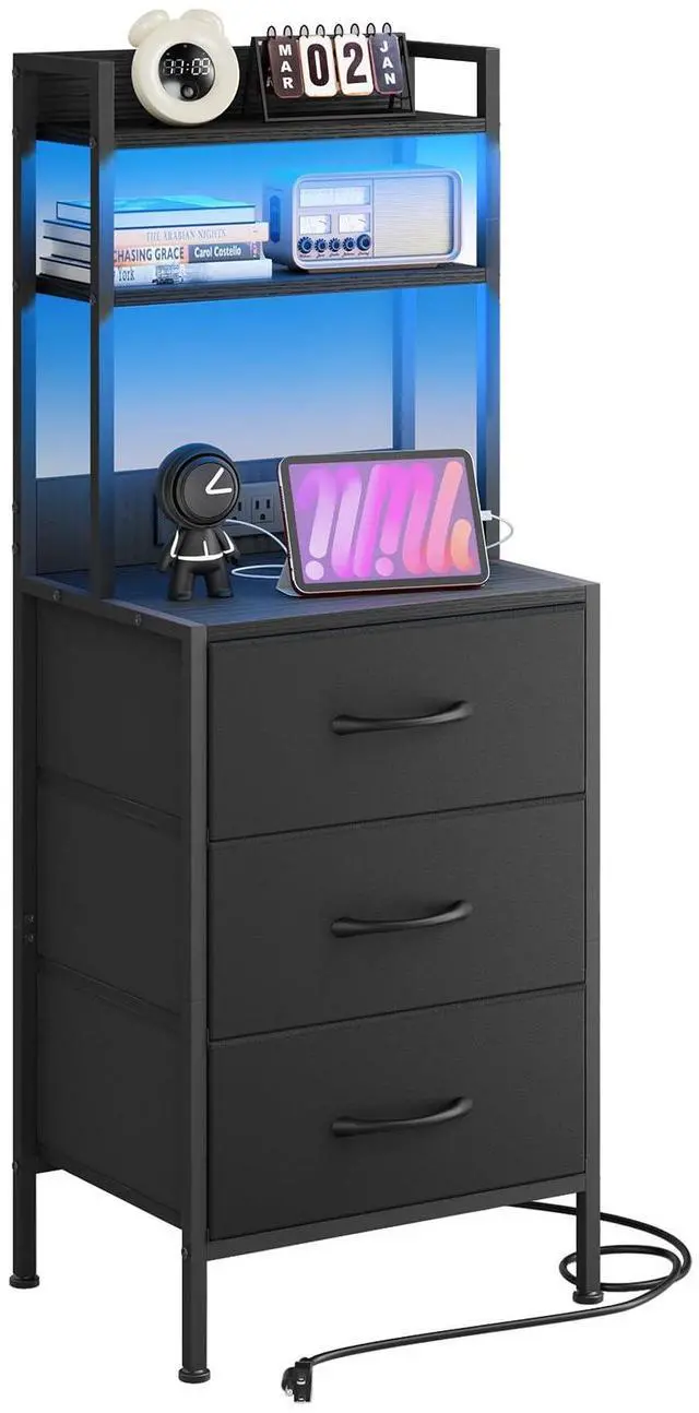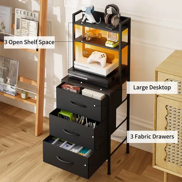 41 Inch Tall Nightstand with Charging Station, 3 Fabric Storage Drawers and Shelves, Led Night Stand with U-S-B Port & Socket, Bedroom Dorm Office, Bedside Table & Bookshelf in One, Black