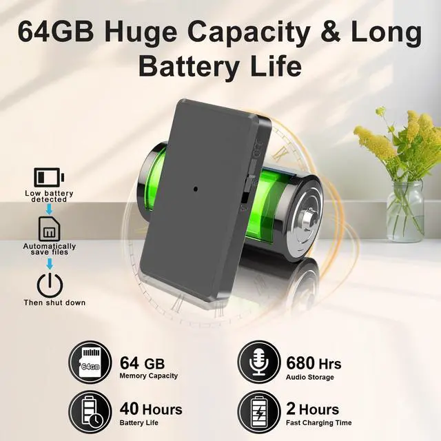 | Specifications | Brand: FJJVFF, Format: wav, Battery_weight: 5 grams, Battery_average_life: 40 hours, Battery_cell_composition: lithium_polymer, Skip_offer: false, Item_weight: 0.04 pounds, Part_number: L2, Unspsc_code: 52161535, Manufacturer: FJJVFF, Model_number: L2, Num_batteries_type: a, Num_batteries_quantity: 1, Control_method: push_button, Headphones_jack: USB Type C, Item_dimensions: 2.24 L x 1.26 W x 0.4 H inches, Lithium_battery_packaging: batteries_contained_in_equipment, Lithium_battery_energy_content: 500 milliampere_hour, Number_of_items: 1, Batteries_included: true, Batteries_required: true, Compatible_devices_0: Earphone, Compatible_devices_1: Smartphone, Compatible_devices_2: Personal Computer, Compatible_devices_3: MP3 Player, Compatible_devices_4: Laptop, Hardware_interface: usb_c, Included_components: Voice Activated Recorder, User Manual, Earphones, Charging/Data Cable, Black Lanyard, Reset Pin, Item_package_weight: 0.091 kilograms, Warranty_description: 2 Year Warranty, Microphone_form_factor: Built-In, Item_depth_width_height_depth: 2.24 inches, Item_depth_width_height_width: 1.26 inches, Item_depth_width_height_height: 0.4 inches, Item_package_dimensions: 4.318 L x 7.366 W x 10.287 H centimeters, Memory_storage_capacity: 64 GB, Contains_battery_or_cell: battery, Product_site_launch_date: 2026-03-07T04:25:39.59Z, Microphone_operation_mode: Stereo, Number_of_lithium_ion_cells: 1, Includes_rechargable_battery: true, Battery_installation_device_type: not_installed, Supplier_declared_dg_hz_regulation: not_applicable, Has_multiple_battery_powered_components: false |