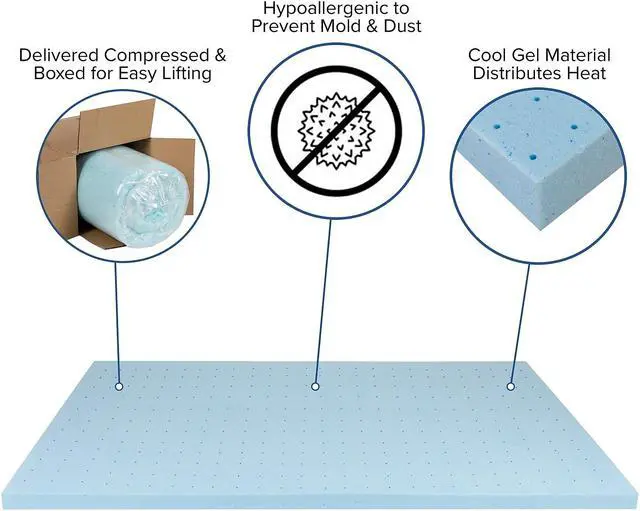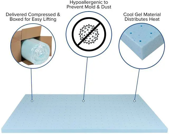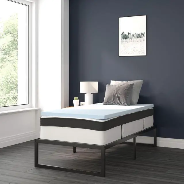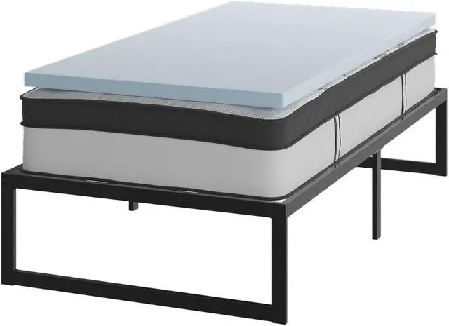 A great night's sleep should never be taken for granted and this bundled set including a 14 inch bed frame, 12 inch mattress and 2 inch memory foam mattress topper can be yours with the click of a button. Bedroom furniture is an investment so durability is always at the top of the must have list. This bed frame foundation with included mattress and memory foam topper features a 14" freestanding metal platform bed frame offering 12.5 inches of clearance for storage and ease of cleaning. Constructed from 19 gauge solid steel with reinforced metal screw construction this frame will hold up to 650 pounds. Solid steel slats hold the included 12" foam and pocket spring mattress and 2" memory foam topper without sagging and does not require a box spring. The lack of a headboard or footboard streamlines any sleep space and will lend vertical real estate to smaller bedrooms. This complete bed set bundle gives you an unparalleled sleeping experience. This medium-firm foam and pocket spring mattress features individually wrapped pocket spring coils for exceptional support and reduced motion transfer alleviating pressure points to help you stay asleep. As if that weren't enough to have you clicking the add to cart button, this bed frame and mattress set comes with a 2" memory foam topper to wrap you in cushioned comfort. The foam is CertiPUR-US Certified so it's free from heavy metals, phthalates, BPDE, formaldehyde and has reduced VOCs. Arriving compressed and boxed for ease of movement, the mattress and topper will fully expand with 48 to 72 hours. Live your best life when you wake up relaxed and refreshed on this 3 piece complete bed set. 14 Inch Twin Metal Platform Bed Frame, Mattress, and 2" Cooling Gel Mattress Topper Bundled Set. No Box Spring Required; Assembles in Less Than 30 Minutes with Included Tools. 12.5 Inch Clearance From The Frame Bottom for Storage. 19 Gauge Solid Steel Construction holds up to 650 Pounds Static Weight; Noise Reducing Felt Pads. 12" CertiPUR-US Certified High Density Foam & Pocket Spring Mattress - Medium Firm Comfort. Tight Top Bed Mattress with 10" Pocket Spring Coils; 6.5 Gauge Springs. 2" Cooling Memory Foam Mattress Topper. Ventilated Design Disperses Body Heat. Compressed and Shipped in a Box; Please allow 48 - 72 hours for complete mattress and topper expansion. Freestanding platform bed foundation bundle with pocket spring mattress and mattress topper ideal for bedrooms and guestrooms.