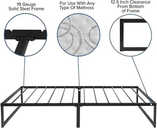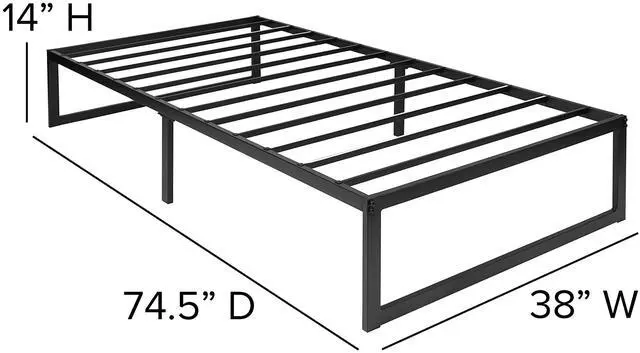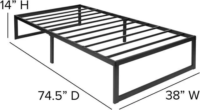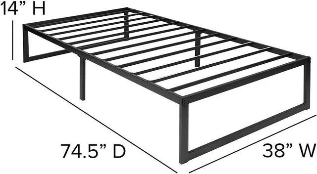 Product Dimensions: 39"W x 75"D x 28"H, Weight: 93lbsLeg: 1.5"Wx14"H. Leg Spacing: 34.75"Wx35.75"L. Siderail: 1.5"Wx0.75"Dx14"H. Fixed Slat: 14"H. Fixed Slat Space Width Fixed: 5.5Number of Slats: 12 Count. Fixed Underbed Height Fixed: 12.5". Metal Gauge Thickness: 19 Gauge. Weight Capacity: 650 lbsColor: Black. Material: Memory Foam. Base Style: RectangularFrame Color: Black. Frame Material: Steel. Style: Modern