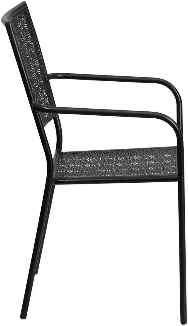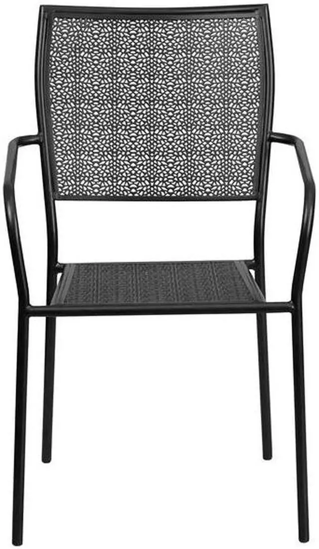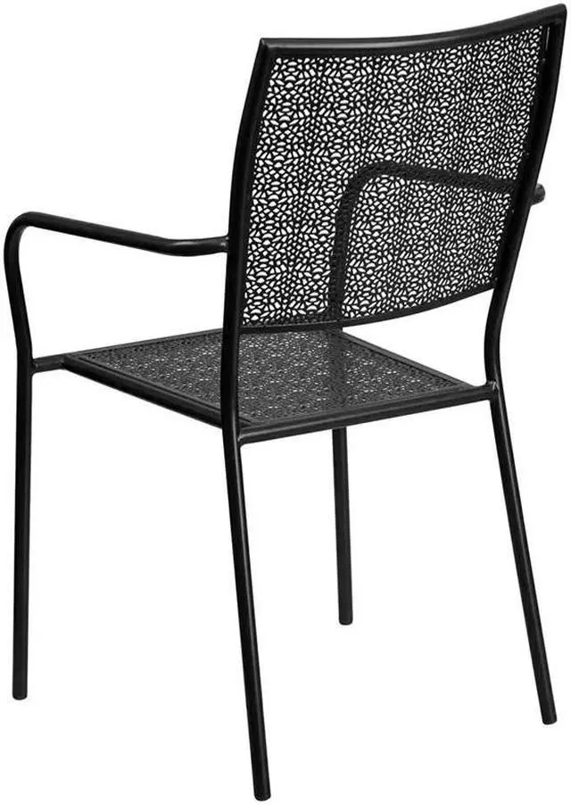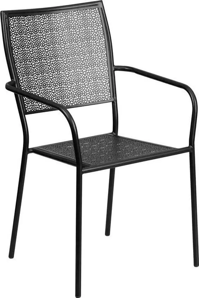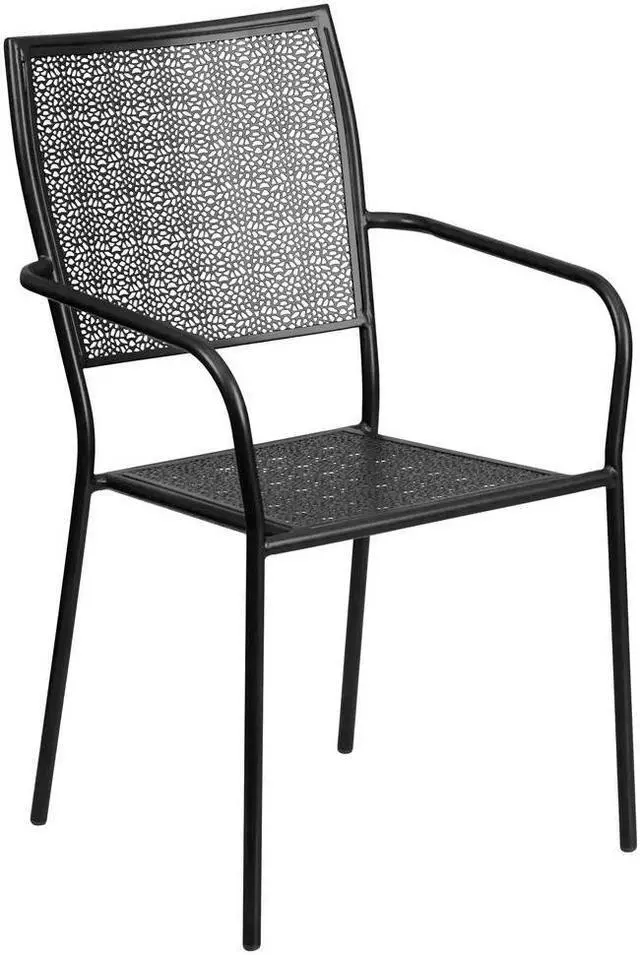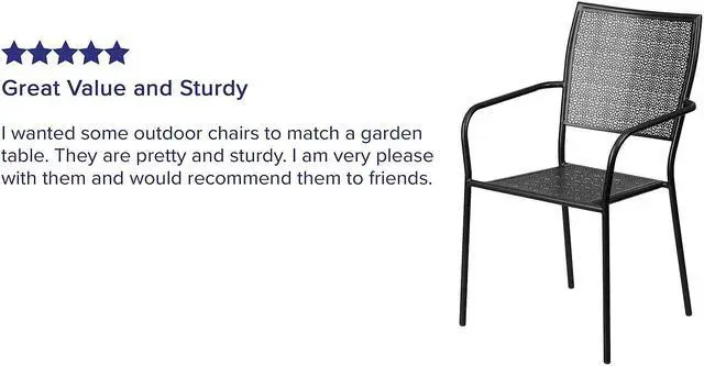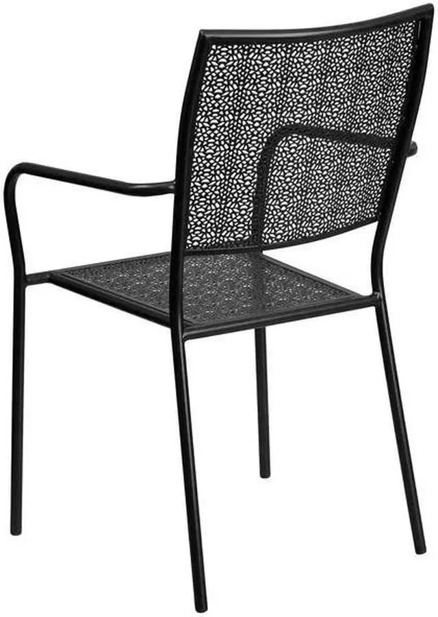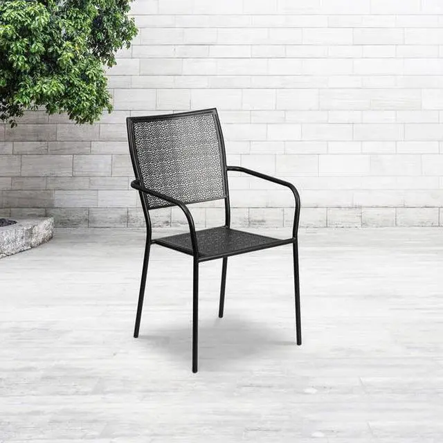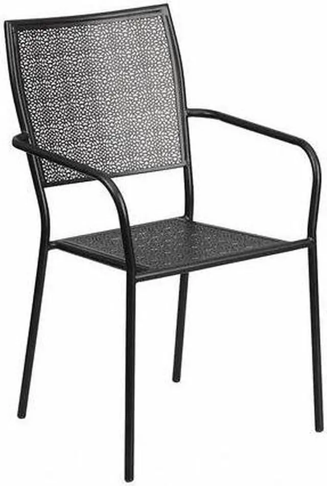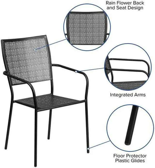Add color to your patio furniture with this black patio chair. People are moving towards colorful outdoor furniture to furnish their outdoor living spaces and you should too. This stackable patio chair is a rare find that is crafted with transparent rain flower print on the back and seat. The steel framed patio chair is a solid chair that is built to last on the patio of your home and restaurant. During wet weather months, store these chairs vertically, they can be stacked up to 8 chairs high or bring them indoors. Purchase the matching black square or round patio table to complete your outdoor dining set.