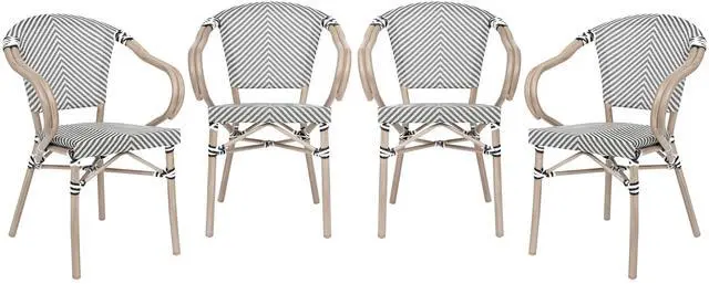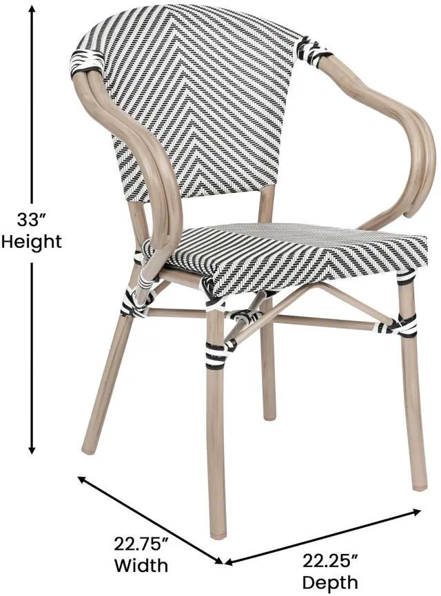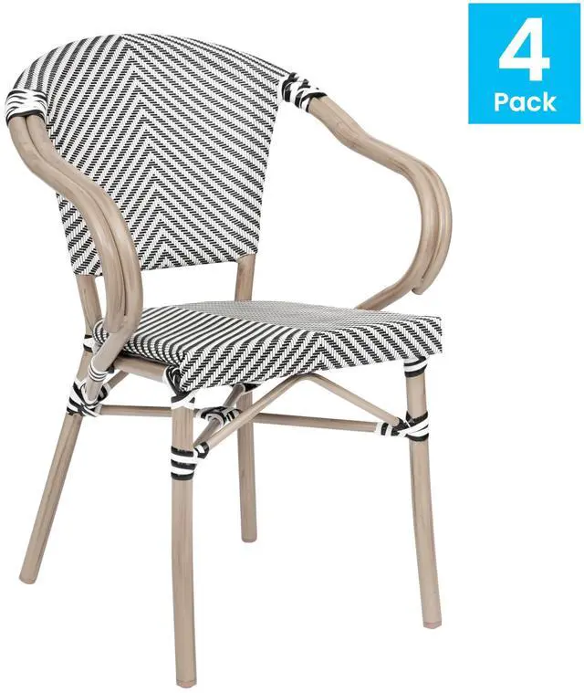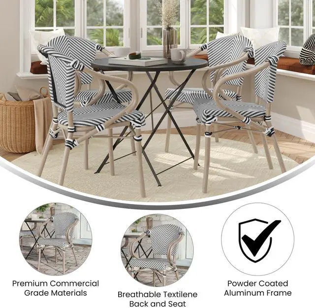 Flash Furniture Marseille Indoor/Outdoor Commercial Bistro Stack Chair - Arms - Blk/Wht Textilene Back and Seat - LT Natural Bamboo Print Metal Frame - 4 Pack