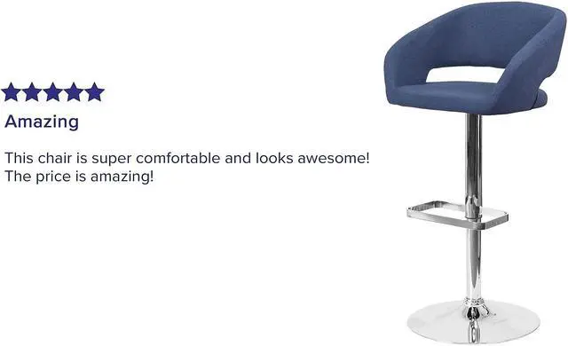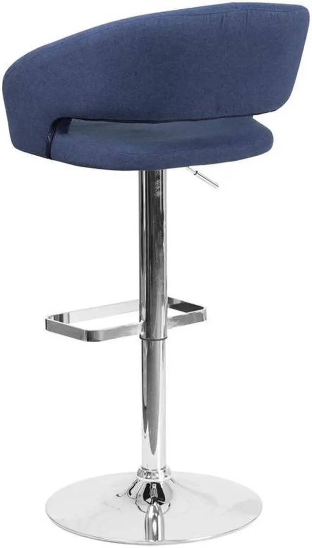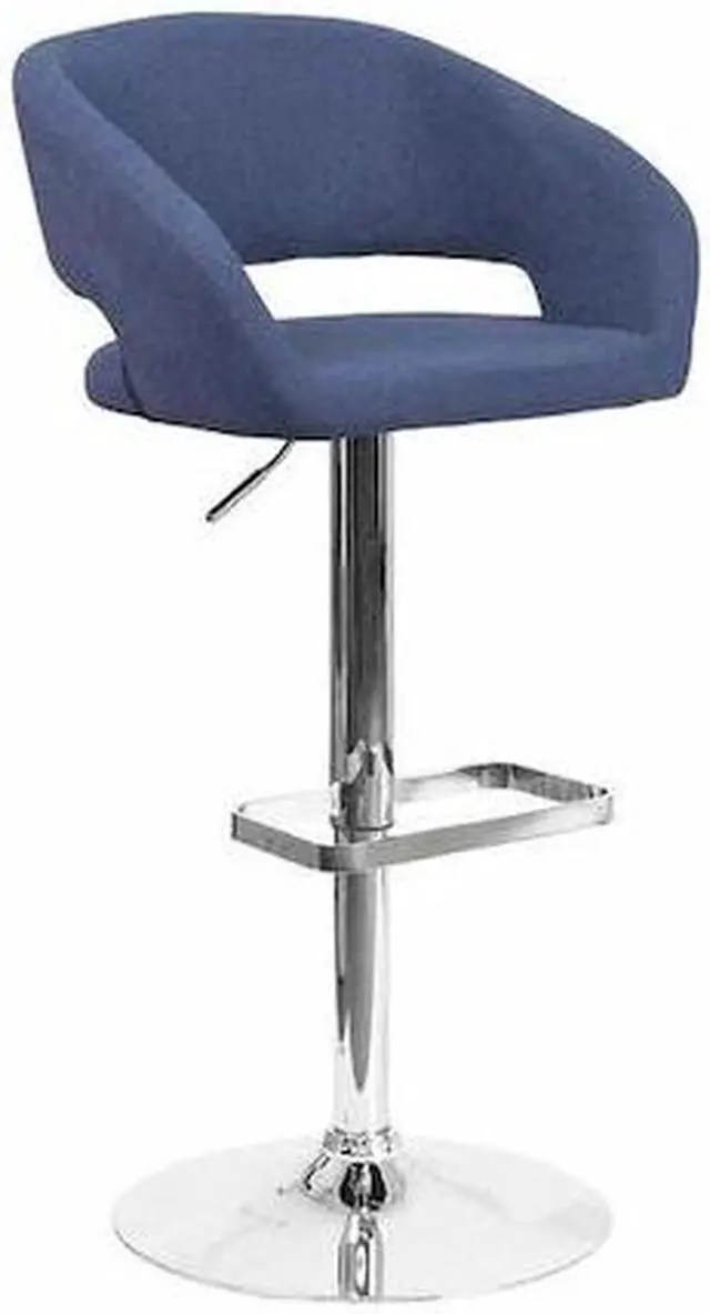 Everyone knows that the classics never go out of style and this blue fabric upholstered adjustable height barstool is the perfect example. A great fit for your breakfast bar or kitchen counter, this stool has a rounded mid-back design and a cutout back. Its seat and back are padded with 1.5" of foam and upholstered in vinyl. The height adjustable swivel seat easily adjusts from counter to bar height using the convenient gas lift handle, located just below the seat. The chrome base and footrest complement the stool's modern design. A plastic ring, embedded in the base, protects your floor by sliding smoothly when you need to move the stool.