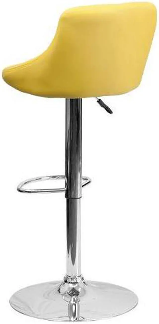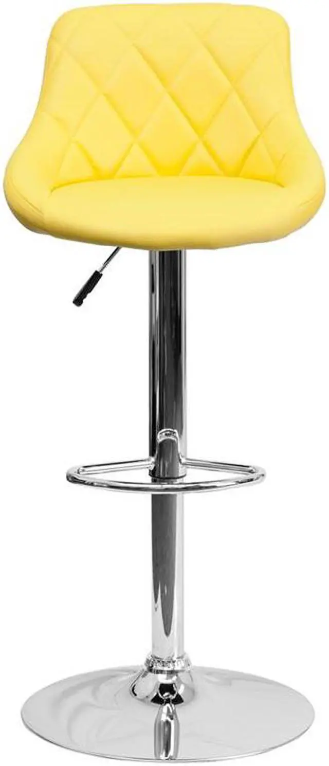 Classic style with a little zing perfectly describes this yellow upholstered adjustable height barstool with a diamond patterned back. A bucket seat design will make this a great accent chair around the bar area or kitchen and the easy to clean vinyl upholstery is an added bonus. The height adjustable swivel seat adjusts from counter to bar height with the handle located below the seat while the chrome footrest supports your feet while also providing a contemporary chic design. To help protect your floors, the base features an embedded plastic ring.