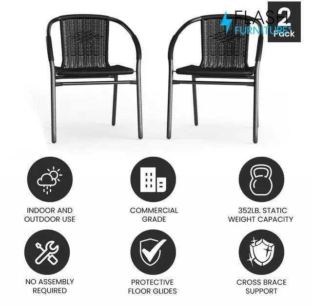 Complement your terrace and patio with these beautiful rattan chairs to surround a patio table or to seat waiting guests in the lobby. Versatile inside and outside the restaurant these lightweight stack chairs are a practical choice for any business. The full back with integrated arms provides comfort to customers. When used indoors the metal chairs have floor glides to protect your flooring and stack up to 23 high to clean floors and to store. Get cozy around the fireplace in winter months and place near your pool when it's nice outside. The all-weather frame is designed for use throughout the year, for longevity, care should be taken to protect from long periods of wet weather.