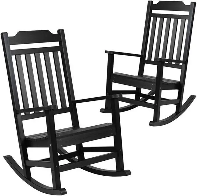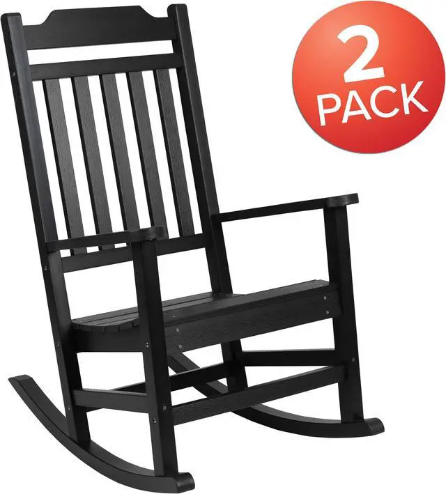 Take a break from your day and hang out on your front porch, patio or deck in this set of 2 all-weather black faux wood rocking chairs. No matter your decorating style, the traditional slat back and seat design gives a classic but on-trend look to this colorful rocking chair. The full-back design will support you in all the right places while the sloping runners provide smooth rocking motion to keep you cozy and relaxed. This indoor/outdoor rocking chair is made of long-lasting durable polystyrene so there is no warping, rotting or chipping and no back breaking sanding and staining necessary to keep this chair looking great.