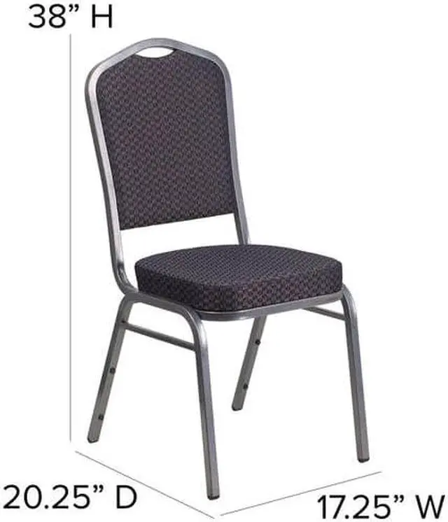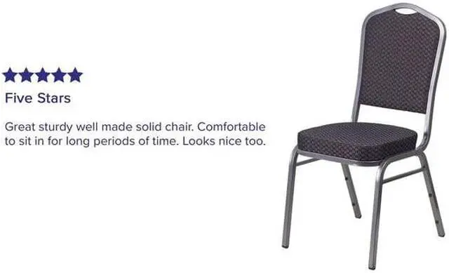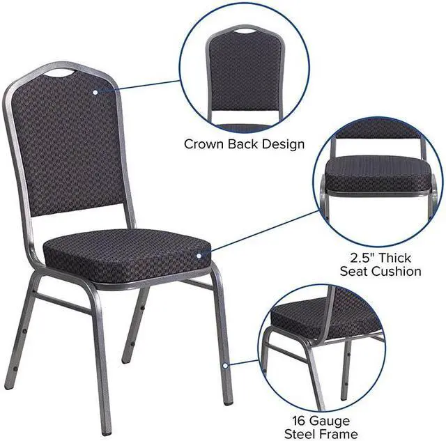 Make an impressive presentation in your banquet hall when clients come to visit your facility with these ballroom chairs. Built for the commercial industry these popular crown back banquet chairs have been tested to hold up to 500 pounds. With a high seating capacity these stack chairs are perfect for the event rental business. This standout hospitality chair can be used as is and still command attention or be dressed up for formal events by placing a chair cover over it. The chair is cushioned with 2.5" thick CAL 117 fire retardant foam and is covered in durable upholstery for high usage.