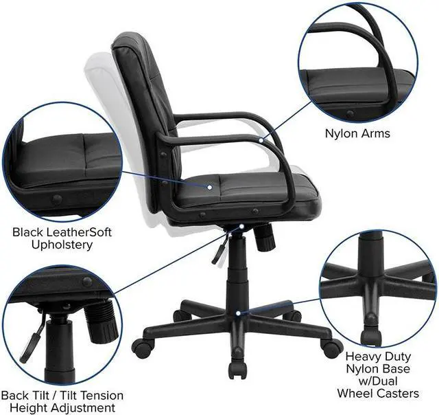 Create a visually appealing look in your office or reception area with this LeatherSoft upholstered, swivel office chair with arms. Mid-back office chairs are a great choice for workspaces where space may be tight, allowing you to move from one desk to another. A mid-back office chair offers support to the mid-to-upper back region prompting you to sit straight. Chair easily swivels 360 degrees to get the maximum use of your workspace without strain. A full range of adjustable features help your employees change the feel of this chair to meet their own personal preferences.