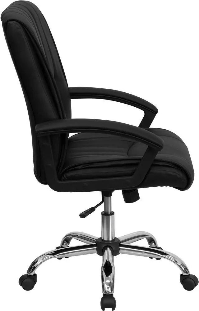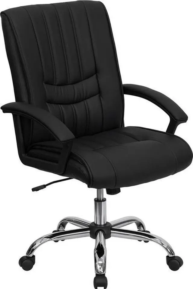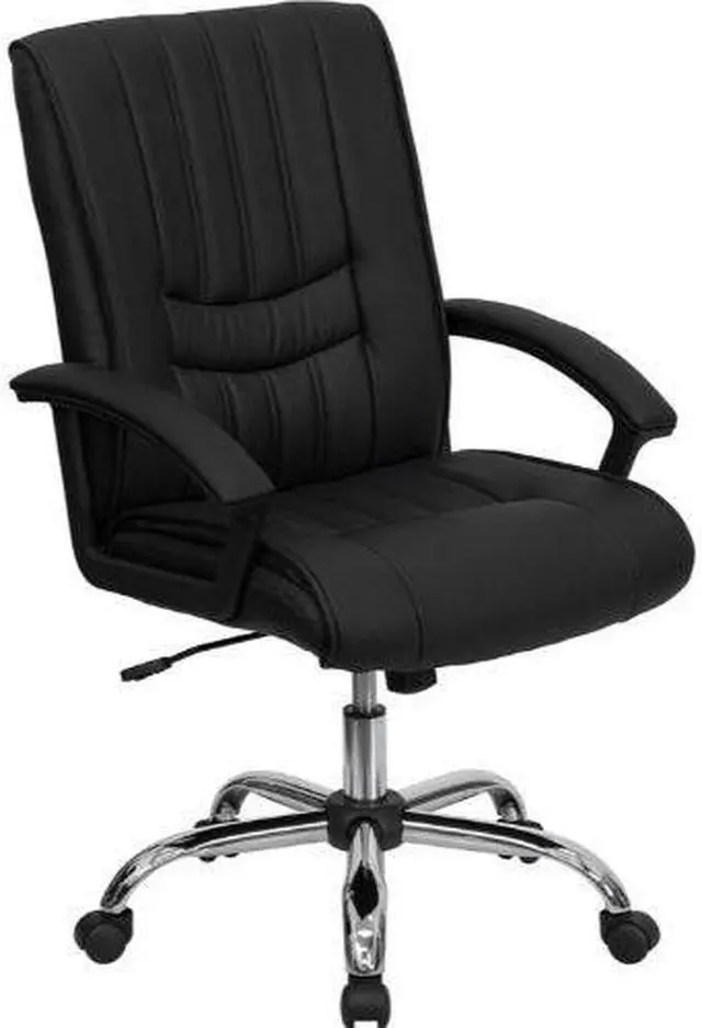 This LeatherSoft office chair features appealing vertical line stitching in the seat and back. This chair not only exudes appeal but comfort with plush padding in the seat and back. Practical and adaptable for most office settings, mid-back office chairs are the logical choice for performing an array of tasks. A mid-back office chair offers support to the mid-to-upper back region. The waterfall front seat edge removes pressure from the lower legs and improves circulation. Chair easily swivels 360 degrees to get the maximum use of your workspace without strain. The pneumatic adjustment lever will allow you to easily adjust the seat to your desired height.