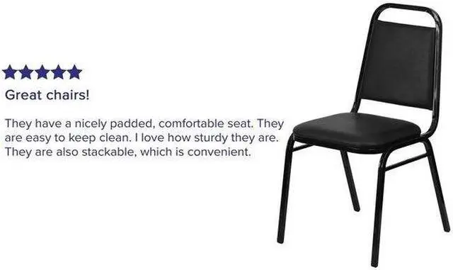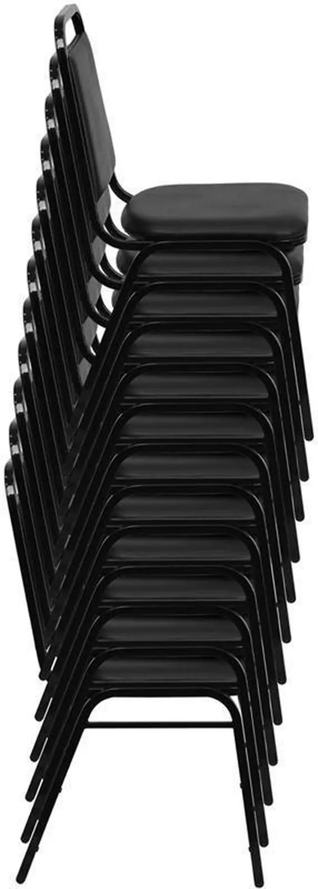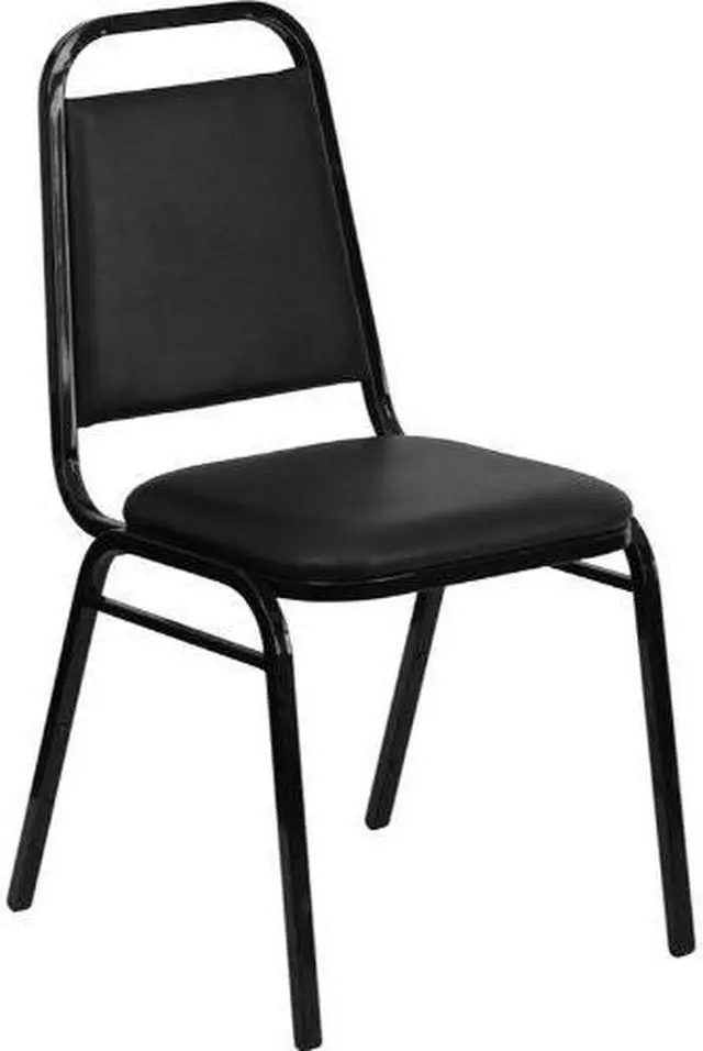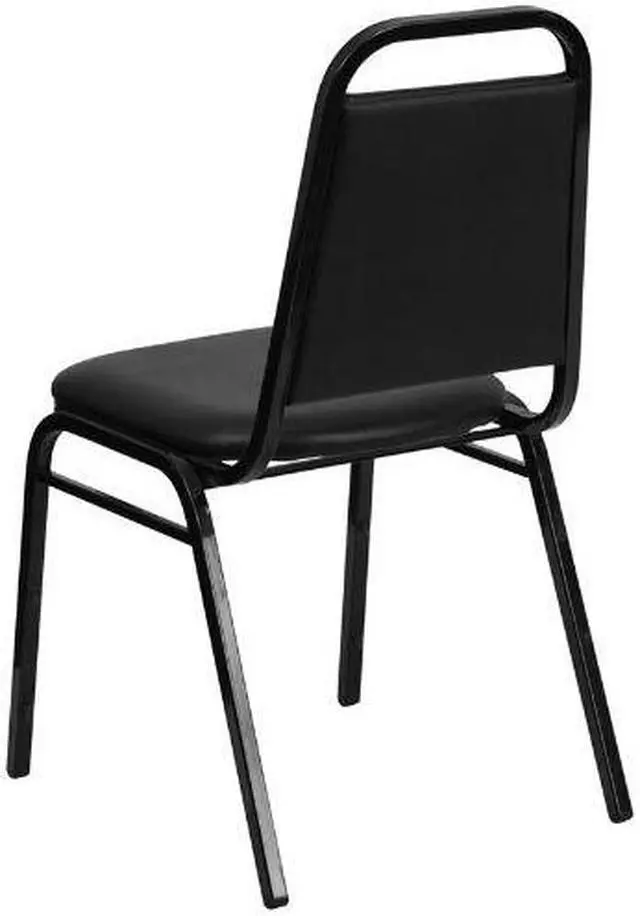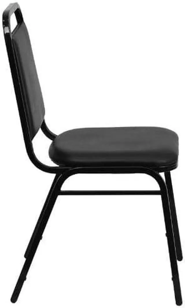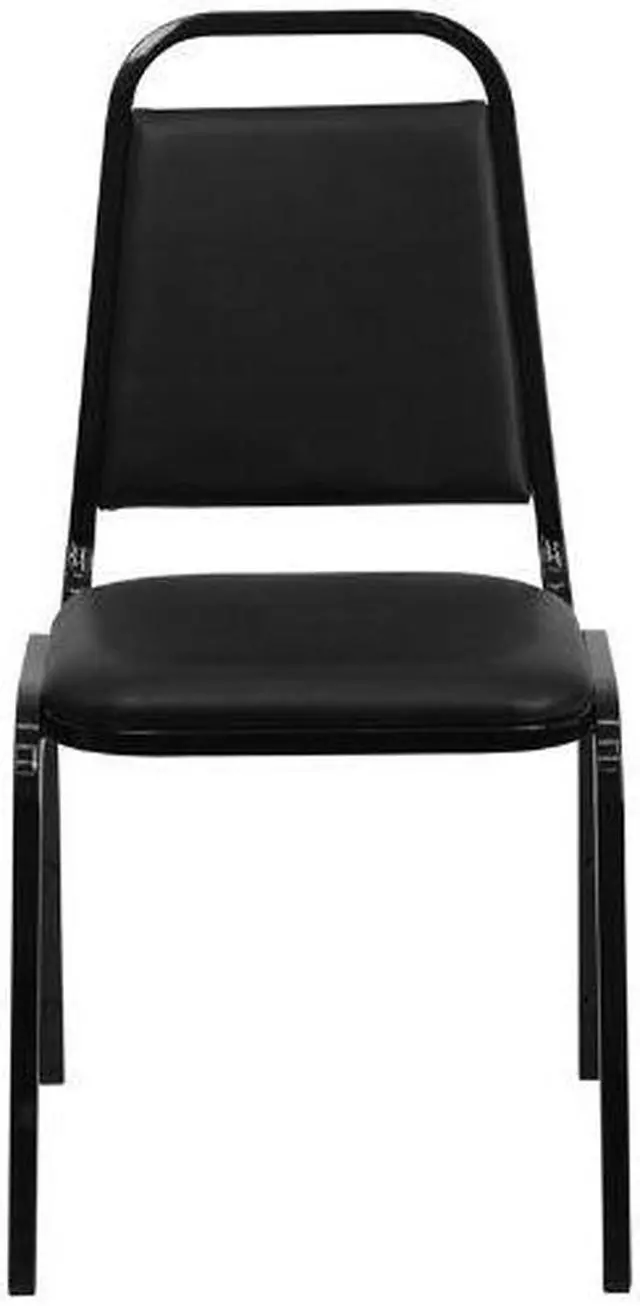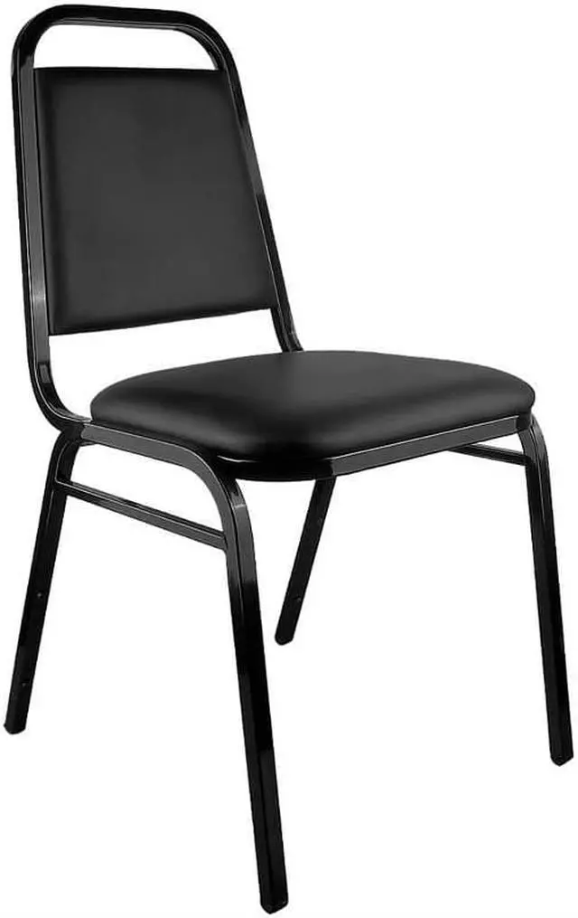 This commercial grade banquet chair with trapezoidal back design fits well in formal and casual settings from wedding ceremonies to corporate meetings and awards banquets. The chair's cushioned back and 1.5" thick foam seat are covered with durable vinyl upholstery. Its sturdy, 16 gauge steel, powder coated frame, with gracefully angled legs, has been tested to hold up to 500 pounds. Double support braces reinforce the frame to give it great strength and durability. Bumper guards prevent scratches on the frame when stacked (up to 10 high) and non-marring floor glides protect your floor by sliding smoothly when you need to move the chair.