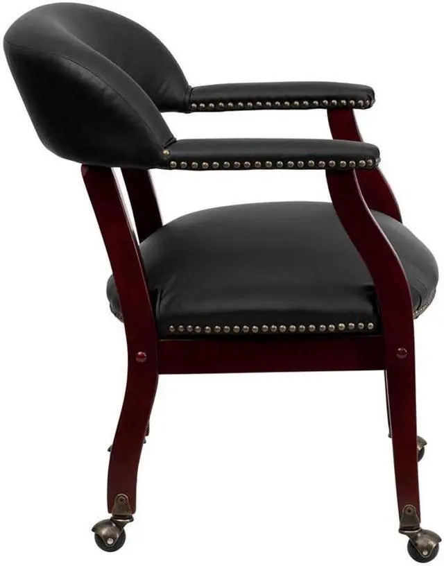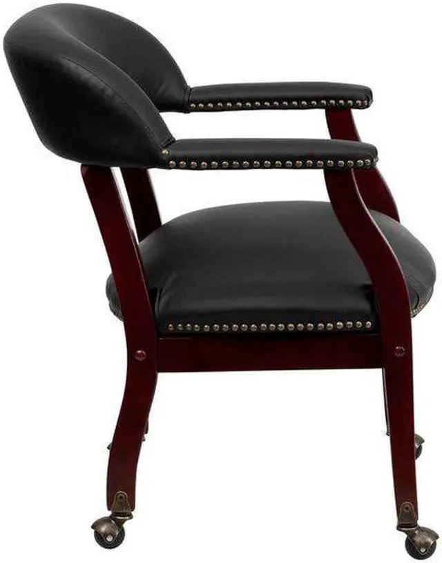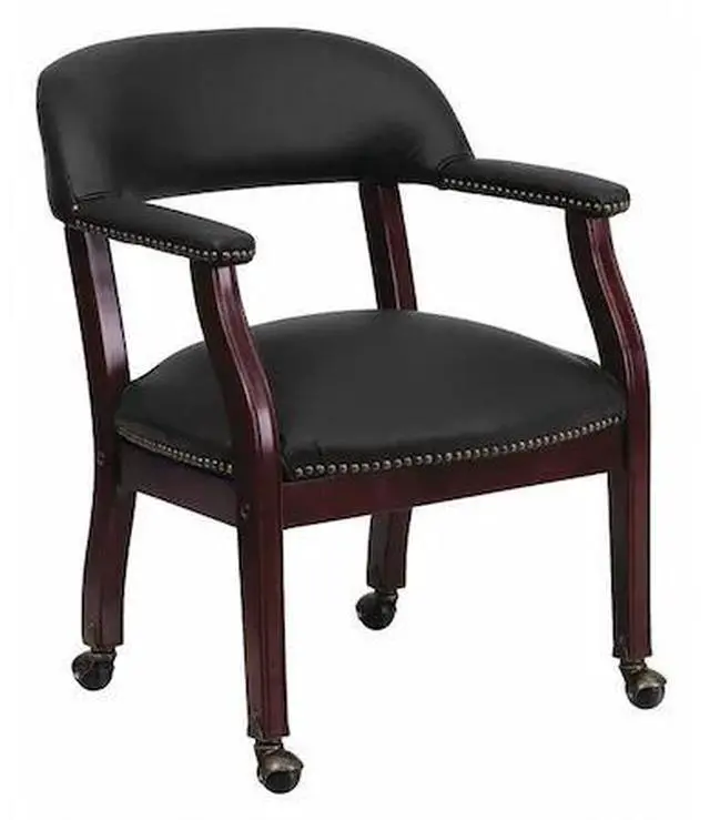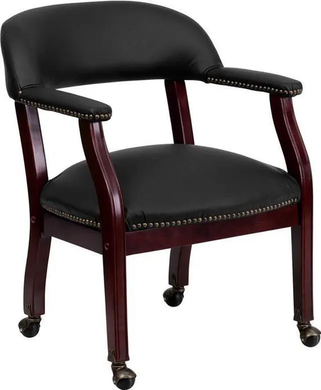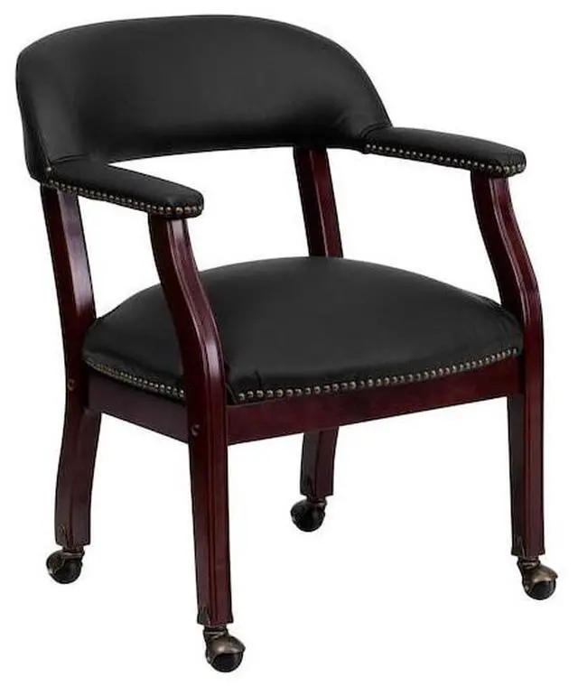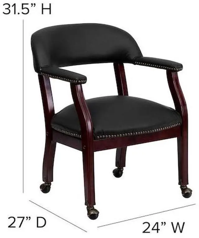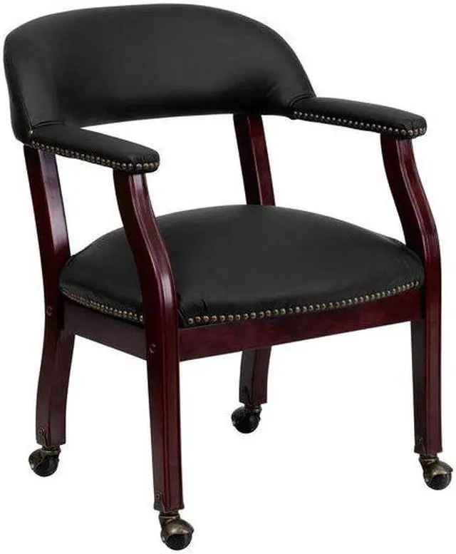 Add timeless charm to your space with this elegant reception/conference chair. This chair features black LeatherSoft upholstery, contoured cushions and an open back design. LeatherSoft is leather and polyurethane for added softness and durability. Designed with upholstered straight arms and attractive brass nail accents, this chair adds a distinctive touch to any setting. The carpet casters make the chair easy to move while sitting for meetings and conferences. For long-lasting performance, this conference chair is built with a sturdy hardwood frame with brass hooded ball casters. This chair will complement reception areas, libraries or your office as a guest chair.
