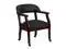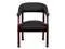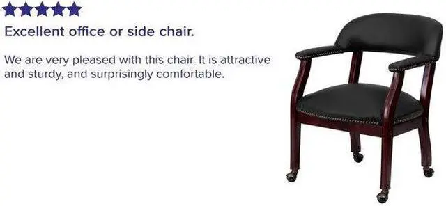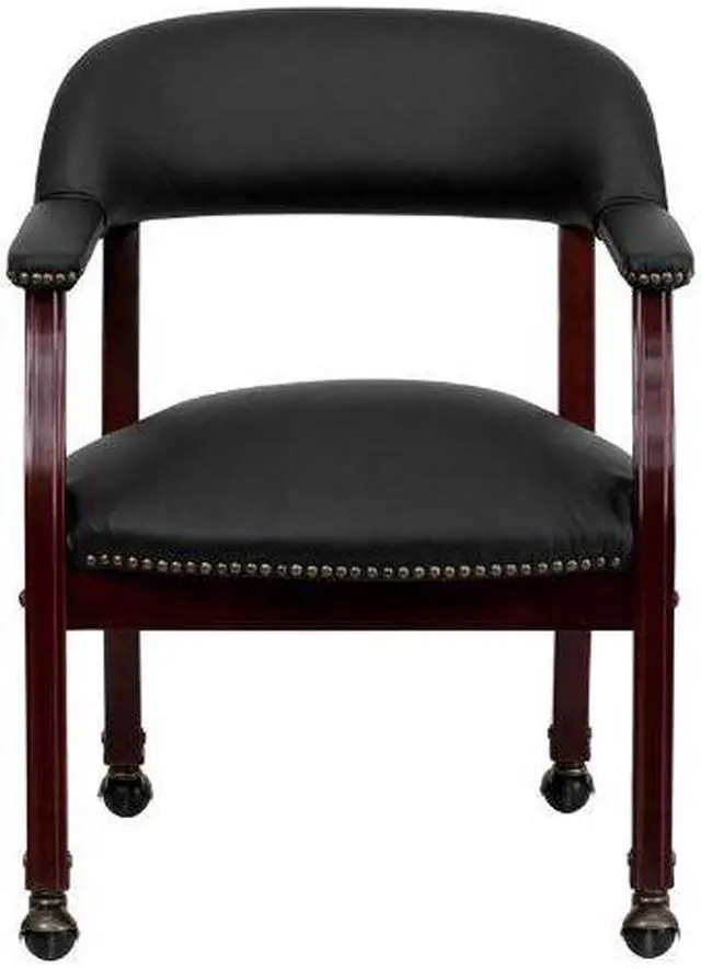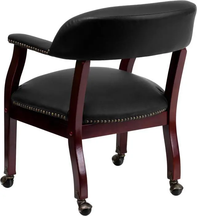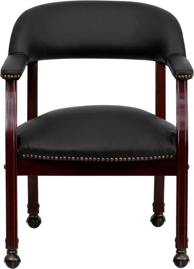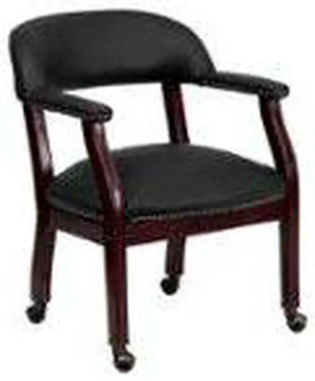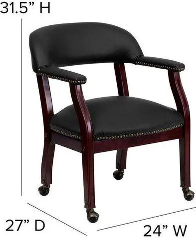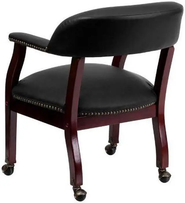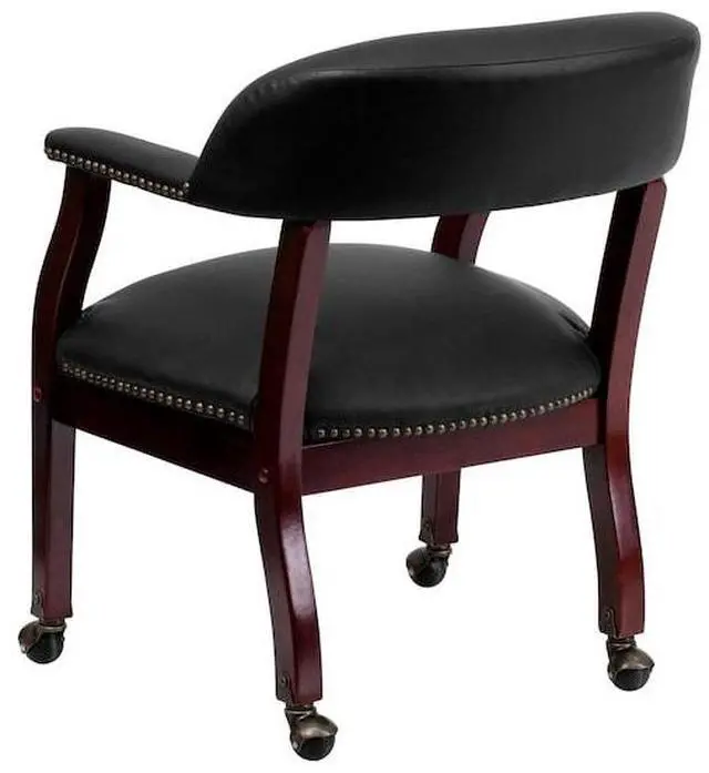 Add timeless charm to your space with this elegant reception/conference chair. This chair features black LeatherSoft upholstery, contoured cushions and an open back design. LeatherSoft is leather and polyurethane for added softness and durability. Designed with upholstered straight arms and attractive brass nail accents, this chair adds a distinctive touch to any setting. The carpet casters make the chair easy to move while sitting for meetings and conferences. For long-lasting performance, this conference chair is built with a sturdy hardwood frame with brass hooded ball casters. This chair will complement reception areas, libraries or your office as a guest chair.