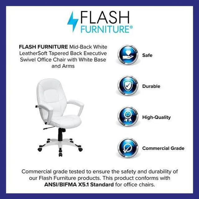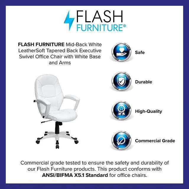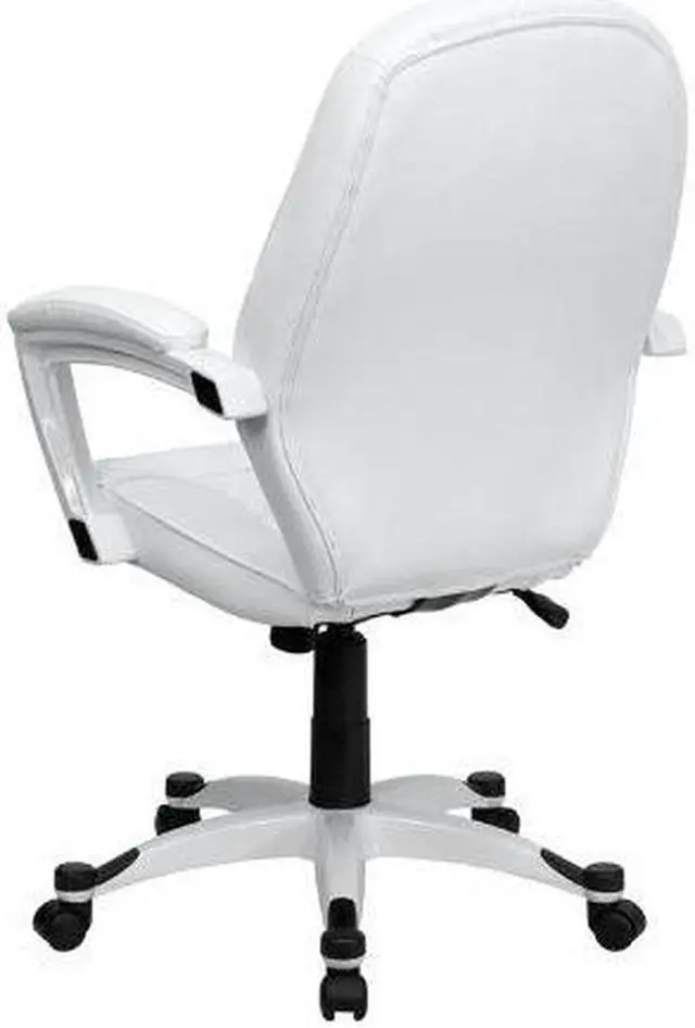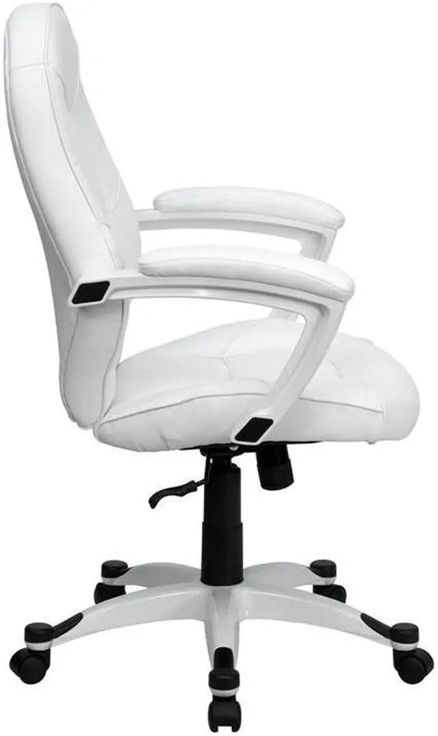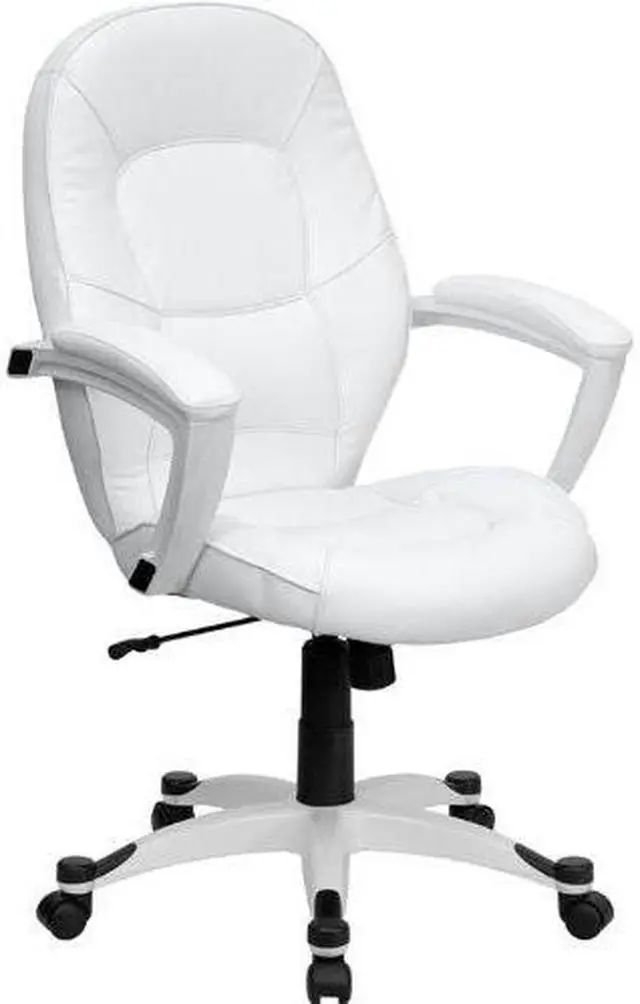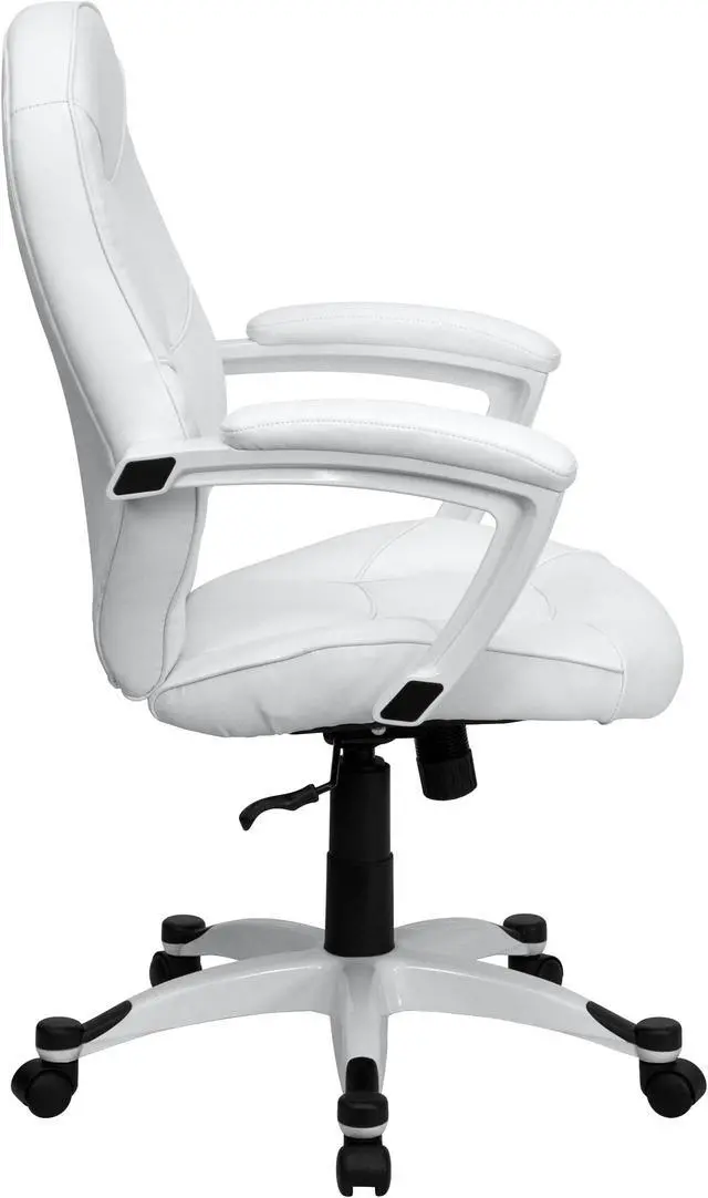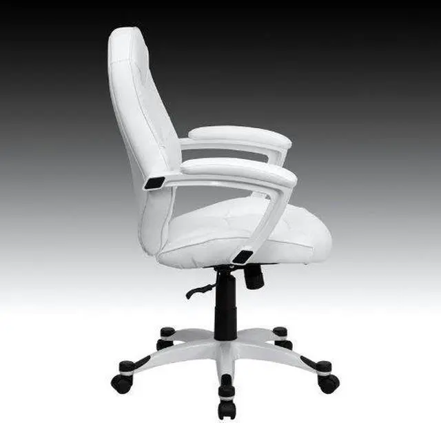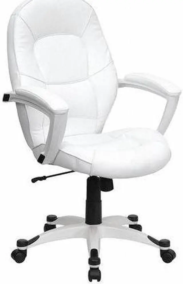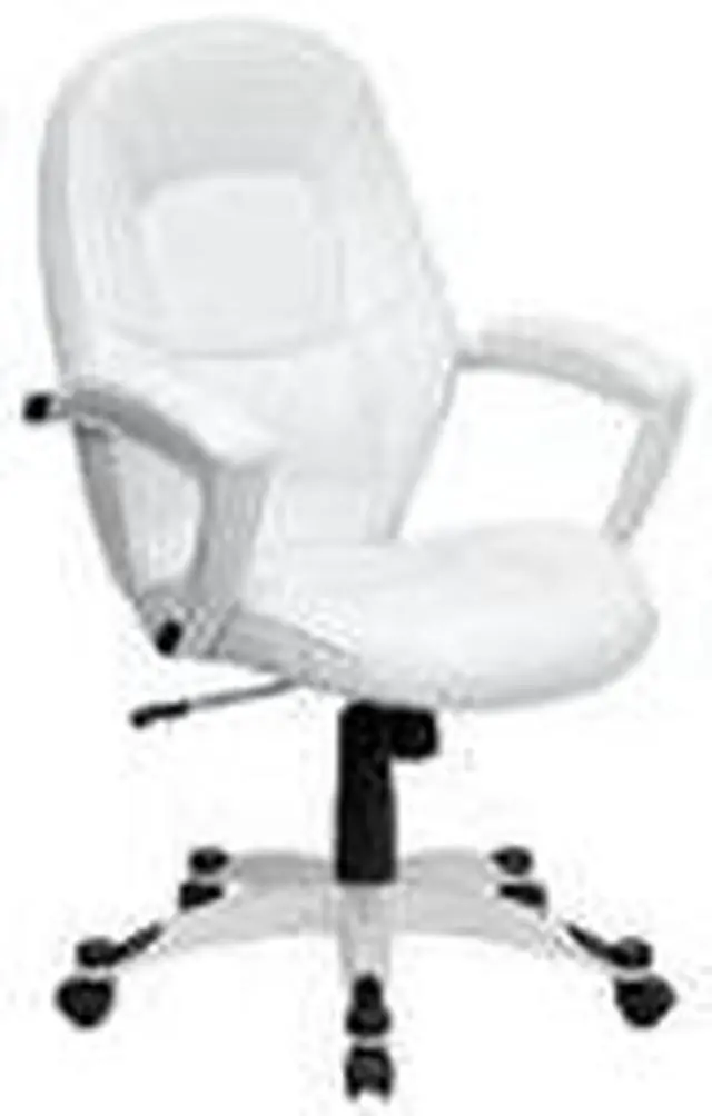Set yourself apart from the masses with the typical black upholstered chair and make a statement with this appealing executive office chair, upholstered in soft white leather. High back office chairs have backs extending to the upper back for greater support. The high back design relieves tension in the lower back, preventing long term strain. The waterfall front seat edge removes pressure from the lower legs and improves circulation. Chair easily swivels 360 degrees to get the maximum use of your workspace without strain. The pneumatic adjustment lever will allow you to easily adjust the seat to your desired height. The white nylon base with black caps prevents feet from slipping when resting on chairs base.