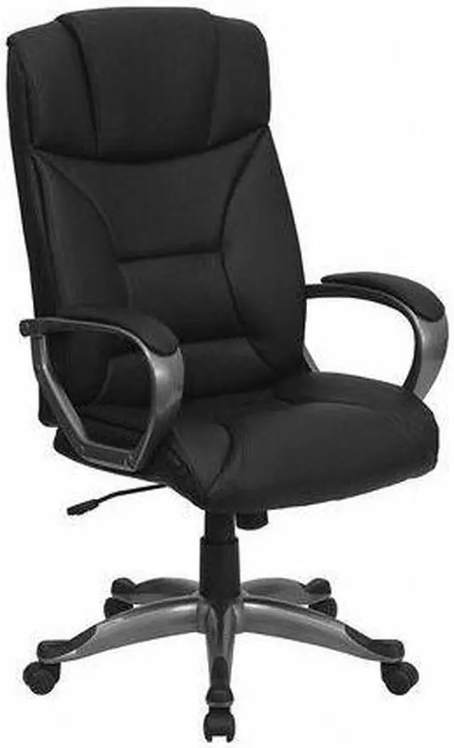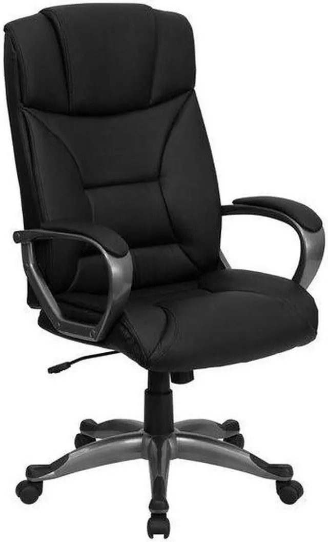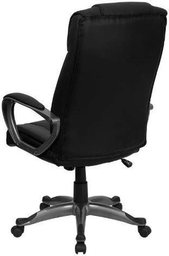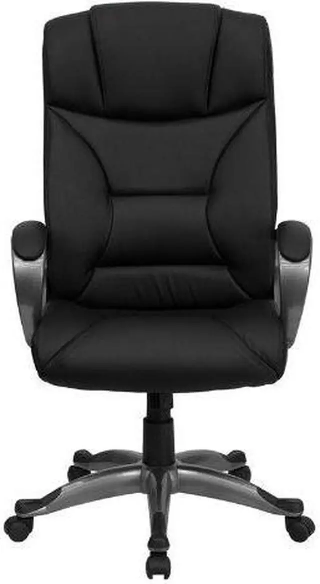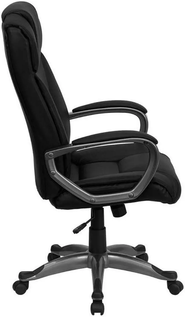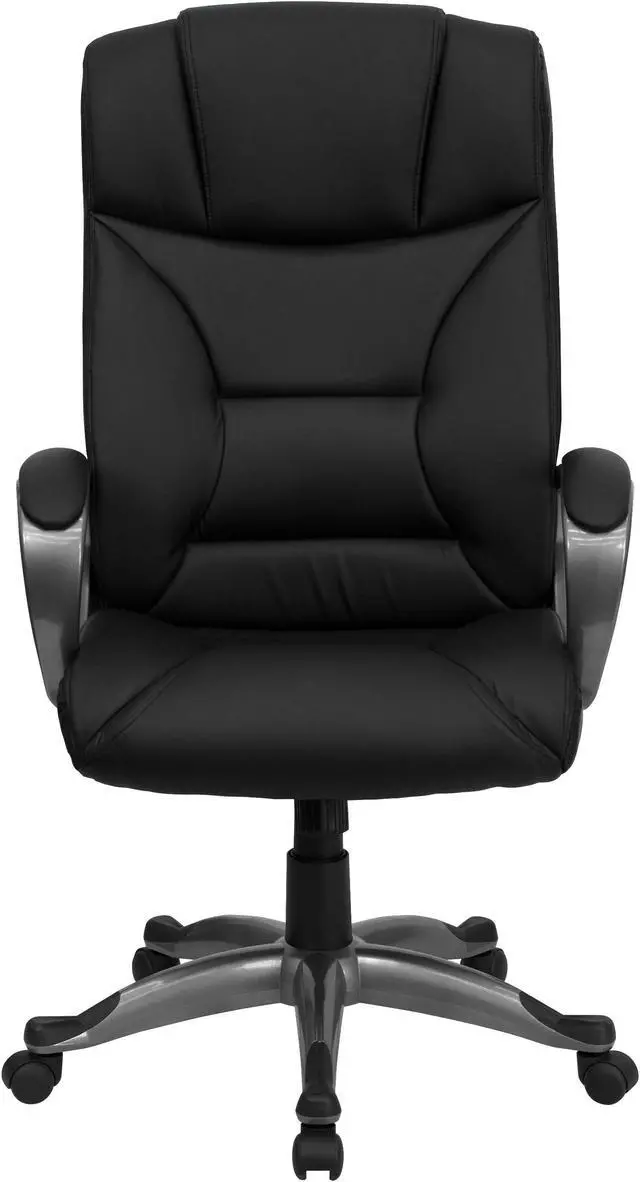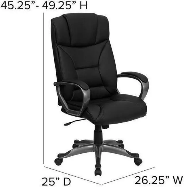Whether you work from home or go into the office, this plush LeatherSoft upholstered executive office chair has a sleek, upscale look to show off your modern taste and style. LeatherSoft is leather and polyurethane for added softness and durability. This chair features generous padding on the seat, back and arms to provide comfort throughout the day. Having the support of an ergonomic office chair may help promote good posture and reduce future back problems or pain. High back office chairs extend to the upper back for greater support. The high back design relieves tension in the lower back, preventing long term strain. The waterfall front seat edge removes pressure from the lower legs and improves circulation. The tilt lock mechanism rocks/tilts the chair and locks in an upright position while the tilt tension adjustment knob adjusts the chair's backward tilt resistance. Chair easily swivels 360 degrees to get the maximum use of your workspace without strain. The pneumatic adjustment lever will allow you to easily adjust the seat to your desired height. The titanium nylon base with black caps prevents feet from slipping when resting on chairs base. Take this executive office chair for a test drive, it won't disappoint.Product Dimension-26.25"W x 25"D x 45.25" - 49.25"H