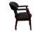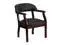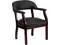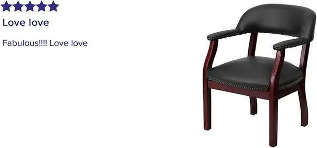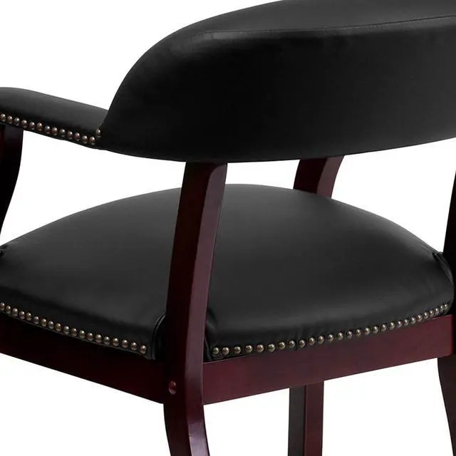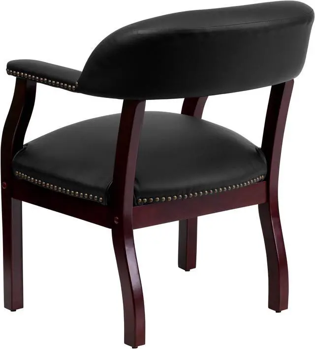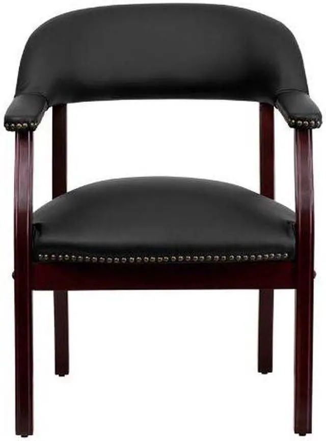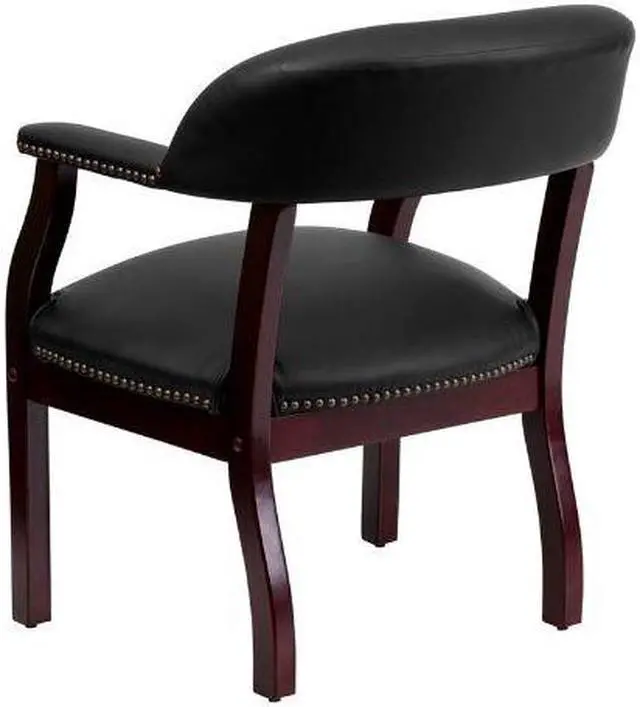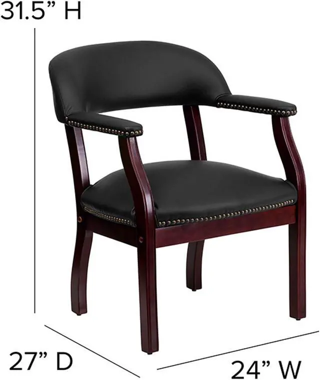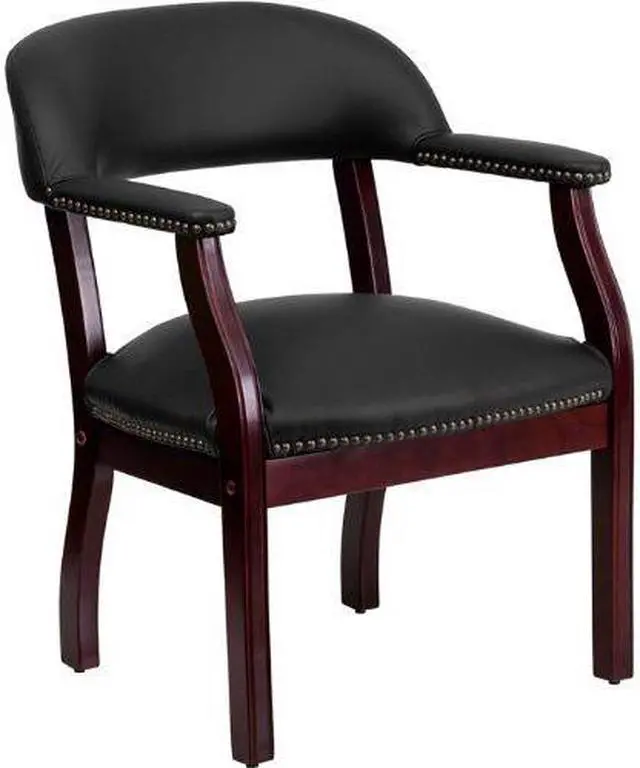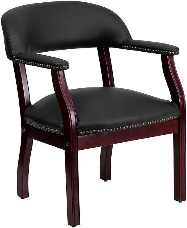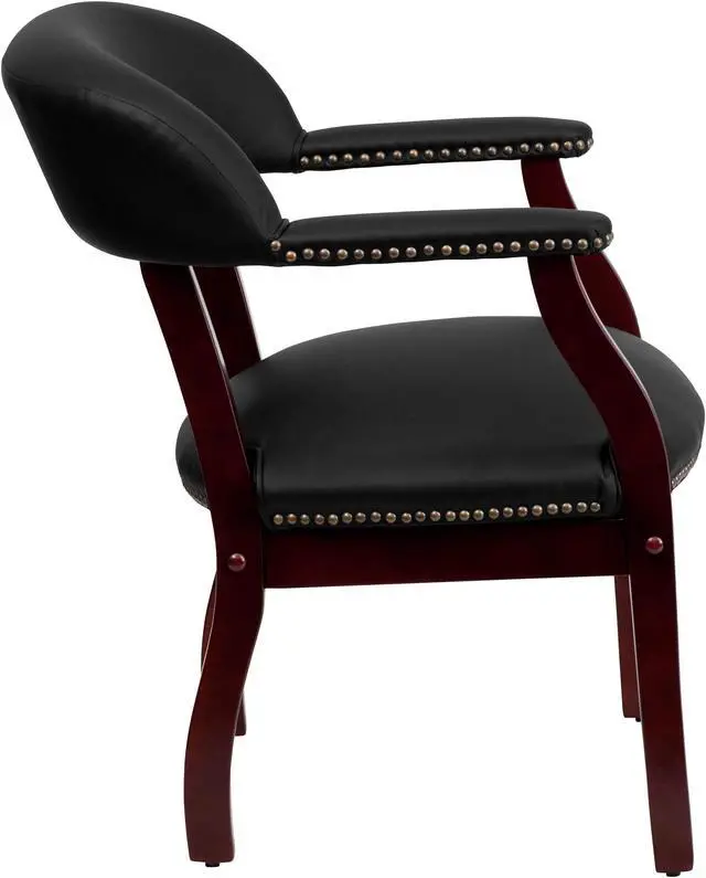Add timeless charm to your space with this elegant reception/conference chair. This chair features black LeatherSoft upholstery, contoured cushions and an open back design. LeatherSoft is leather and polyurethane for added softness and durability. Designed with upholstered straight arms and attractive brass nail accents, this chair adds a distinctive touch to any setting. For long-lasting performance, this conference chair is built with a sturdy hardwood frame. This chair will complement reception areas, libraries or your office as a guest chair.