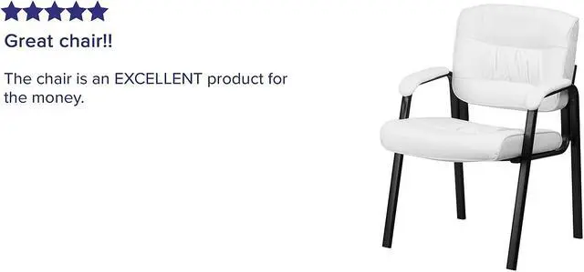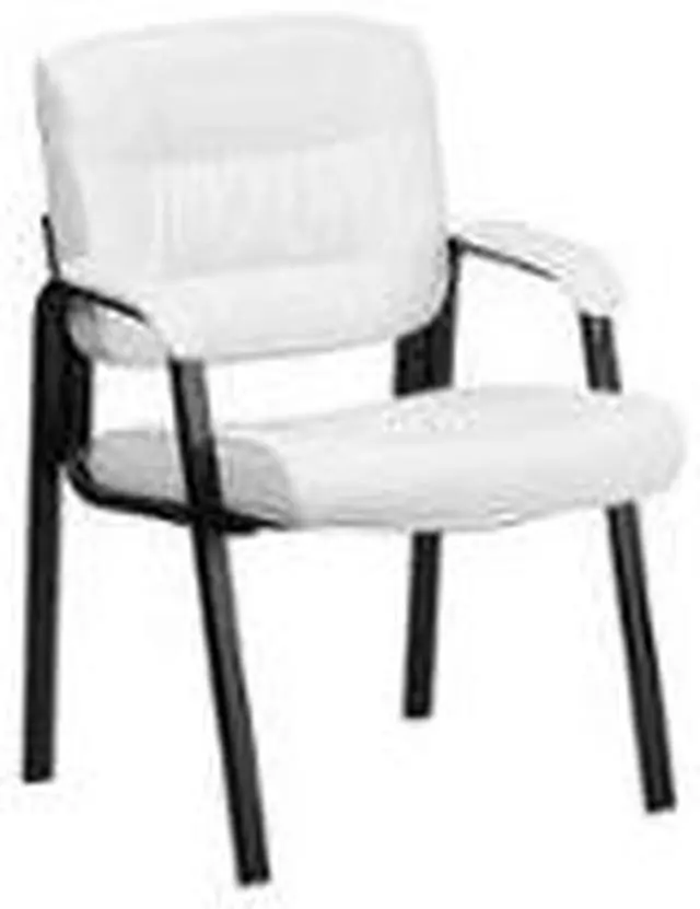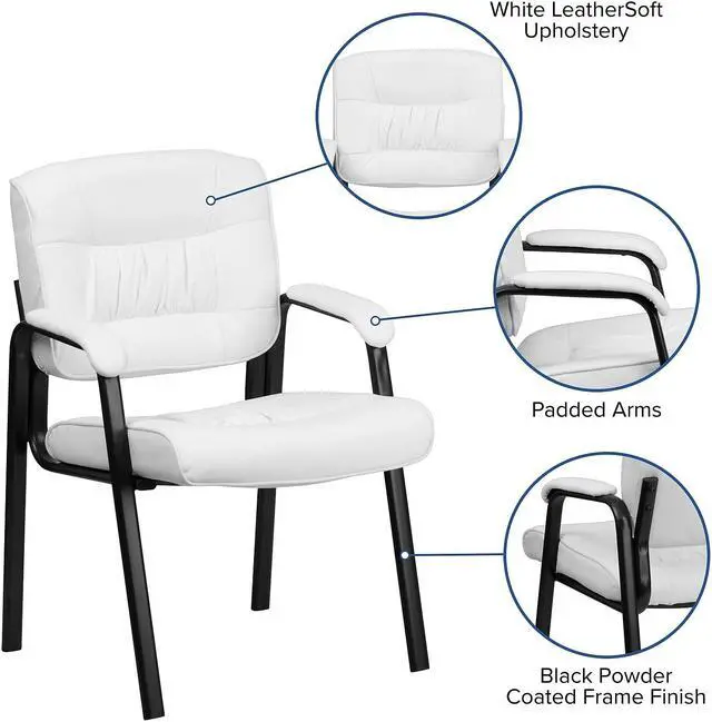Make a great first impression when your customers or clients visit your place of business with this White LeatherSoft Executive Side Reception Chair with Black Metal Frame. It features a comfortable, contoured tufted seat and back that are padded with 2" of CAL 117 fire retardant foam. LeatherSoft is leather and polyurethane for added Softness and Durability. A waterfall edge seat helps to reduce pressure and promote healthy blood flow to your legs while the padded armrests take the pressure off the neck, shoulders and arms allowing your guests to feel more comfortable. The sturdy metal frame will stand up to heavy use and plastic floor glides protect your floor by sliding smoothly when you need to move it.
