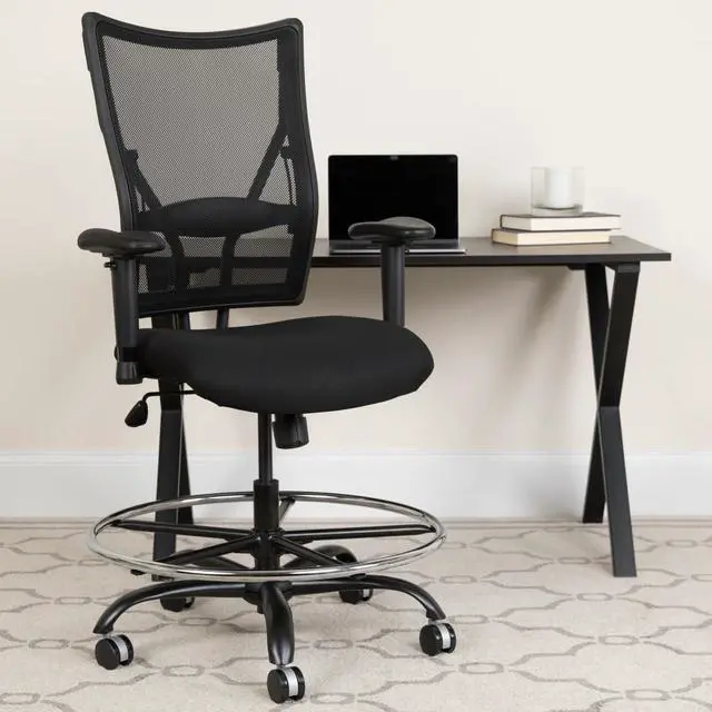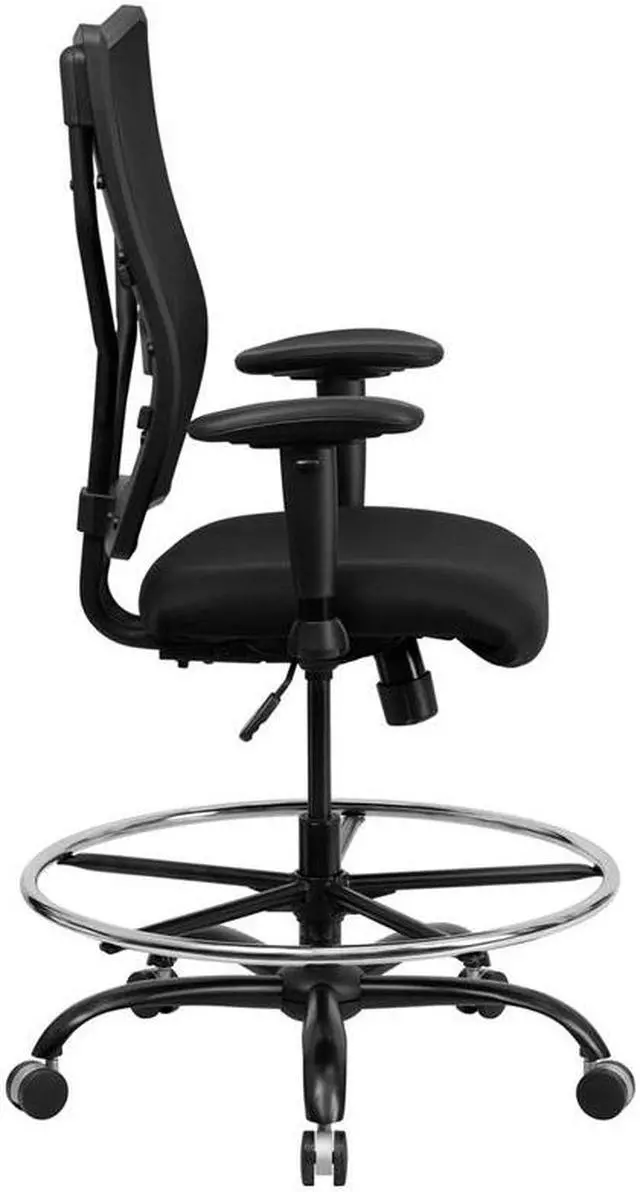 Draft chairs are essential for any profession where work surfaces are above standard height or for any job requiring employees to be at eye contact level with customers. This Big & Tall drafting chair is designed to accommodate larger and taller body types and has been tested to hold a capacity of up to 400 lbs., offering a broader seat and back width. High back office chairs extend to the upper back for greater support and relieve tension in the lower back, preventing long term strain. Mesh office chairs can keep you more productive throughout your work day with a ventilated back design.