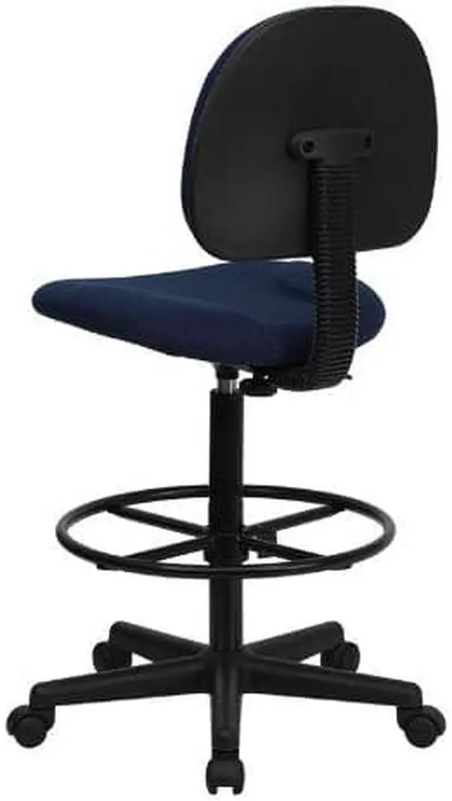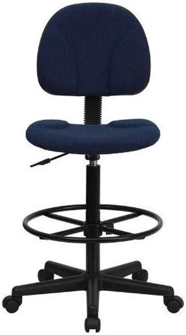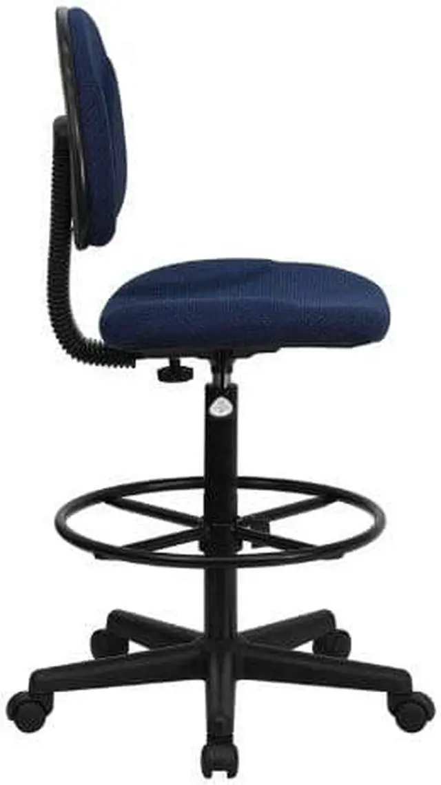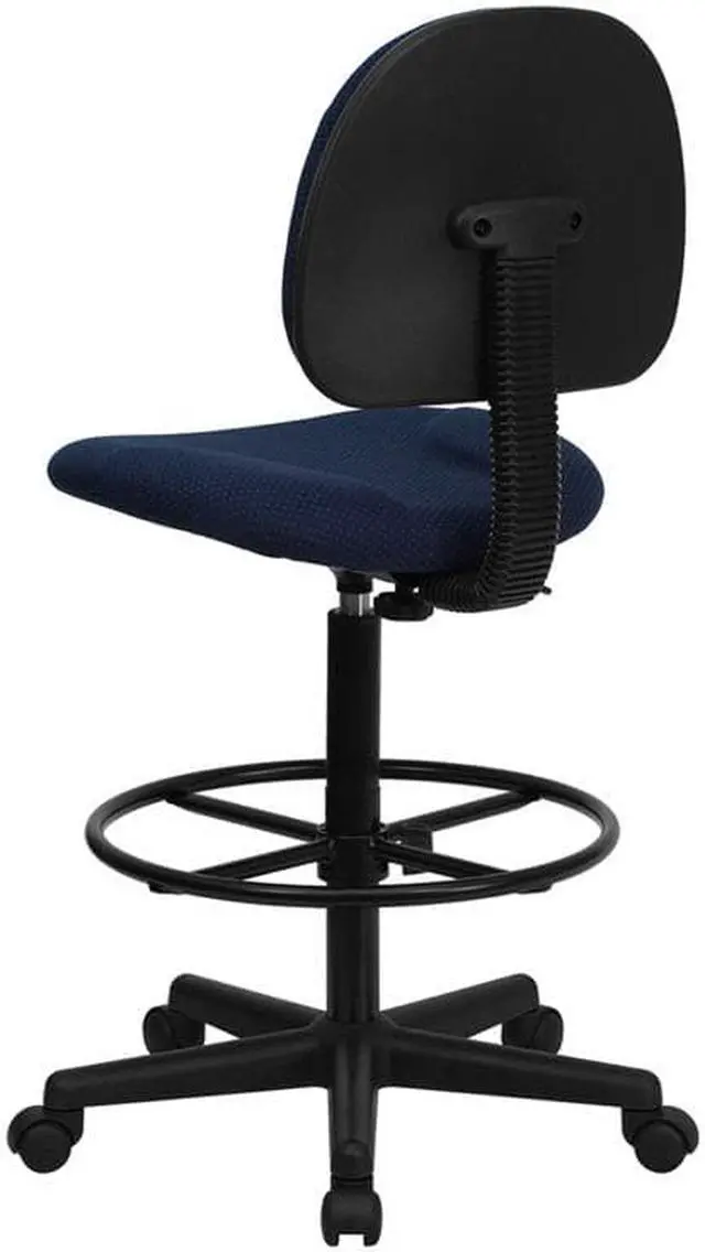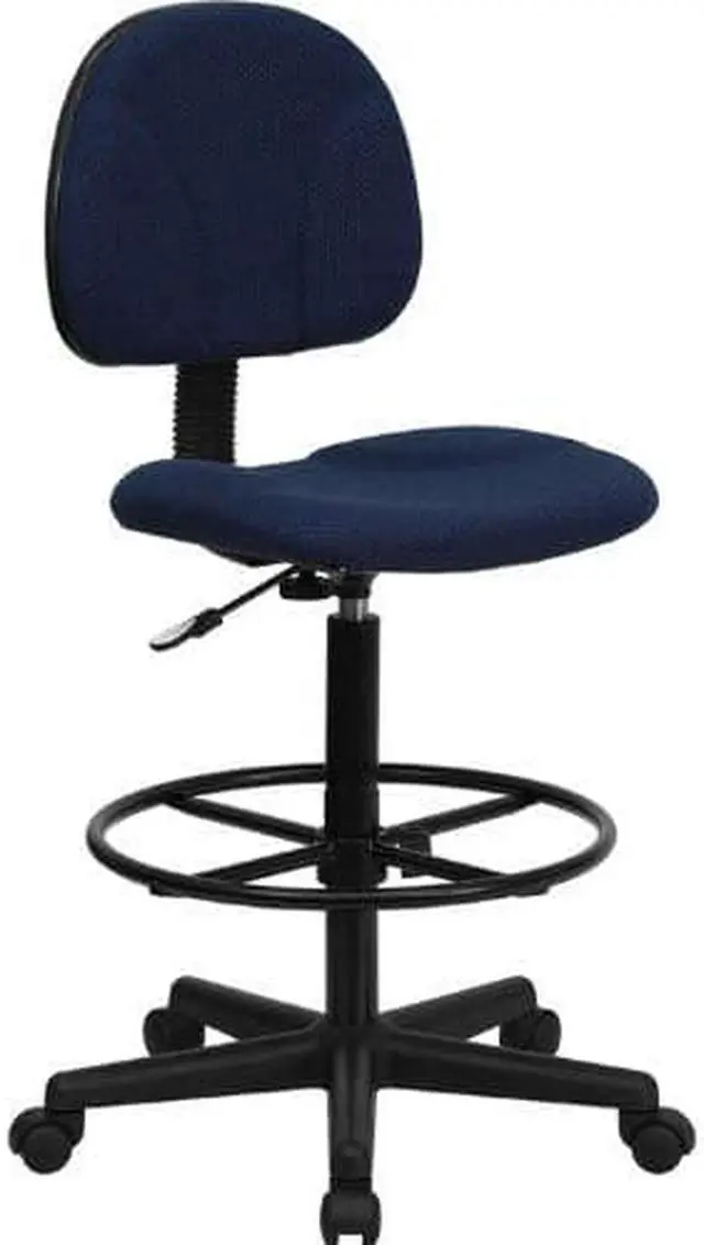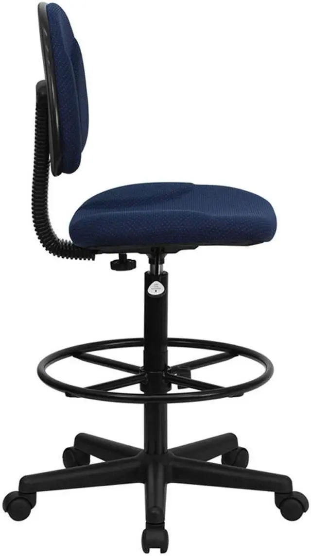 If you sit for long hours throughout the day you may benefit from this navy blue patterned fabric upholstered drafting chair. Draft chairs are essential for any profession where work surfaces are above standard height, such as lab technicians, architects, graphic artists, or any other creative assignment. They can also make a great chair for any job requiring employees to be at eye contact level with customers, such as receptionists or cashiers. This chair was designed to support the mid-to-upper back region. Chair easily swivels 360 degrees to get the maximum use of your workspace without strain. The pneumatic adjustment lever will allow you to easily adjust the seat to your desired height. The foot ring can also be adjusted to your height preference for added comfort. This versatile chair is sure to make an impact whether it is used in the home or at the office.Product Dimension-20"W x 20"D x 38.25" - 42.75"H