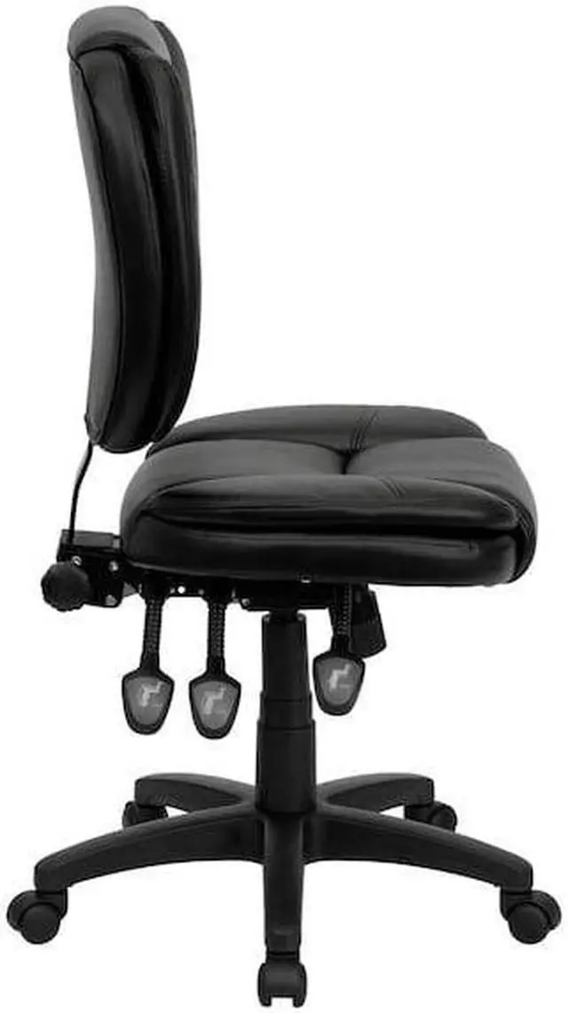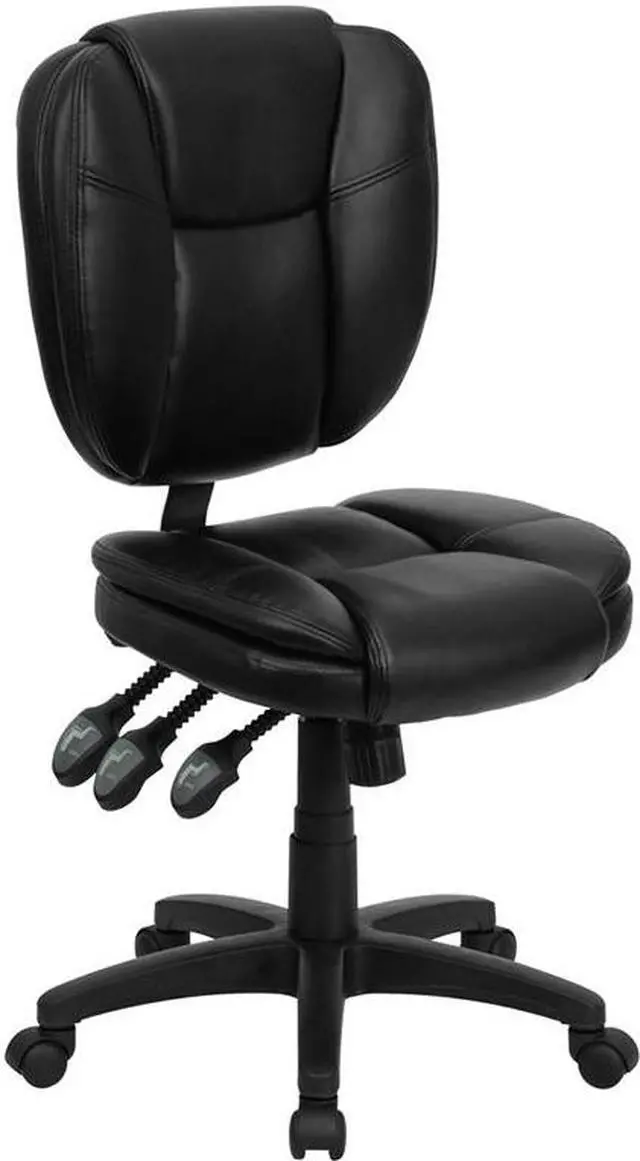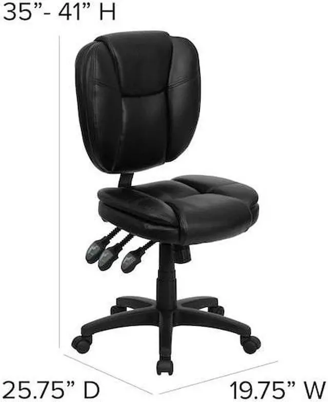 This amazing ergonomic task office chair featuring pillow top cushioning and multiple adjusting capabilities will keep you comfortable no matter your workload. This office chair boasts soft and durable black LeatherSoft upholstery to keep you comfortable through your work day or while browsing the internet. The contoured seat dissipates pressure points for greater comfort. A mid-back office chair offers support to the mid-to-upper back region. The locking back angle adjustment lever changes the angle of your torso to reduce disc pressure. The locking synchro tilt control allows the chair's back and seat to recline at different rates, increasing the angle between your torso and thighs.