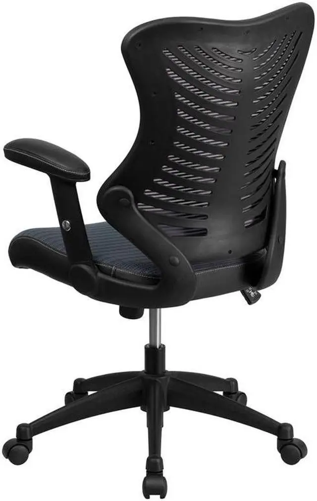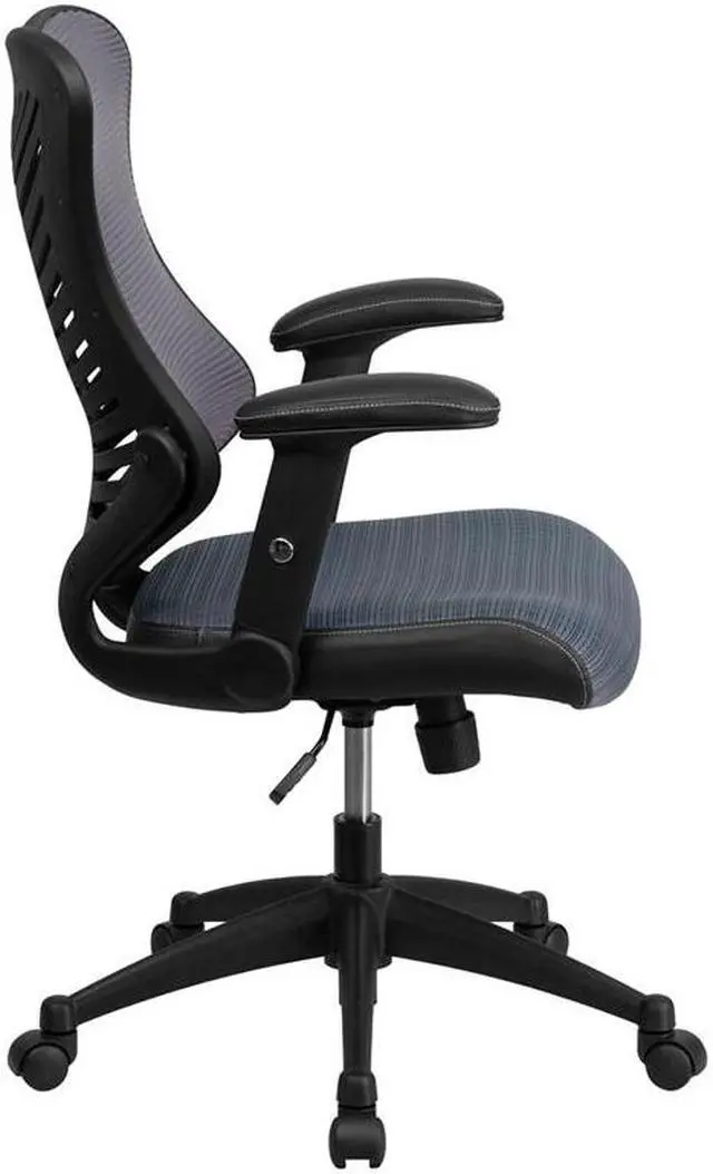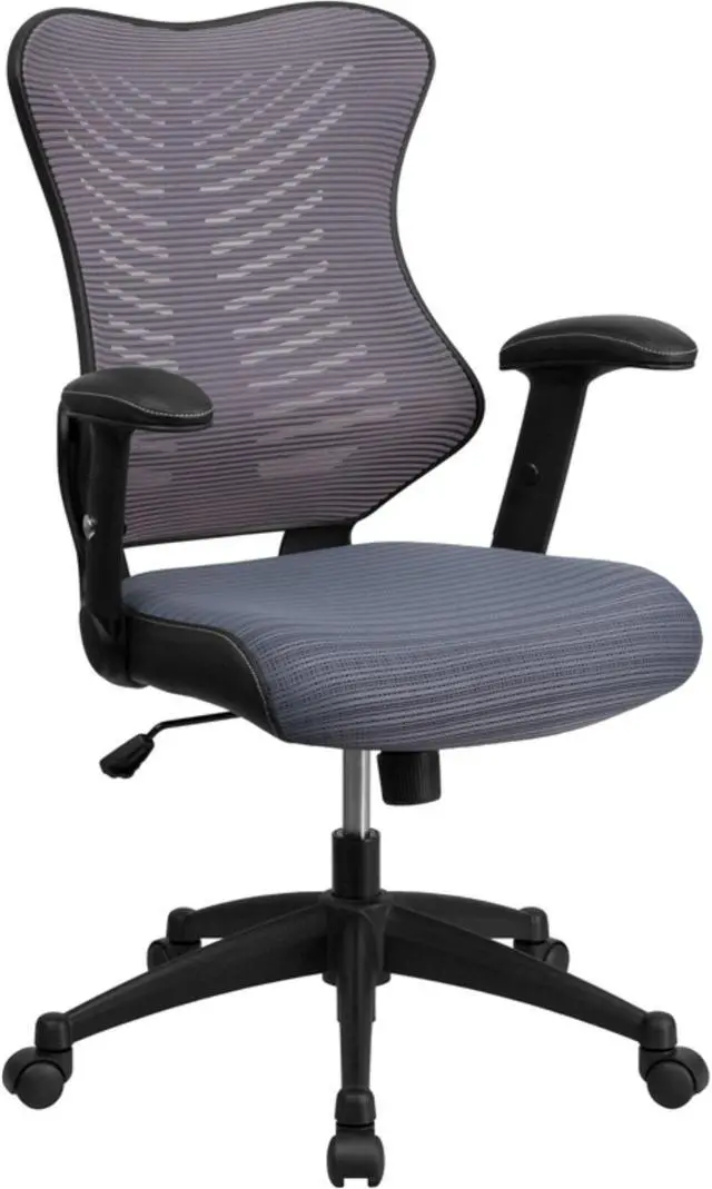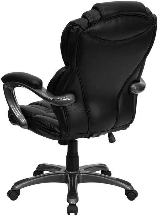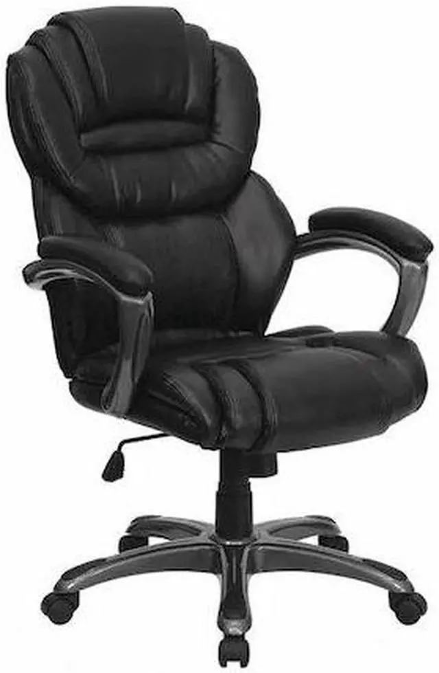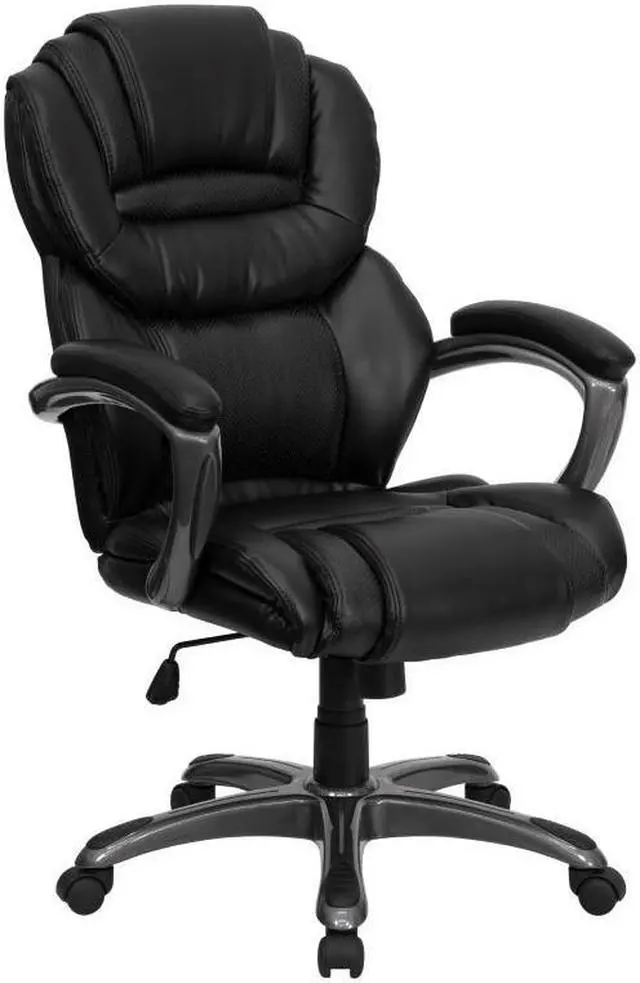 This popular contemporary office chair features soft LeatherSoft upholstery, an overstuffed seat, back and arms, and ergonomic styling to provide an unmatched sitting experience. LeatherSoft is leather and polyurethane for softness and durability. High back office chairs have backs extending to the upper back for greater support. The high back design relieves tension in the lower back, preventing long term strain. The waterfall front seat edge removes pressure from the lower legs and improves circulation. Chair easily swivels 360 degrees to get the maximum use of your workspace without strain. The pneumatic adjustment lever will allow you to easily adjust the seat to your desired height. The titanium nylon base with black caps prevents feet from slipping when resting on chairs base. For your next office chair, look no further than this comfortable and very stylish LeatherSoft office chair!Product Dimension-27.25"W x 29.5"D x 41" - 44.75"H