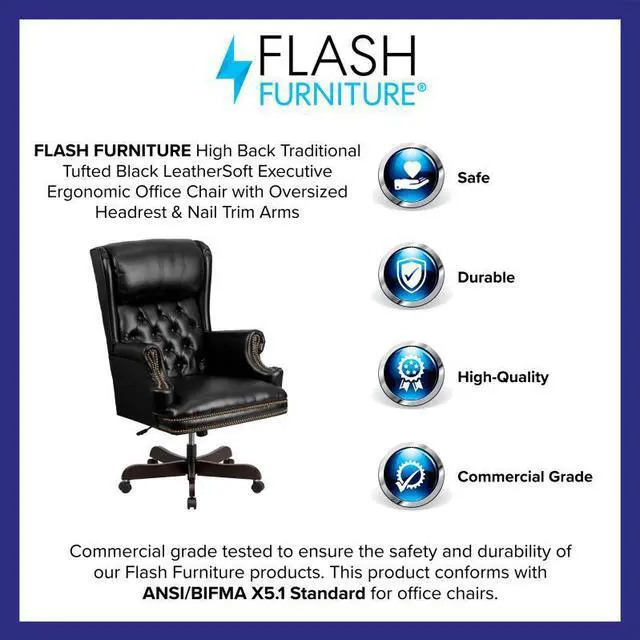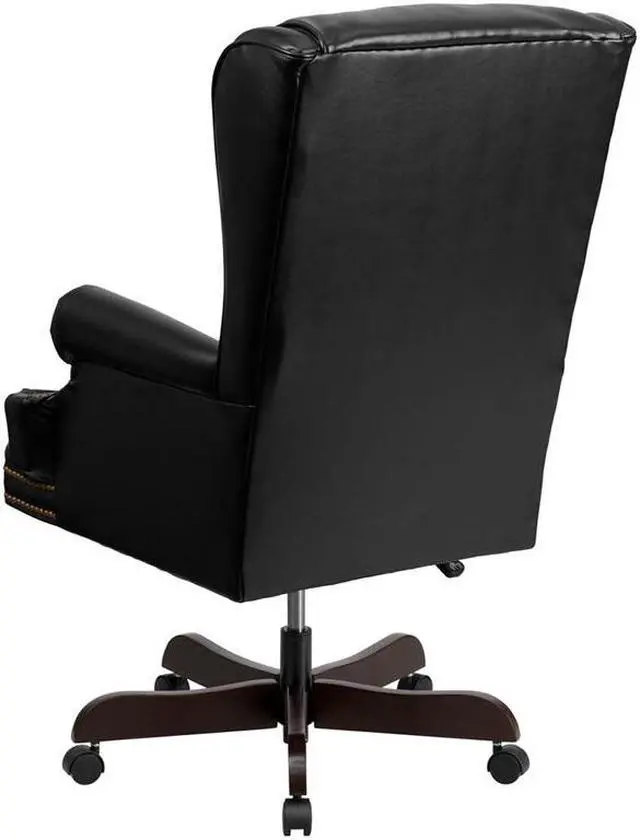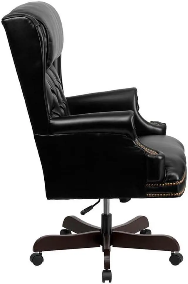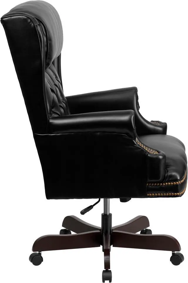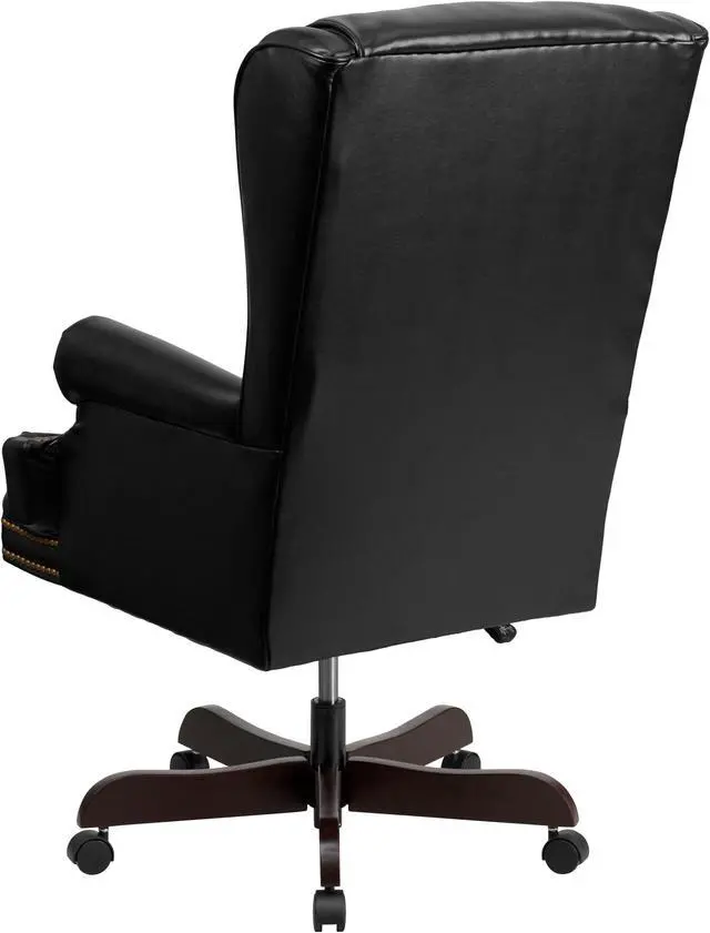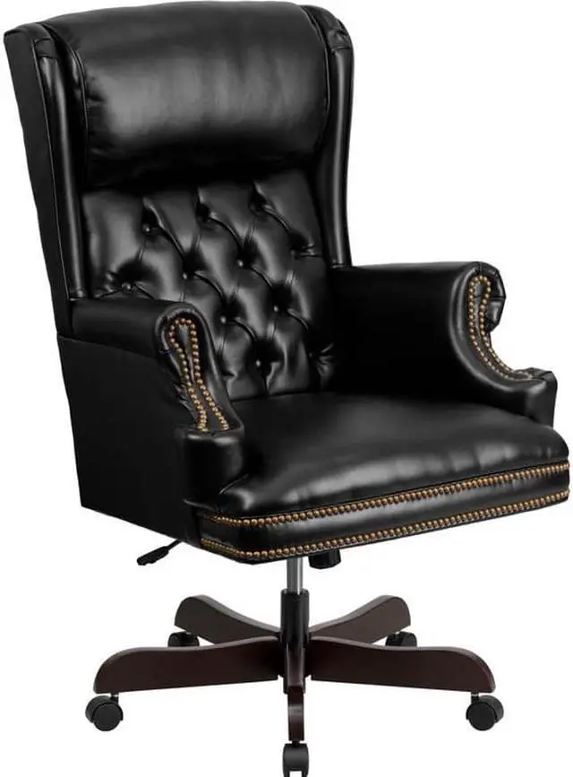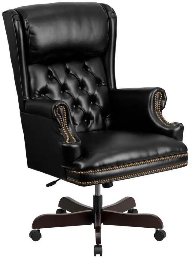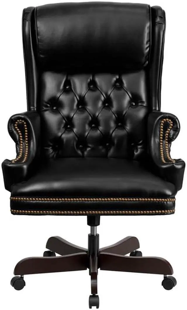 This button tufted black executive office chair combines old world craftsmanship with 21st century ergonomic seating principles, giving you a chair that feels as good as it looks. It redefines traditional elegance with its softer edges, subtle styling, and amazing comfort. The generously padded headrest will take the pressure off of your neck while leaning back. High back office chairs extend to the upper back for greater support and relieve tension in the lower back, preventing long term strain. Chair easily swivels 360 degrees to get the maximum use of your workspace without strain. The pneumatic adjustment lever will allow you to easily adjust the seat to your desired height. The rolled arms are adorned with individual brass nail trim. The heavy duty mahogany wood capped base adds to the traditional, elegant styling of this chair.Product Dimension-27"W x 32"D x 47.75" - 51"H