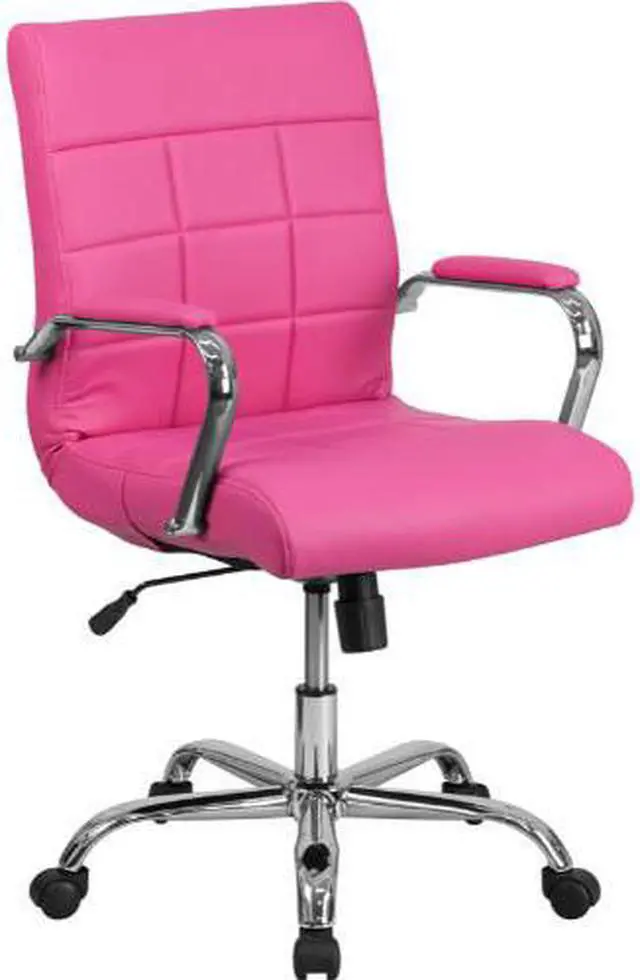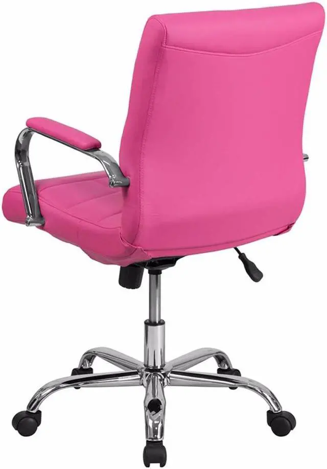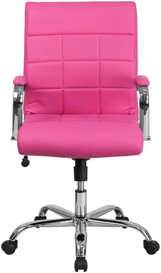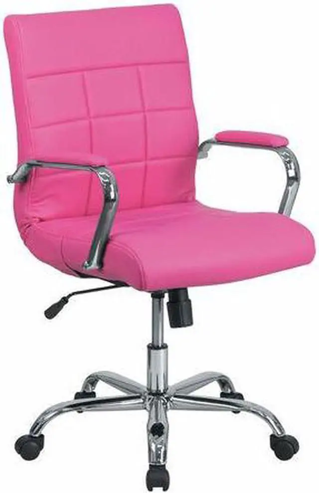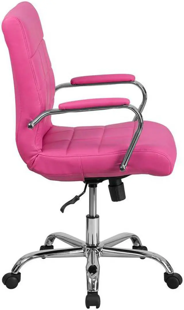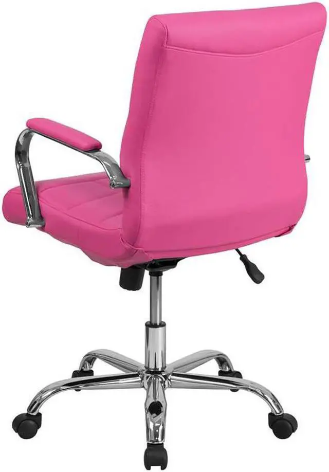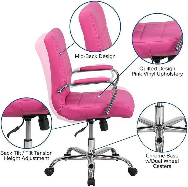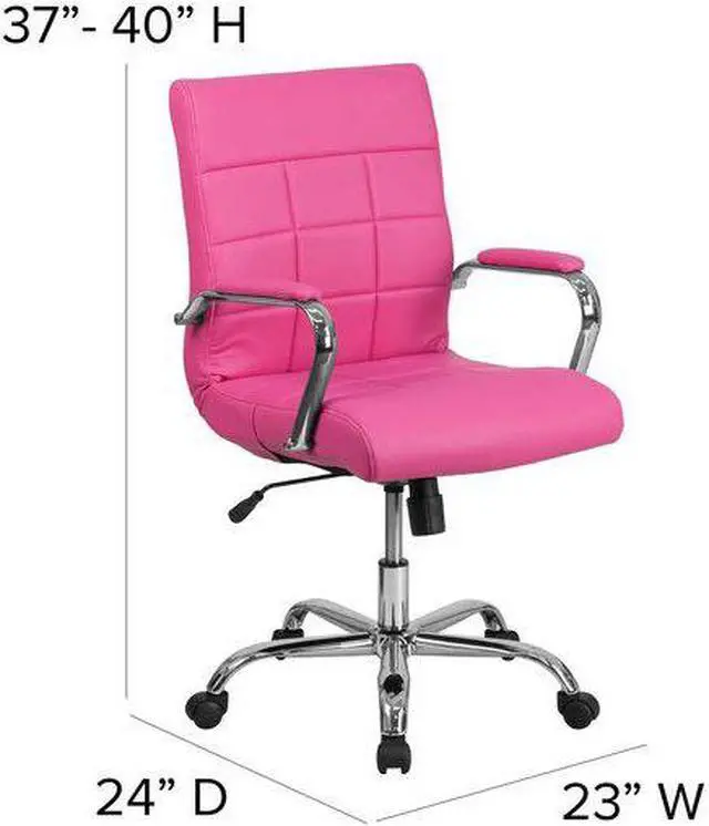 Brighten up your work space with this contemporary mid-back pink vinyl executive swivel office chair featuring designer quilted upholstery. This chair will not disappoint with adequate cushioning to keep you comfortable. The mid-back office chair offers support to the mid-to-upper back region. This chair is ideal for anyone who does a great deal of typing throughout the day and needs good back support. The tilt lock mechanism offers a comfortable rocking/reclining motion. The free rein motion is great for taking a quick break from typing to answer phone calls and relax. The waterfall front seat edge removes pressure from the lower legs and improves circulation. Chair easily swivels 360 degrees to get the maximum use of your workspace without strain. The pneumatic adjustment lever will allow you to easily adjust the seat to your desired height. The chrome base adds a stylish look to complement a contemporary office space.Product Dimension-23"W x 24"D x 37" - 40"H