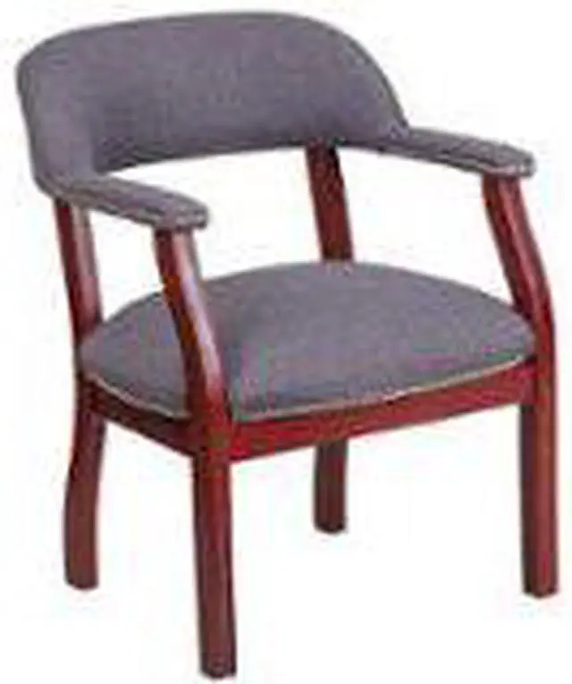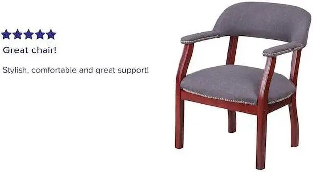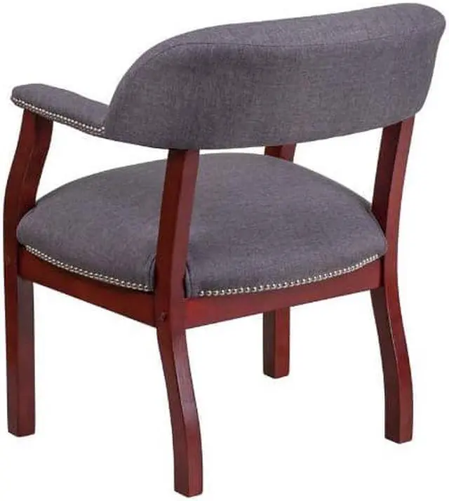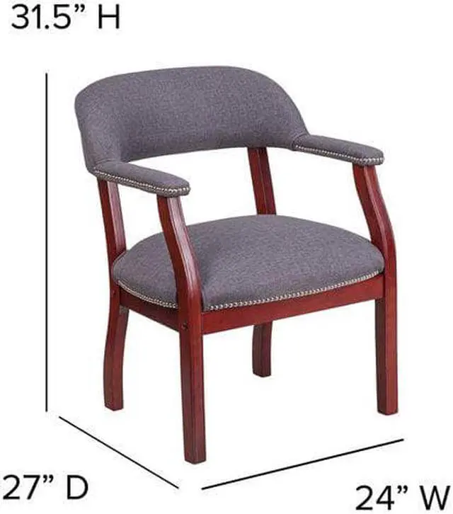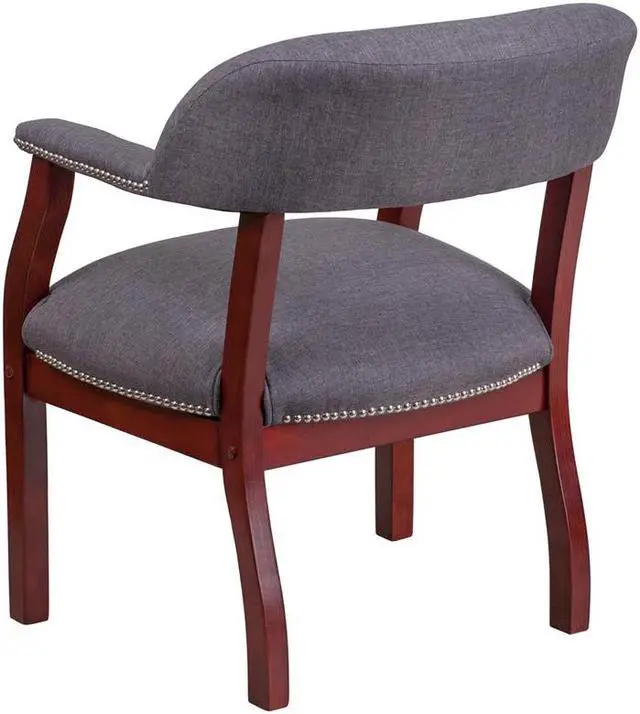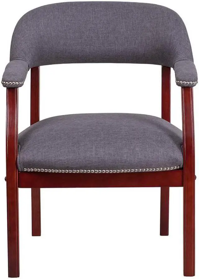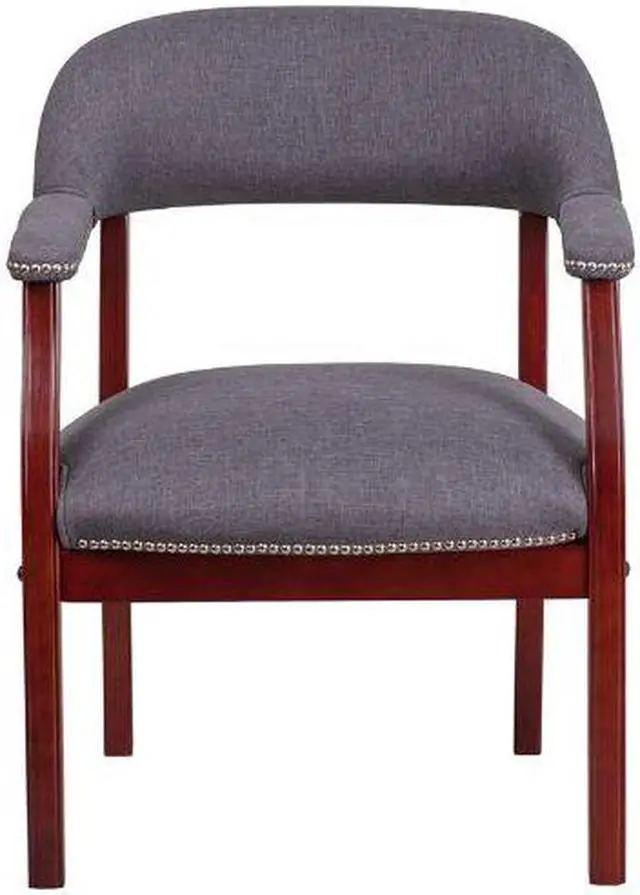 Add timeless charm to your space with this elegant reception/conference chair. This chair features gray fabric upholstery, contoured cushions and an open back design. Designed with upholstered straight arms and attractive silver nail accents, this chair adds a distinctive touch to any setting. For long-lasting performance, this conference chair is built with a sturdy hardwood frame. This chair will complement reception areas, libraries or your office as a guest chair.