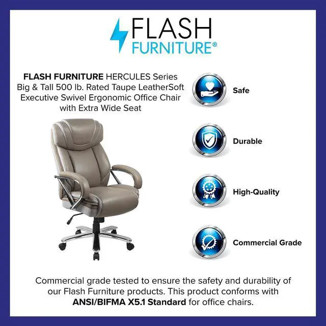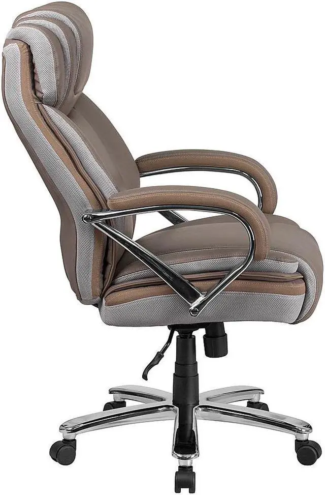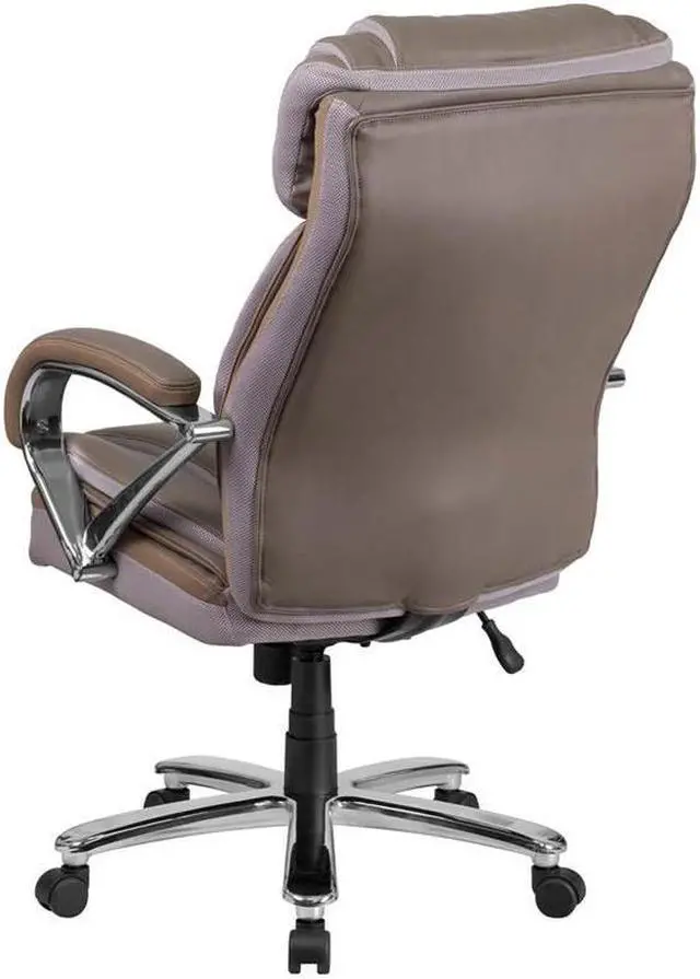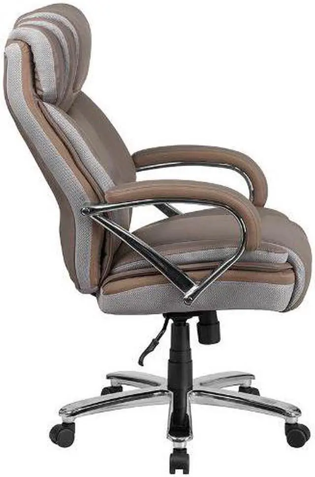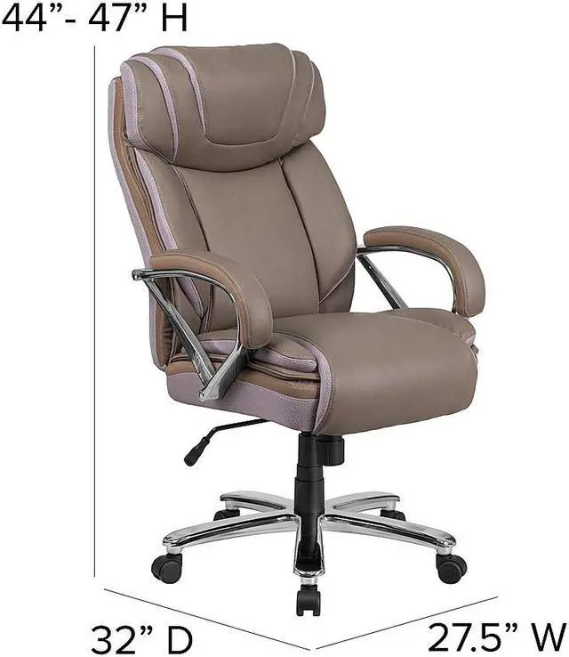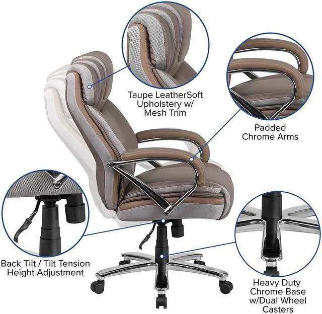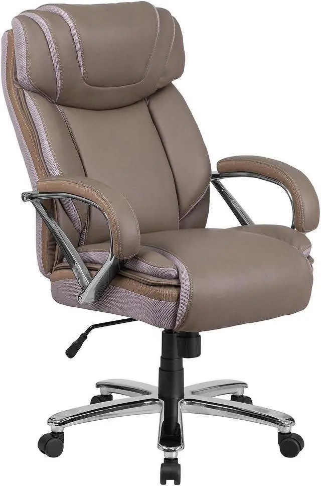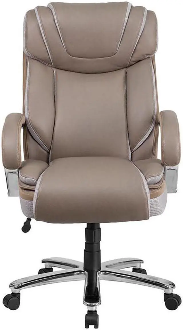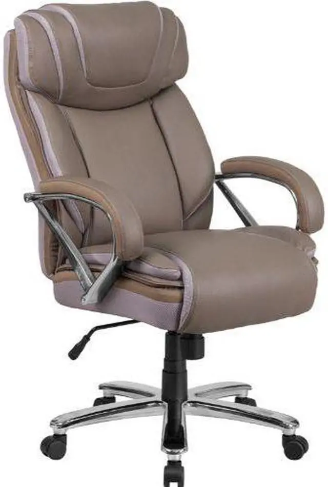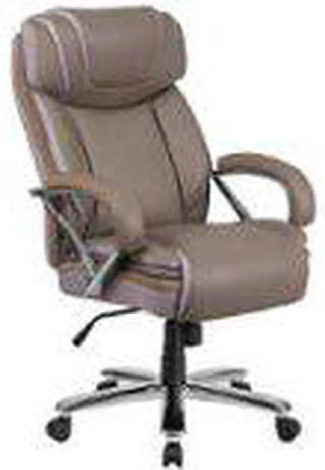 If your job or hobby requires you to sit for long stretches of time having the right chair is priceless. The thick, plush padding, taupe LeatherSoft upholstery and adjustable headrest featured in this Big Tall executive swivel office chair are a must have. Big Tall office chairs offer a broader seat and back width to accommodate larger and taller body types. This chair has been tested to hold a capacity of up to 500 lbs. High back office chairs extend to the upper back for greater support while the included headrest takes the pressure off of your neck while leaning back. The tilt lock mechanism offers a comfortable rocking/reclining motion. The waterfall front seat edge removes pressure from the lower legs. The pneumatic adjustment lever will allow you to easily adjust the swivel seat height. The chrome base adds a stylish look to complement a contemporary office space.