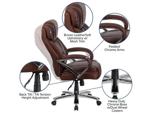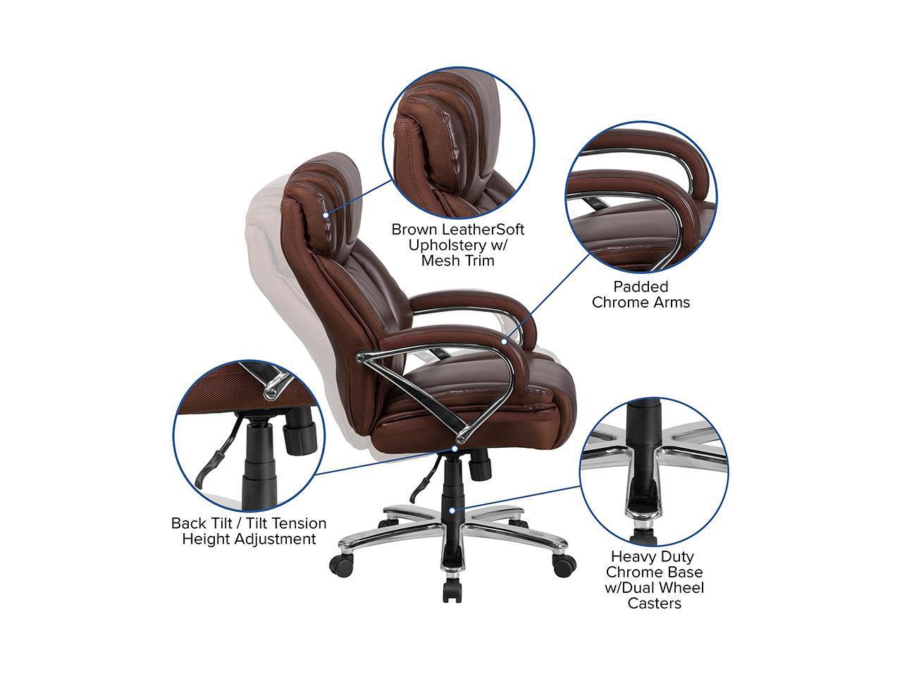 - High Back Design with Headrest Built-In Lumbar Support Tilt Lock Mechanism rocks/tilts the chair and locks in an upright position Tilt Tension Adjustment Knob adjusts the chair's backward tilt resistance 6" Thick Foam Padded Seat with CAL 117 Fire Retardant Foam Padded Chrome Arms 22" Wide Swivel Seat Pneumatic Seat Height Adjustment Contoured Back and Seat Waterfall Seat reduces pressure on your legs Heavy Duty Chrome Base Dual Wheel Casters LeatherSoft is leather and polyurethane for added Softness and Durability