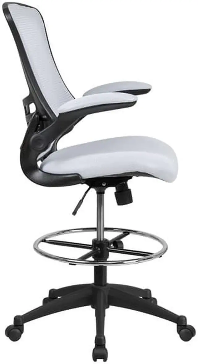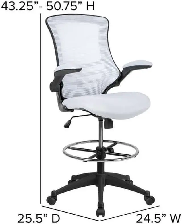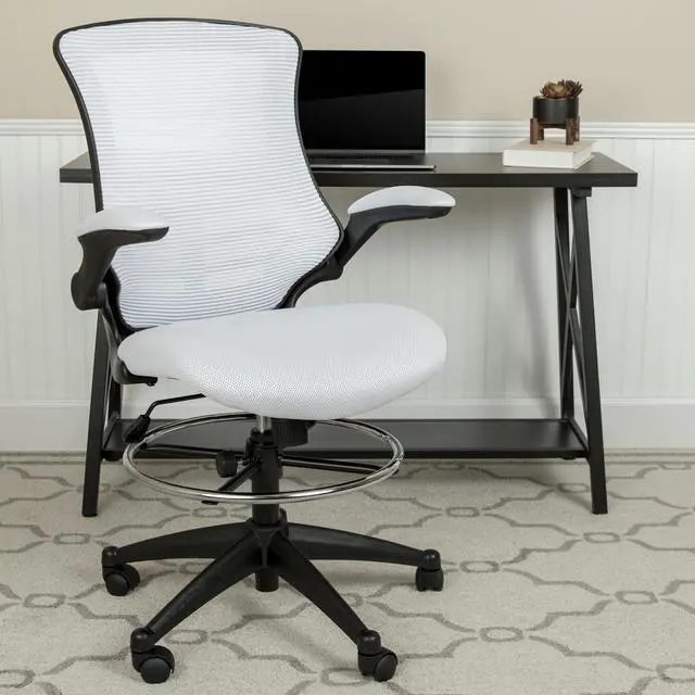 Whether you work from home or go into the office you will be comfortable with the Mid-Back White Mesh Ergonomic Drafting Chair with Adjustable Foot Ring and Flip-Up Arms. This tall task chair is the perfect height for sit-to-stand desks, standing desks, bar height tables and drafting tables. Enjoy the comforts of an ergonomic chair featuring a curved back with built-in lumbar support and a mesh back that will keep airflow circulating to keep you cool. Designed with your comfort in mind, this drafting stool has invaluable features: 360 degree swivel seat with comforting molded foam ~ pressure relieving waterfall edge ~ flip-up arms ~ tilt lock mechanism with variable tension control ~ height adjustable foot ring and dual wheel casters to roll across all flooring with ease. Draft chairs are essential for any profession where work surfaces are above standard height.
