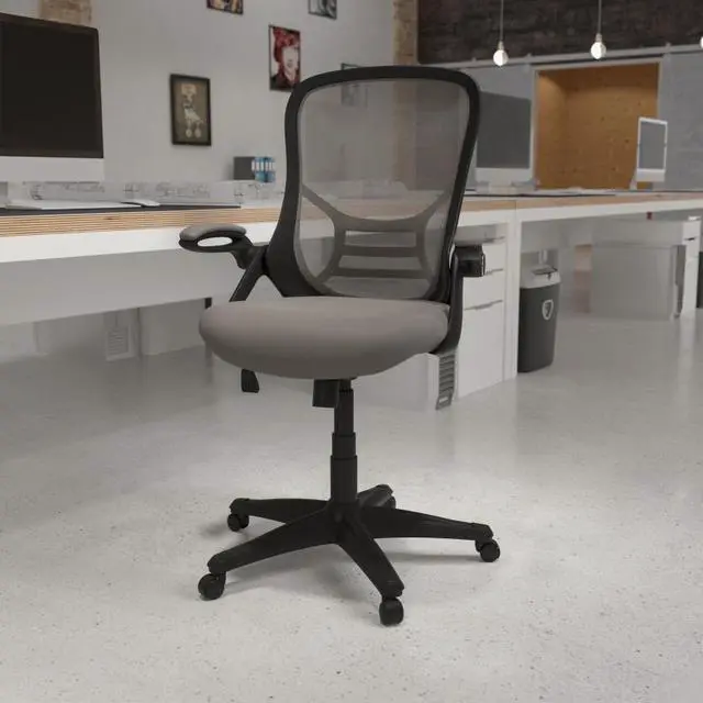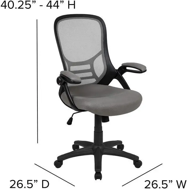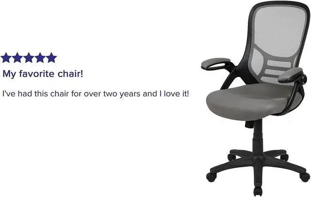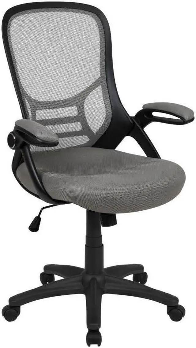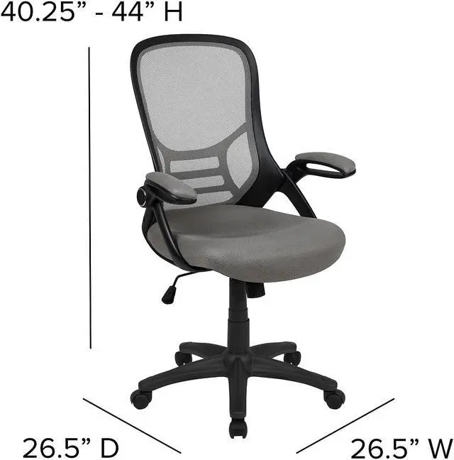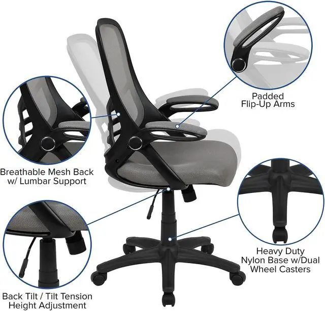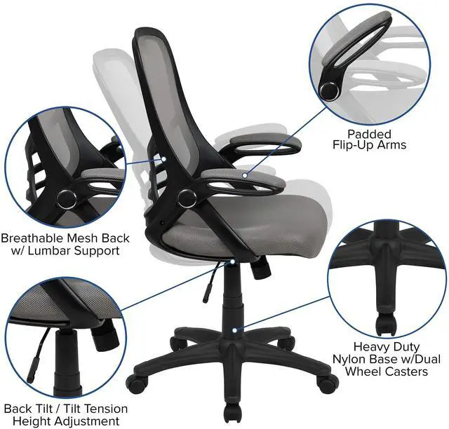 Whether working from home, refreshing your professional office space, or preparing for a marathon gaming session, having the support of an ergonomic chair with lumbar support will help increase productivity in all areas. The high mesh back is ventilated to allow air circulation while the ultra-padded, contoured seat, with mesh overlay, gives all day comfort. This office chair is equipped with flip up arms that can be used in the downward position or placed upright. Tilt lock and tilt tension functionality give a custom recline while the pneumatic seat height adjustment lever and 360° swivel adapts to almost any work surface. The 5-star base with dual casters enables you to move with minimal effort. Assembly of your new chair takes less than 30 minutes with the included materials and a solvent and water based cleaner such as foam will maintain the appearance of this computer desk chair.