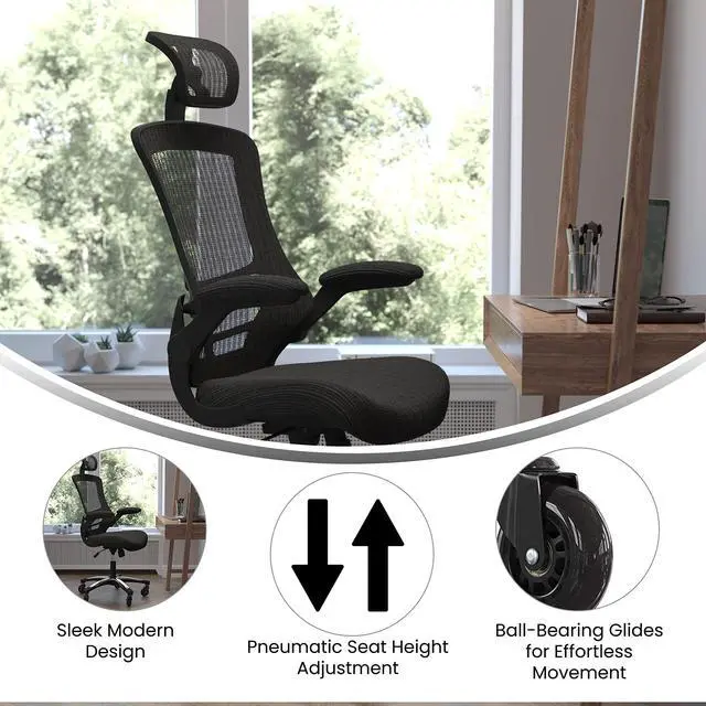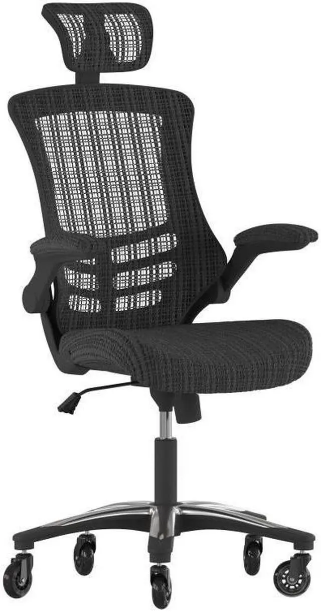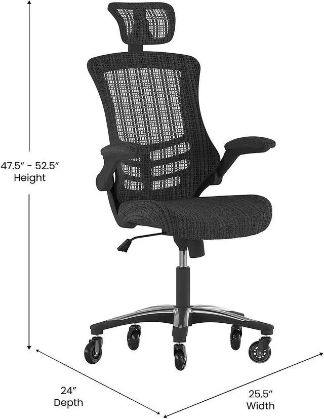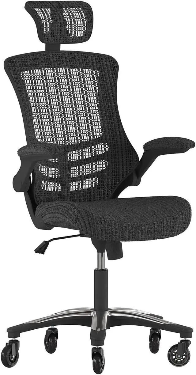 Let this comfortable desk chair with transparent skate style wheels lend a contemporary style to any space in your home or office. The thick-padded seat and ventilated mesh material allow air to circulate keeping you cool and comfortable. This swivel chair rotates 360 degrees and easily lowers and raises with a pneumatic seat height adjustment lever. Flip-up arms provide the option of an armless desk chair design ideal for work or gaming, while the swivel chair's adjustable headrest helps to support the neck. Designed to ensure extra comfort and support, our high-back executive office chair also features a waterfall seat edge made to remove pressure from the lower legs while improving circulation. Upgrade your work area with our high-back office chair featuring upgraded roller wheels, a contemporary design, and built-in lumbar support to help keep you productive and focused from task to task.