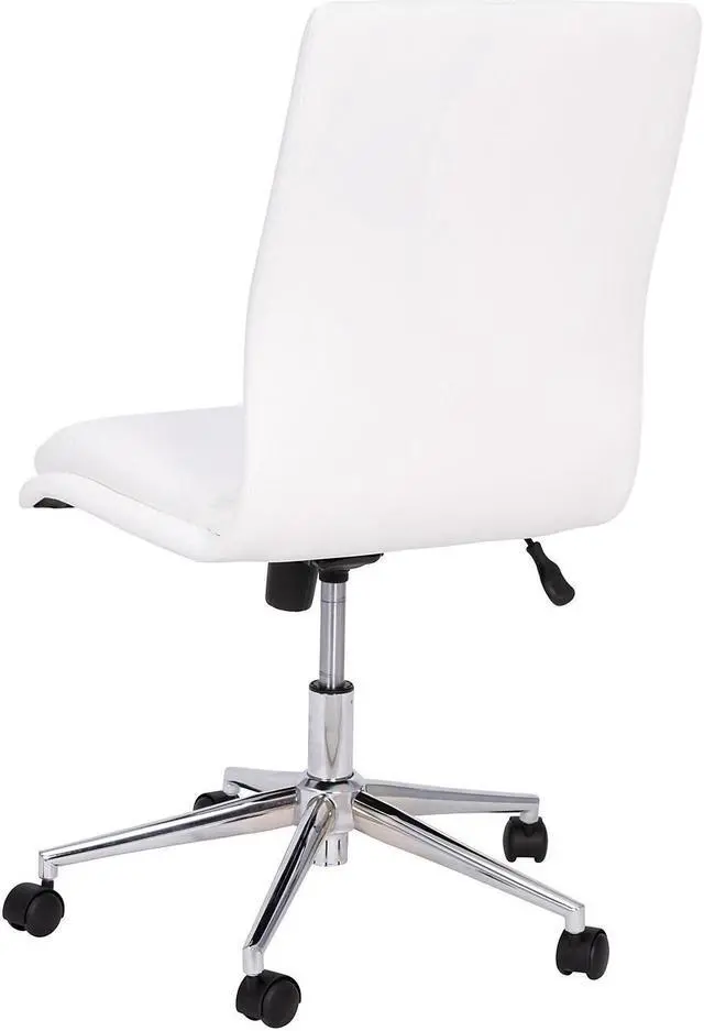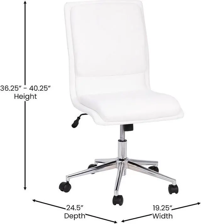 Fabulous form meets practical purpose in the elevated style of this mid-back office task chair. Plush foam padding is enveloped in luxurious LeatherSoft upholstery for an upmarket look in a commercial or home office. LeatherSoft is leather and polyurethane for added softness and durability. The armless design allows this chair to tuck beneath your desk. A solid wood seat and 5-star chrome base give a worry-free seating experience and hold up to 300 lbs. static weight while the 360° swivel feature, along with dual wheel casters, provides excellent mobility. Pneumatic seat height adjustment puts you at the perfect level to keep your feet flat on the floor. Super easy assembly will have your chair ready to go in under 10 minutes and a solvent-based cleaner will keep it looking brand new with no water needed. This swivel task chair is available in multiple colors to match any decor.