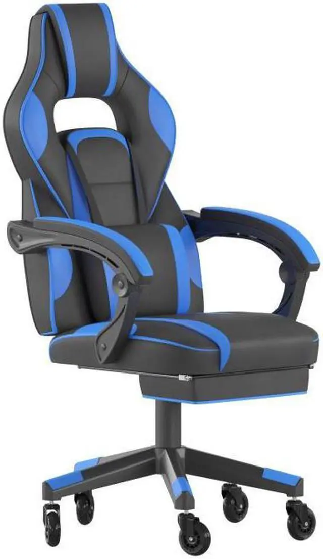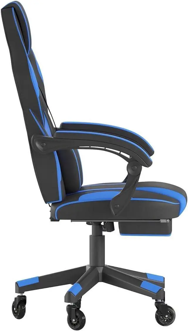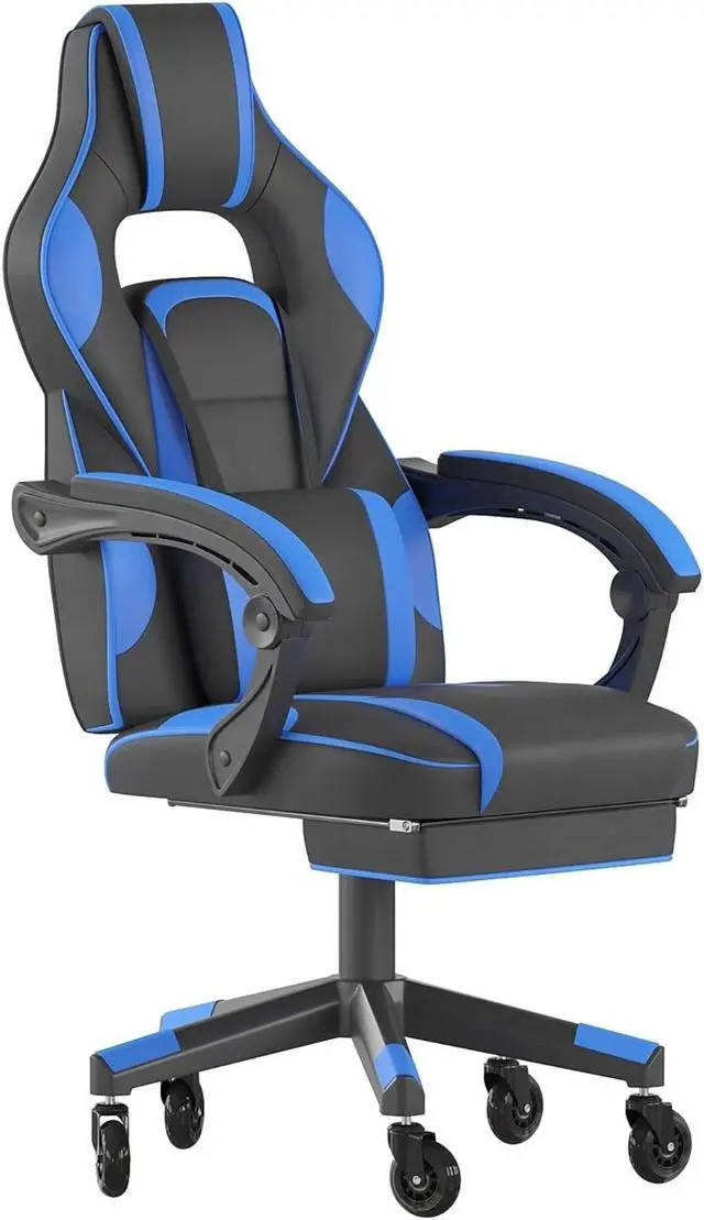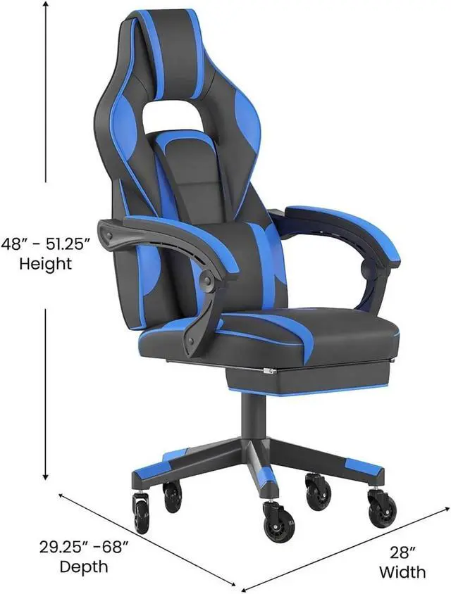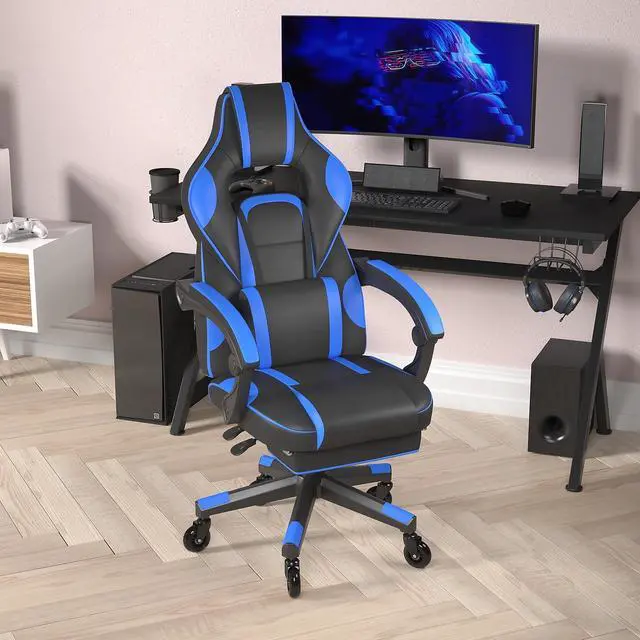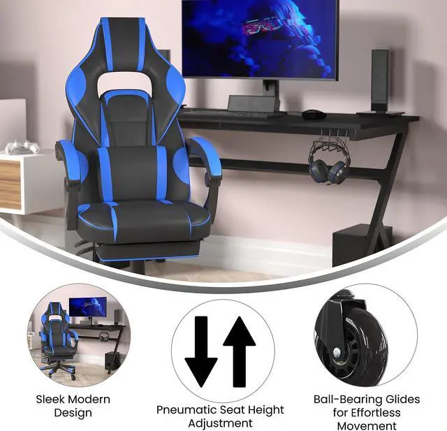 Take a ride in this thickly padded, reclining gaming chair with massaging lumbar and updated rubber ball-bearing skate style wheels that will take your work, and play, to the next level. This cool looking game chair has a removable lumbar pillow to support your lower back and massage those tense muscles when you plug in the attached 3 ft. USB cord. When you need a breather, recline this high back chair 95° ~ 175°. The arms actually recline along with the back to keep you comfortable. Pull the loop to slide out the footrest, flip it up and take a quick power nap to recharge. Video game chairs are designed specifically for gamers comfort but will make an excellent ergonomic chair for the office, dorm room, or home office. Get the ultimate gaming experience when you add our gaming desk with cup holder, headphone hook, and monitor/smartphone stand.