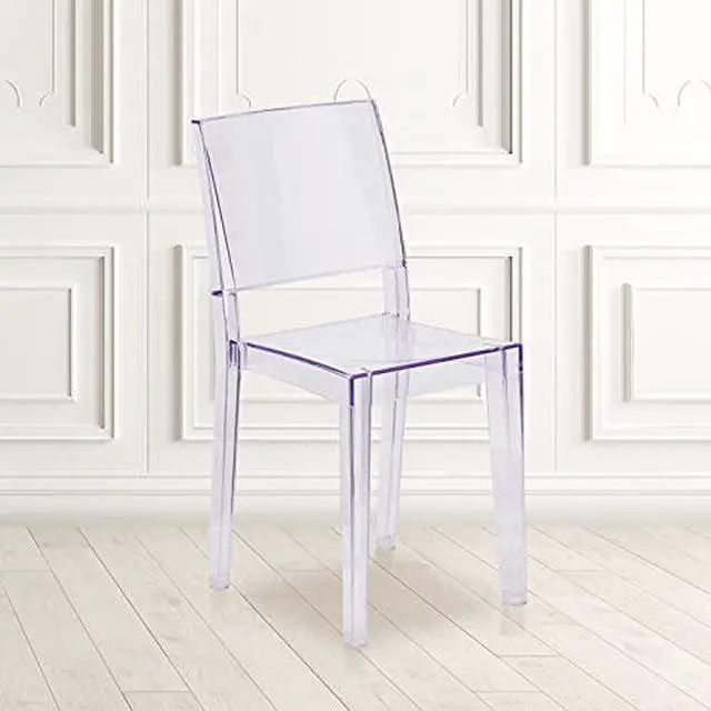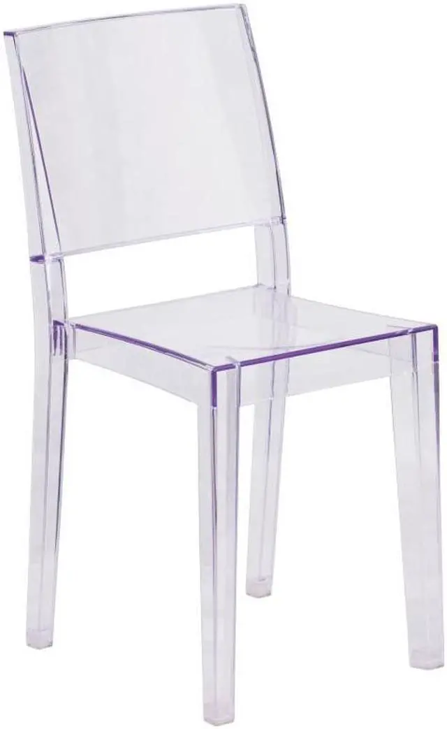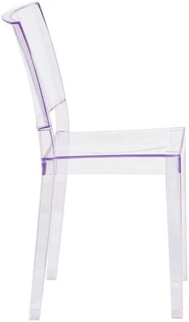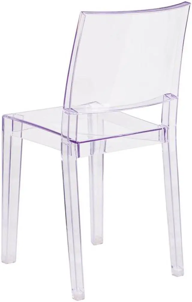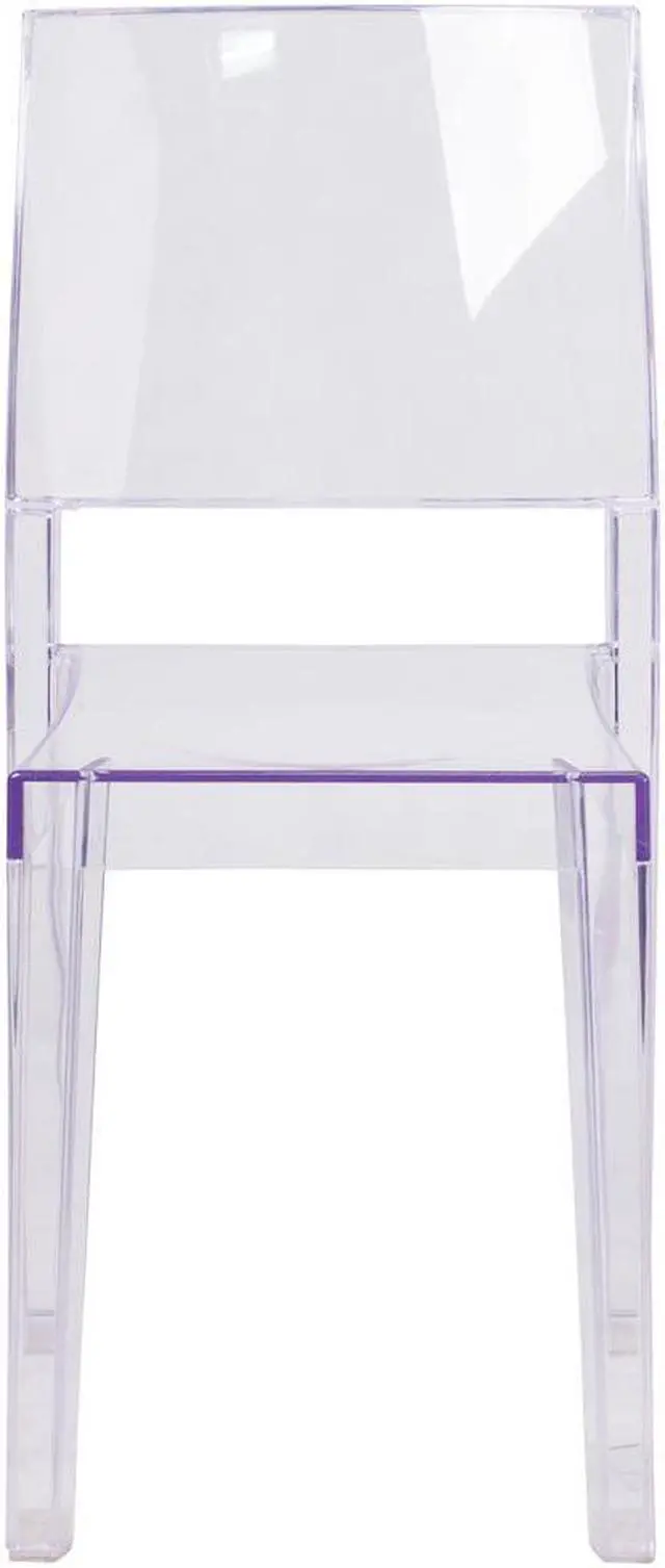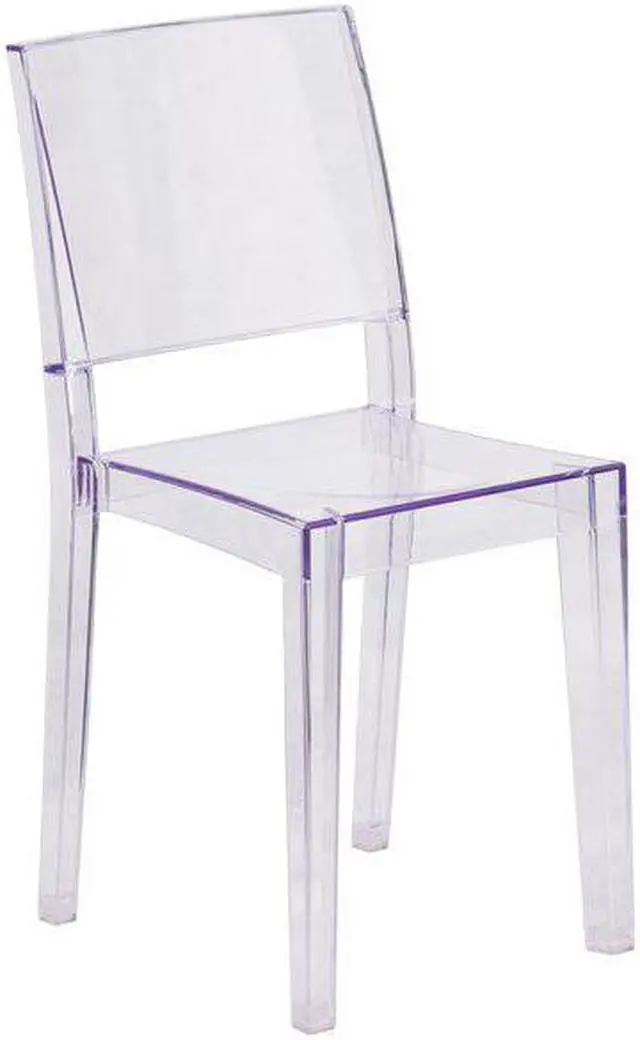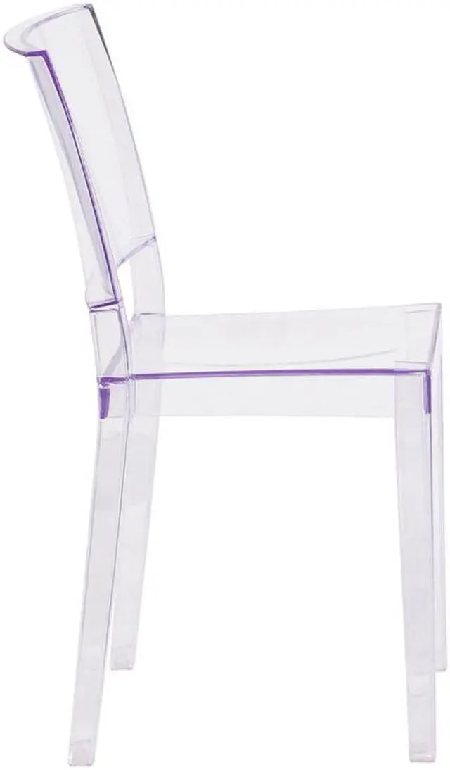 Whether your style is minimalist, modern or classic, you can create a beautifully artistic look with this clear accent side chair. This transparent armless chair lightens up a room by taking up less visual space making it a perfect choice for small spaces. This versatile chair can be used as a blank slate or dressed up with different textiles. Crafted from polycarbonate, this chair is an ingenious combination of lightness and strength. Floor protector rubber glides will protect your flooring when you need to slide the chair. This elegantly designed chair can be used in diverse environments, both indoor and outdoor, and stacks up to 8 high allowing for space-efficient storage.