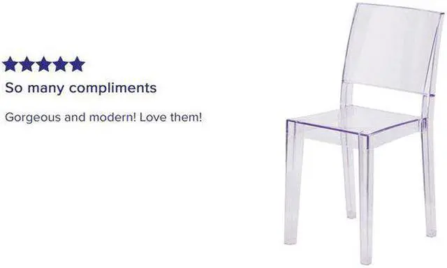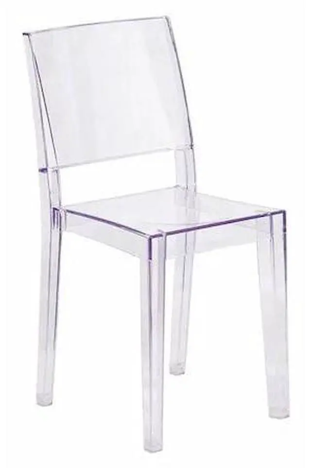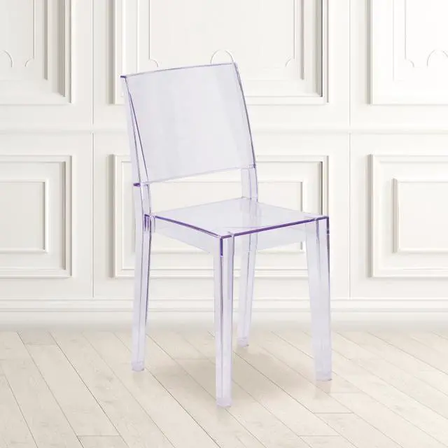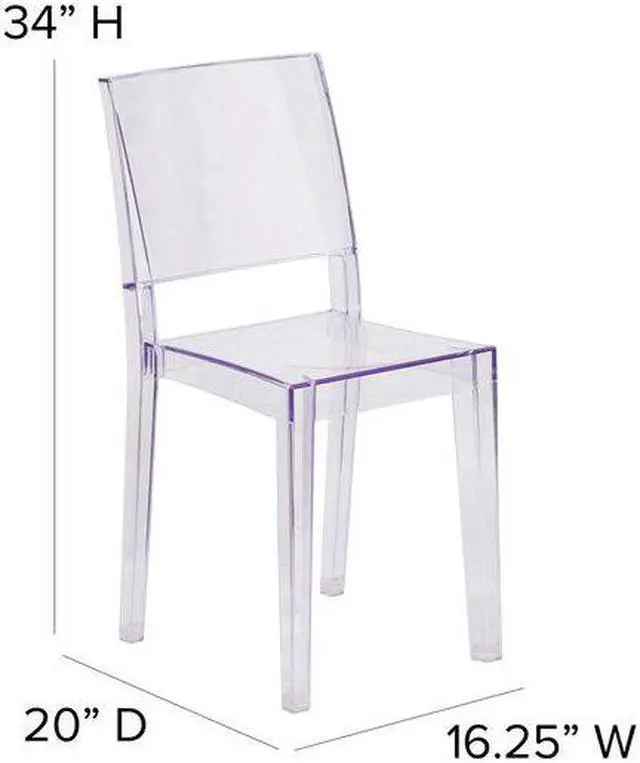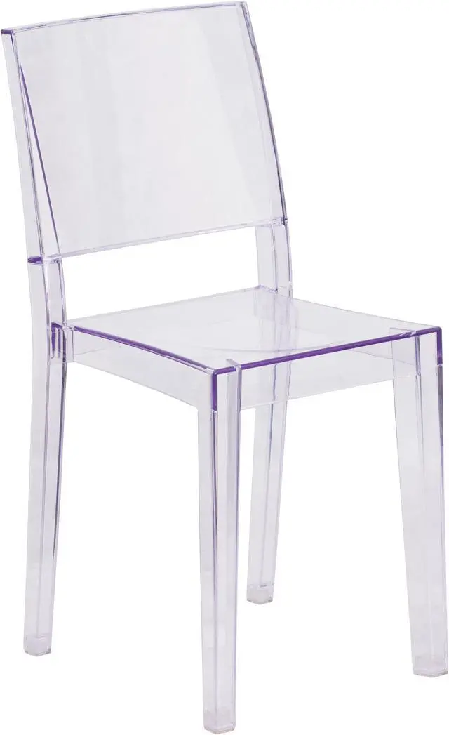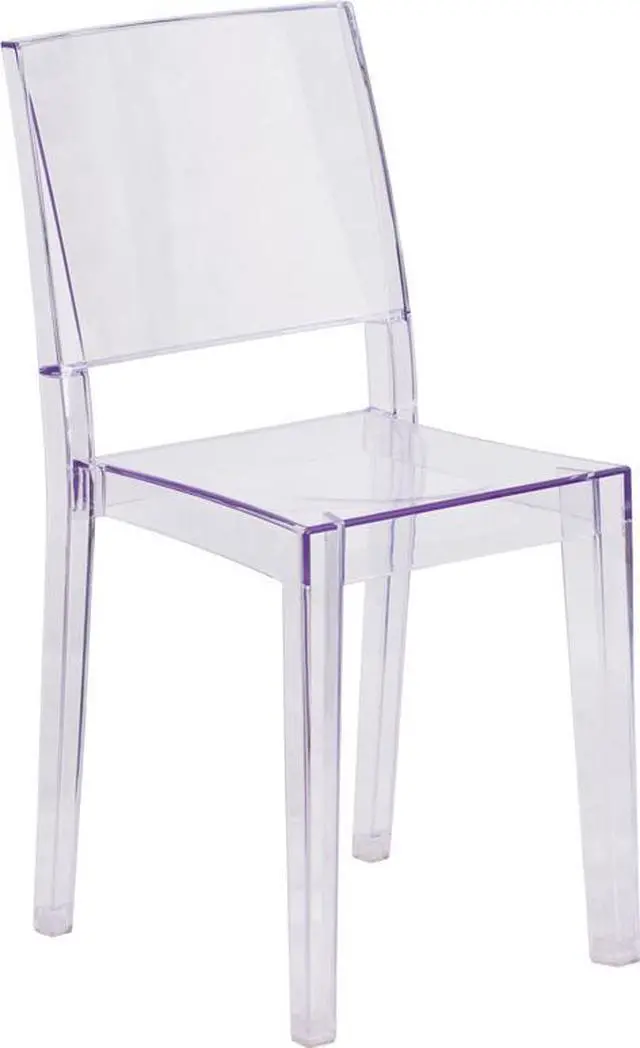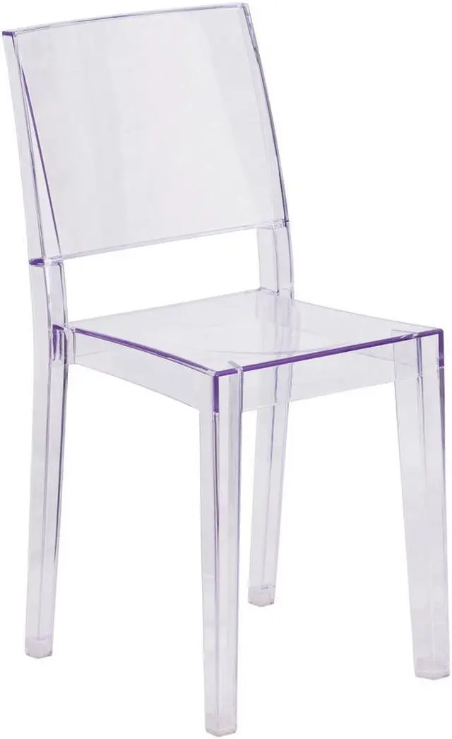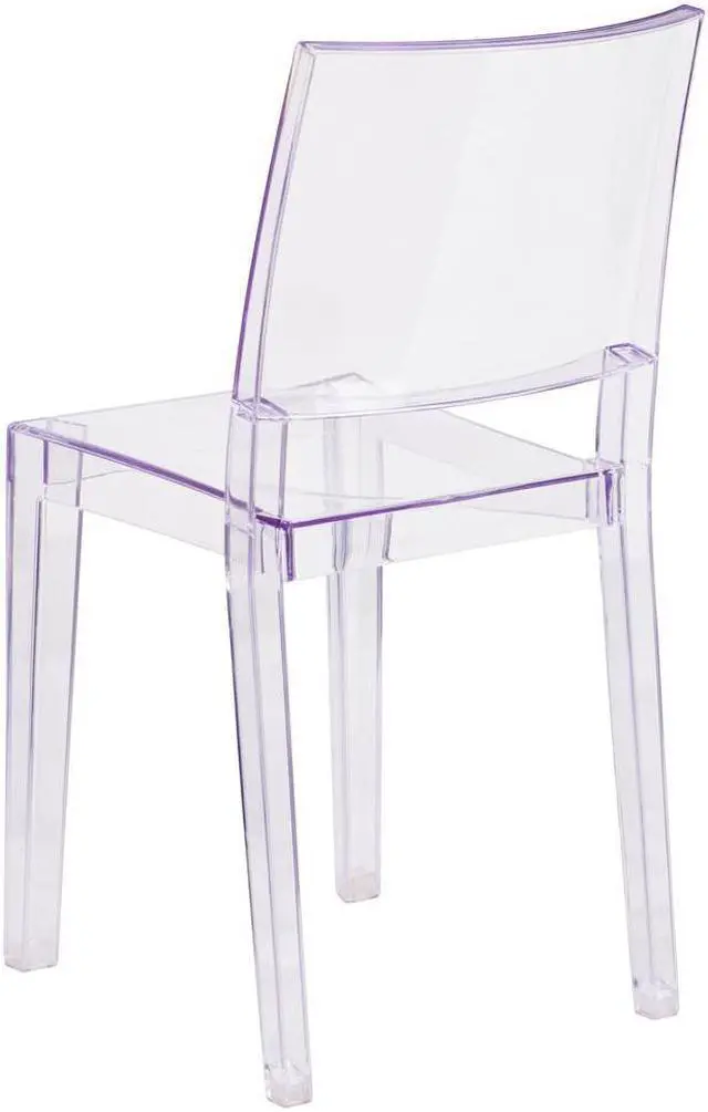 Whether your style is minimalist, modern or classic, you can create a beautifully artistic look with this clear accent side chair. This transparent armless chair lightens up a room by taking up less visual space making it a perfect choice for small spaces. This versatile chair can be used as a blank slate or dressed up with different textiles. Crafted from polycarbonate, this chair is an ingenious combination of lightness and strength. Floor protector rubber glides will protect your flooring when you need to slide the chair. This elegantly designed chair can be used in diverse environments, both indoor and outdoor, and stacks up to 8 high allowing for space-efficient storage.