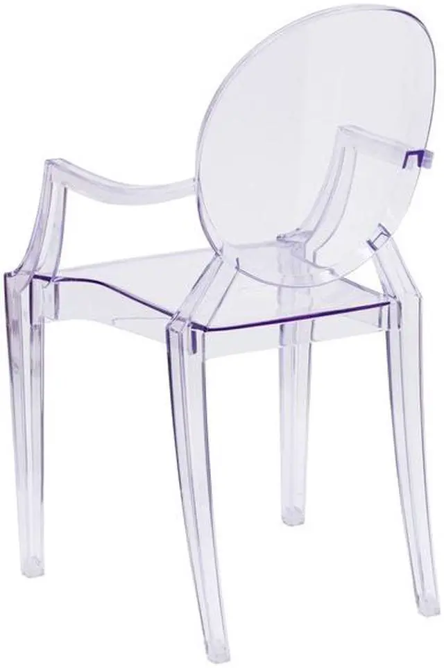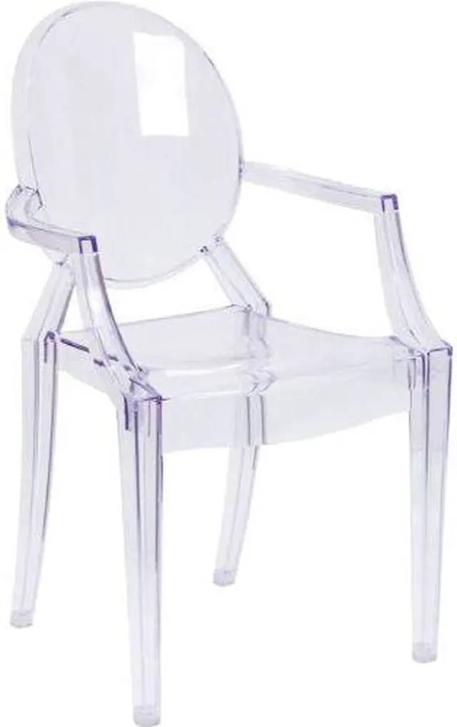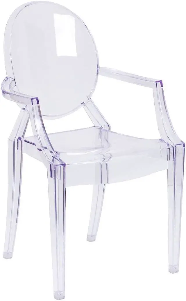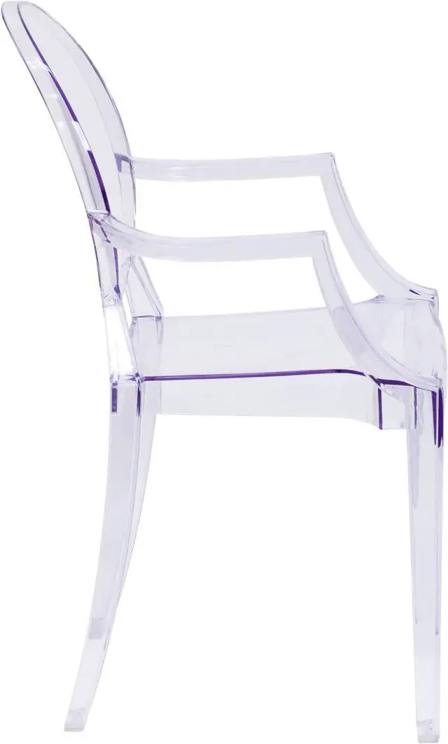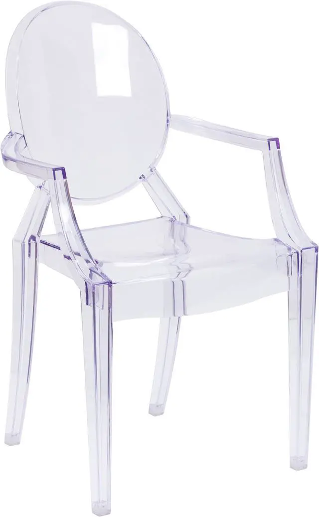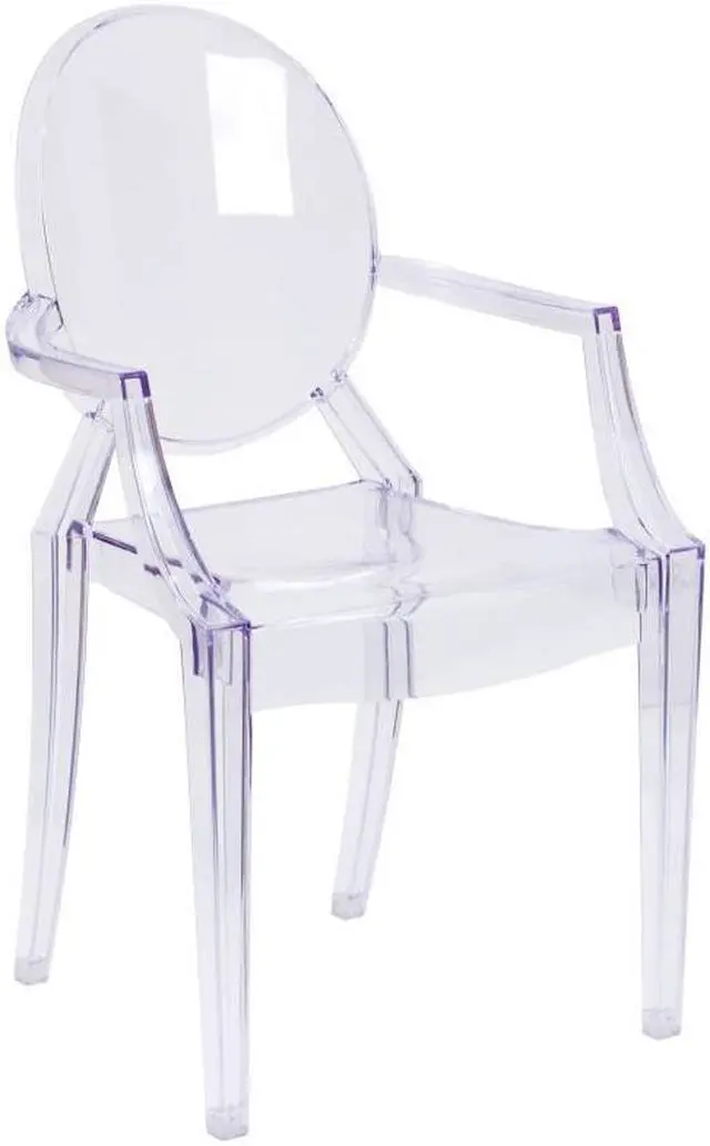 If you love to move your furniture around with the change of seasons, or just the change in your mood, then this ghost chair with arms is a great choice. The transparent ghost chair brings fluid design, elegance and function to your home, restaurant and special events. This modern chair with its Louis XVI styling and near invisibility won't get in the way of your artwork and other furniture pieces, lightens a crowded space and can make a small room appear larger. Curved arms and a contoured seat make this chair comfortable and its polycarbonate molded structure makes it shock, scratch and water resistant.