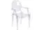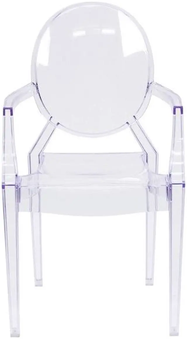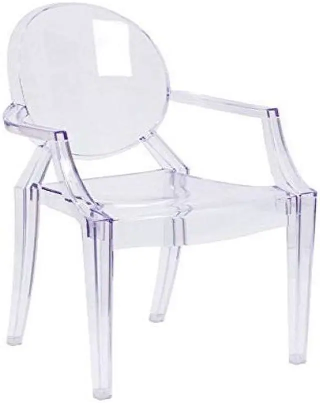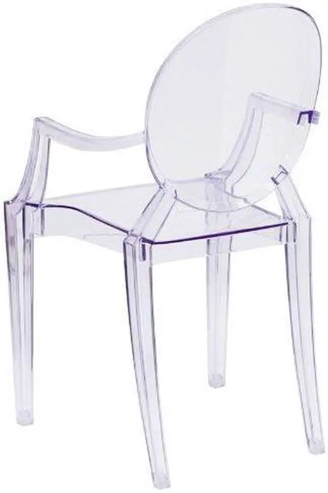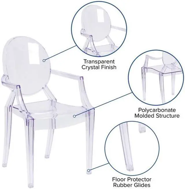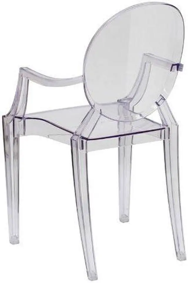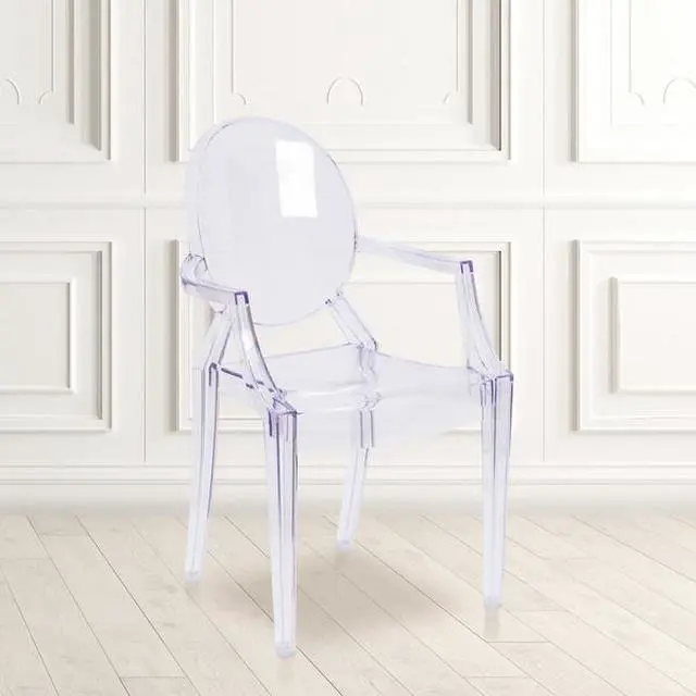 If you love to move your furniture around with the change of seasons, or just the change in your mood, then this ghost chair with arms is a great choice. The transparent ghost chair brings fluid design, elegance and function to your home, restaurant and special events. This modern chair with its Louis XVI styling and near invisibility won't get in the way of your artwork and other furniture pieces, lightens a crowded space and can make a small room appear larger. Curved arms and a contoured seat make this chair comfortable and its polycarbonate molded structure makes it shock, scratch and water resistant.