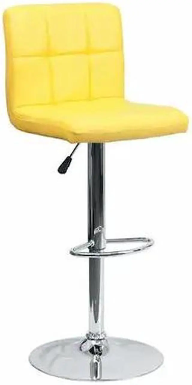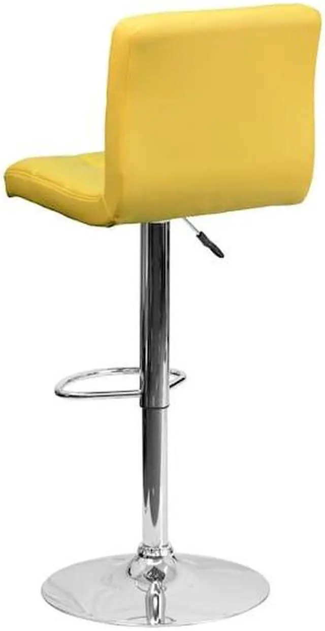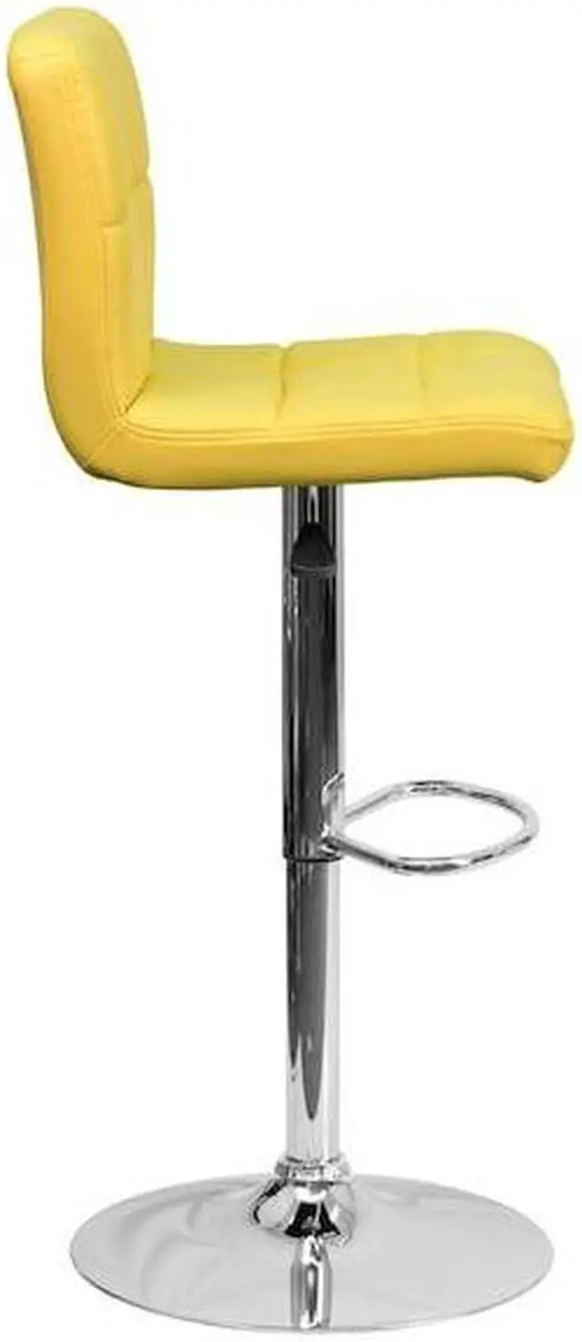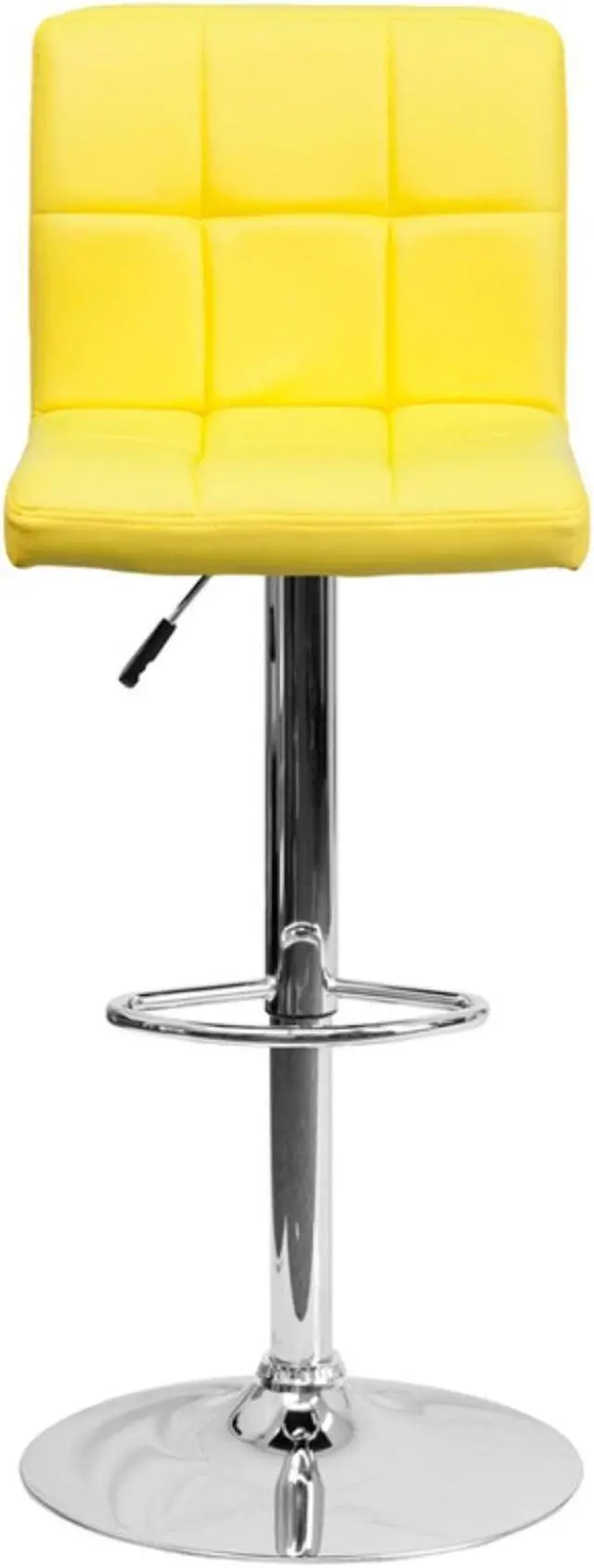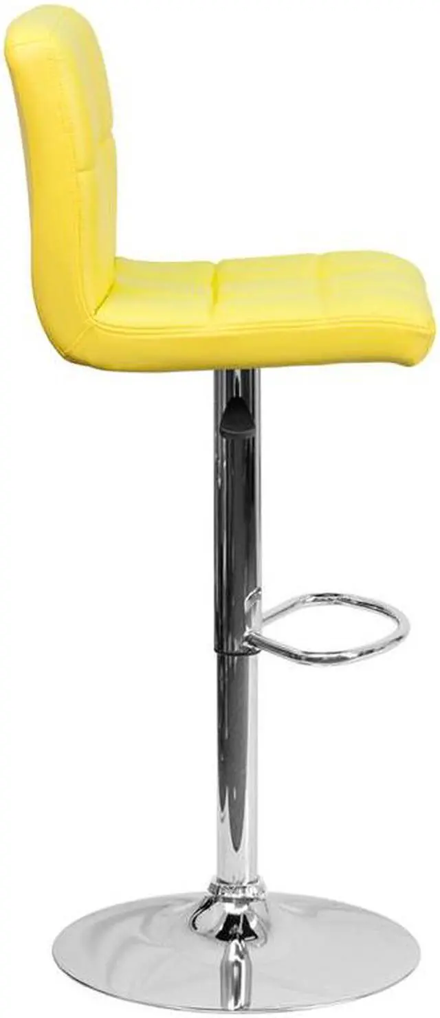 Let the plush quilted design of this this yellow adjustable height barstool cradle you in comfort. The simple design allows it to seamlessly accent any area in the home. The easy to clean vinyl upholstery is an added bonus when stool is used regularly. The height adjustable swivel seat adjusts from counter to bar height with the handle located below the seat. The chrome footrest supports your feet and relieves pressure from your legs while also providing a contemporary chic design. To help protect your floors, the base features an embedded plastic ring.