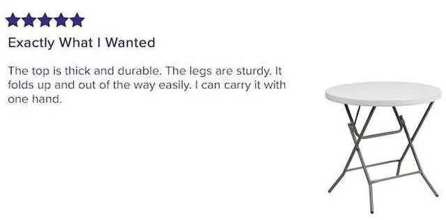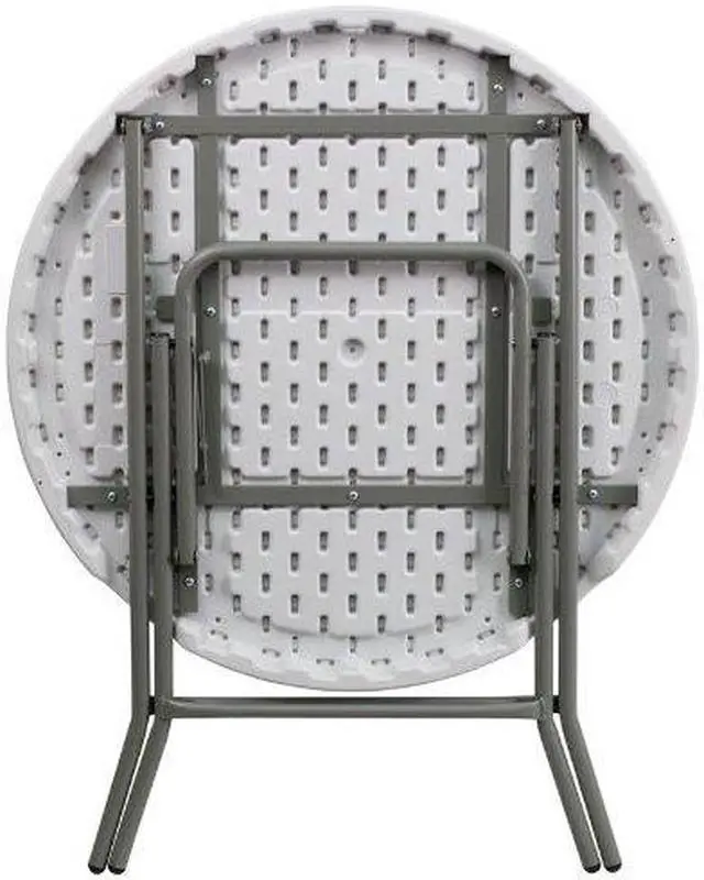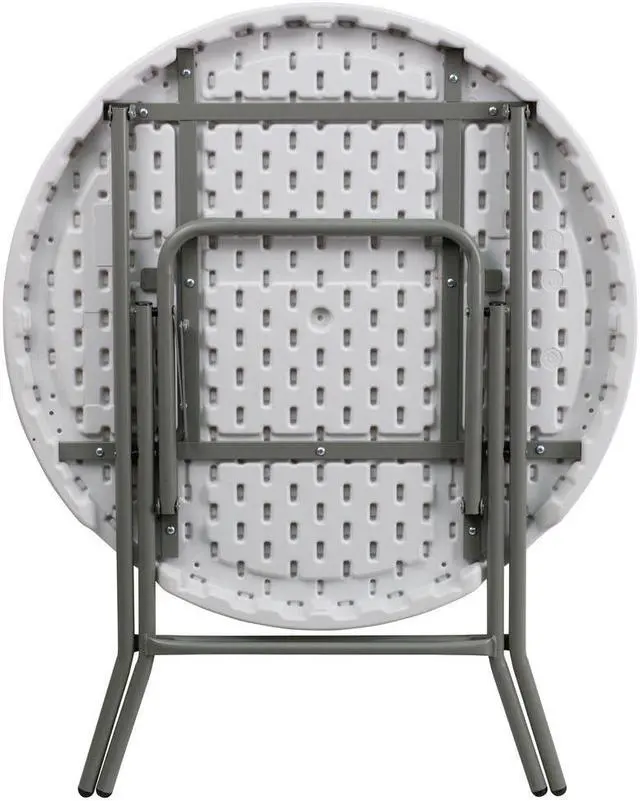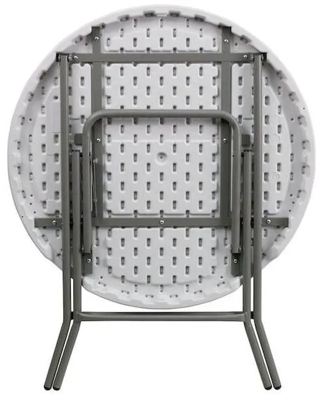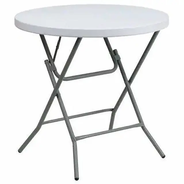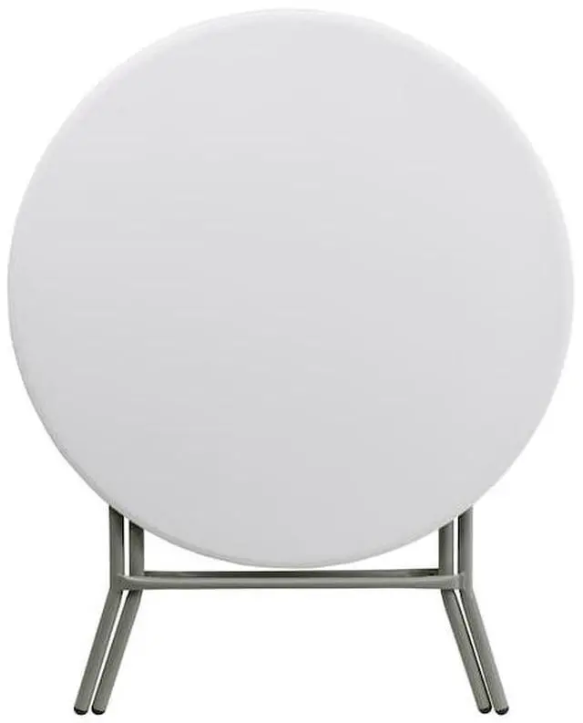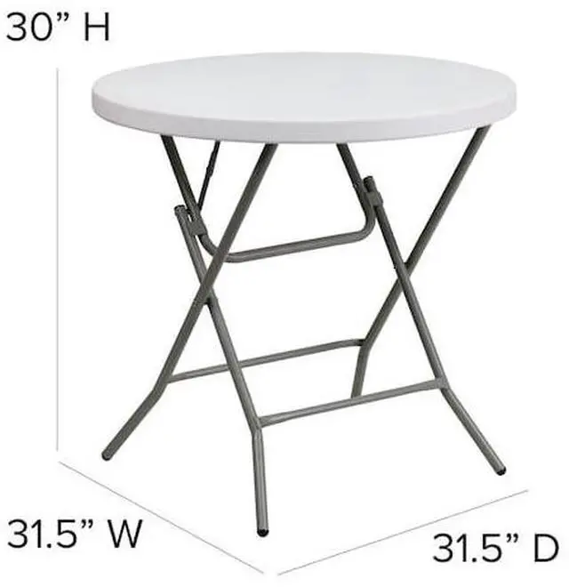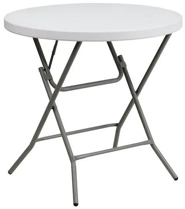 When you need a little extra surface area this folding table is the perfect choice. This plastic folding table is a convenient option when you need to set up tables for special events, cook-outs on your patio at home or when you're serving snacks around the pool. This durable, easy to clean table is commercial rated for use in banquet halls, convention centers and at trade shows. The thick, granite white tabletop is 1.75" thick, and will comfortably seat up to 3 adults. Its waterproof, impact and stain resistant top have a 220 pound static load capacity. Non-Locking gray powder coated cross legs fold to transport and store. Non-marring floor caps protect your floor by sliding smoothly when you need to move it. The 32" Round Granite White Plastic Folding Table is a convenient option for your next home, school or business event. Designed for both indoor and outdoor use, store table indoors and protect the frame from extreme moisture.