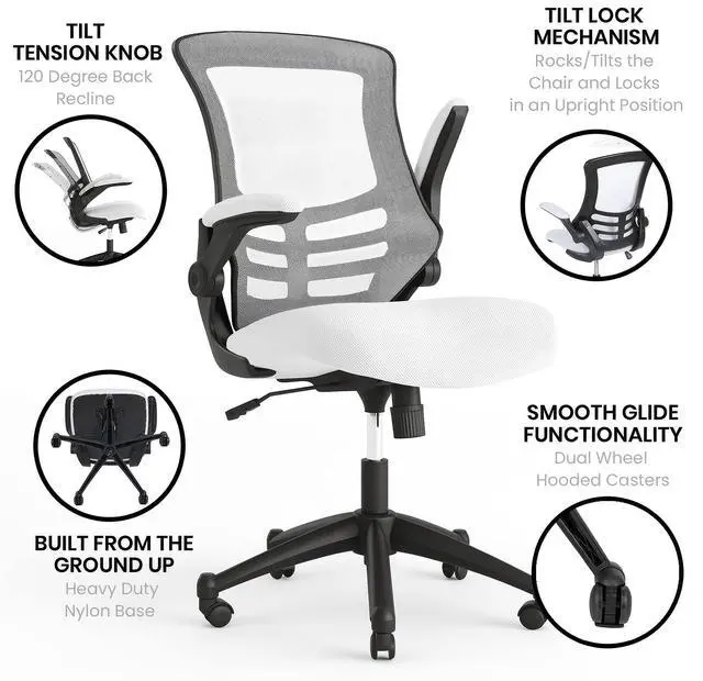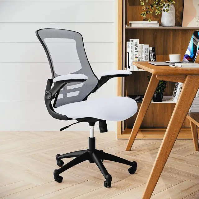 You say that you want comfort and style in your next office chair, this mesh back swivel ergonomic task office chair will exceed your needs. Beat those hot summer days with the ventilated mesh back behind you, offering up huge airflow. The curved backrest has lower lumbar support to provide you with good posture support. This well-built ergonomic office chair with flip-up arms provide relief to your shoulders and neck but is also great for users who prefer an armless design. Flip-up arms allow you to roll your chair underneath the desk without adjusting the seat height. Adjusting the seat height is easy with the pneumatic lever. Turn the tilt tension adjustment knob underneath the seat to increase or decrease the amount of force needed to rock or recline. Meeting deadlines, casual chats with colleagues and internet browsing are made easy on this contemporary swivel office chair.