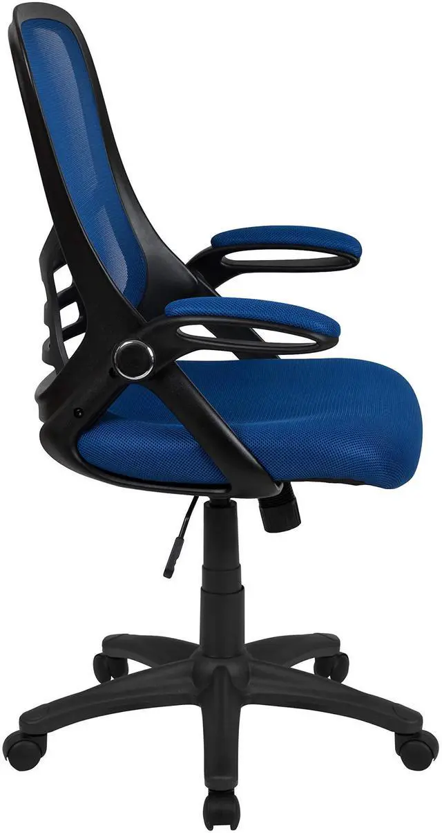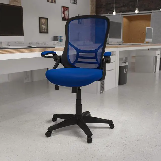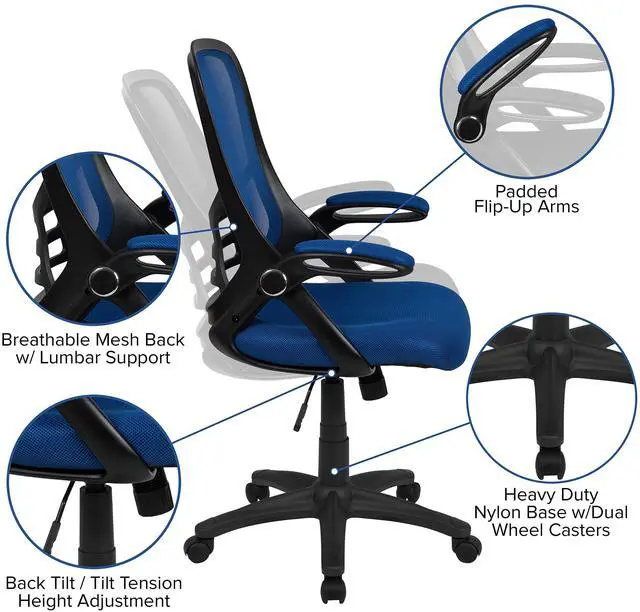 Whether working from home, refreshing your professional office space, or preparing for a marathon gaming session, having the support of an ergonomic chair with lumbar support will help increase productivity in all areas. The high mesh back is ventilated to allow air circulation while the ultra-padded, contoured seat, with mesh overlay, gives all day comfort. This office chair is equipped with flip up arms that can be used in the downward position or placed upright. Tilt lock and tilt tension functionality give a custom recline while the pneumatic seat height adjustment lever and 360° swivel adapts to almost any work surface. The 5-star base with dual casters enables you to move with minimal effort. Assembly of your new chair takes less than 30 minutes with the included materials and a solvent and water based cleaner such as foam will maintain the appearance of this computer desk chair.