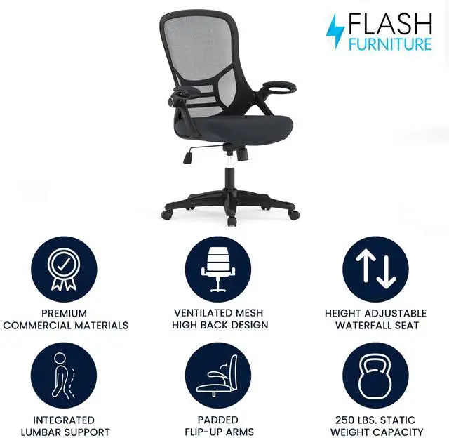 Whether working from home, refreshing your professional office space, or preparing for a marathon gaming session, having the support of an ergonomic chair with lumbar support will help increase productivity in all areas. The high mesh back is ventilated to allow air circulation while the ultra-padded, contoured seat, with mesh overlay, gives all day comfort. This office chair is equipped with flip up arms that can be used in the downward position or placed upright. Tilt lock and tilt tension functionality give a custom recline while the pneumatic seat height adjustment lever and 360° swivel adapts to almost any work surface. The 5-star base with dual casters enables you to move with minimal effort. Assembly of your new chair takes less than 30 minutes with the included materials and a solvent and water based cleaner such as foam will maintain the appearance of this computer desk chair.